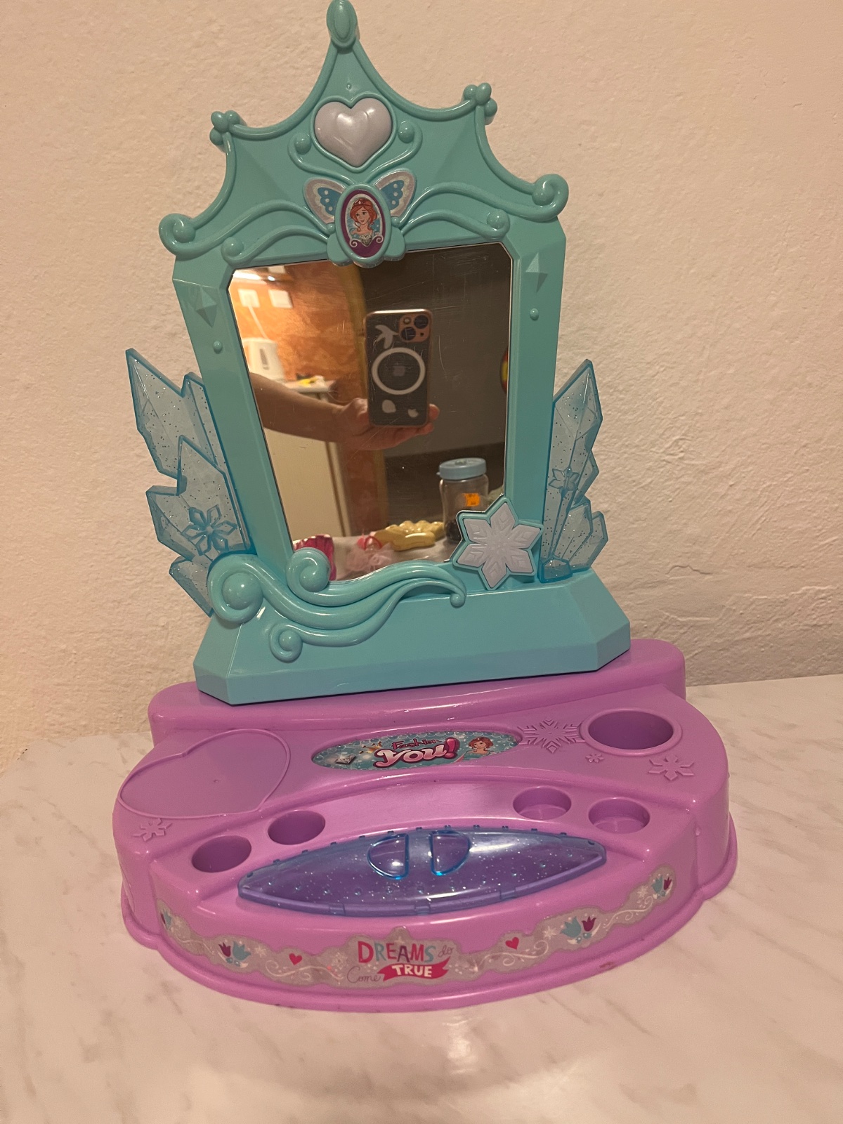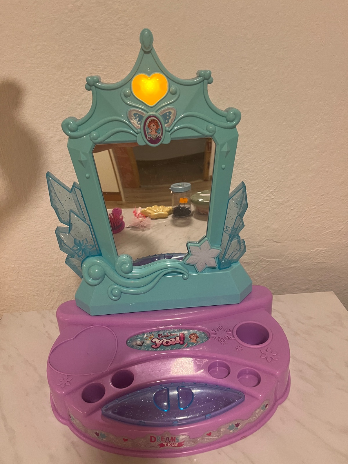Predam zrkadielko kozmetický stolík pre malu princeznu.po stlaceni srdiecka svieti a vydava zvuk. Da sa kdekolvek polozit a mala slecna sa tak moze kdekolvek upravit. Cena 4 eur + posta