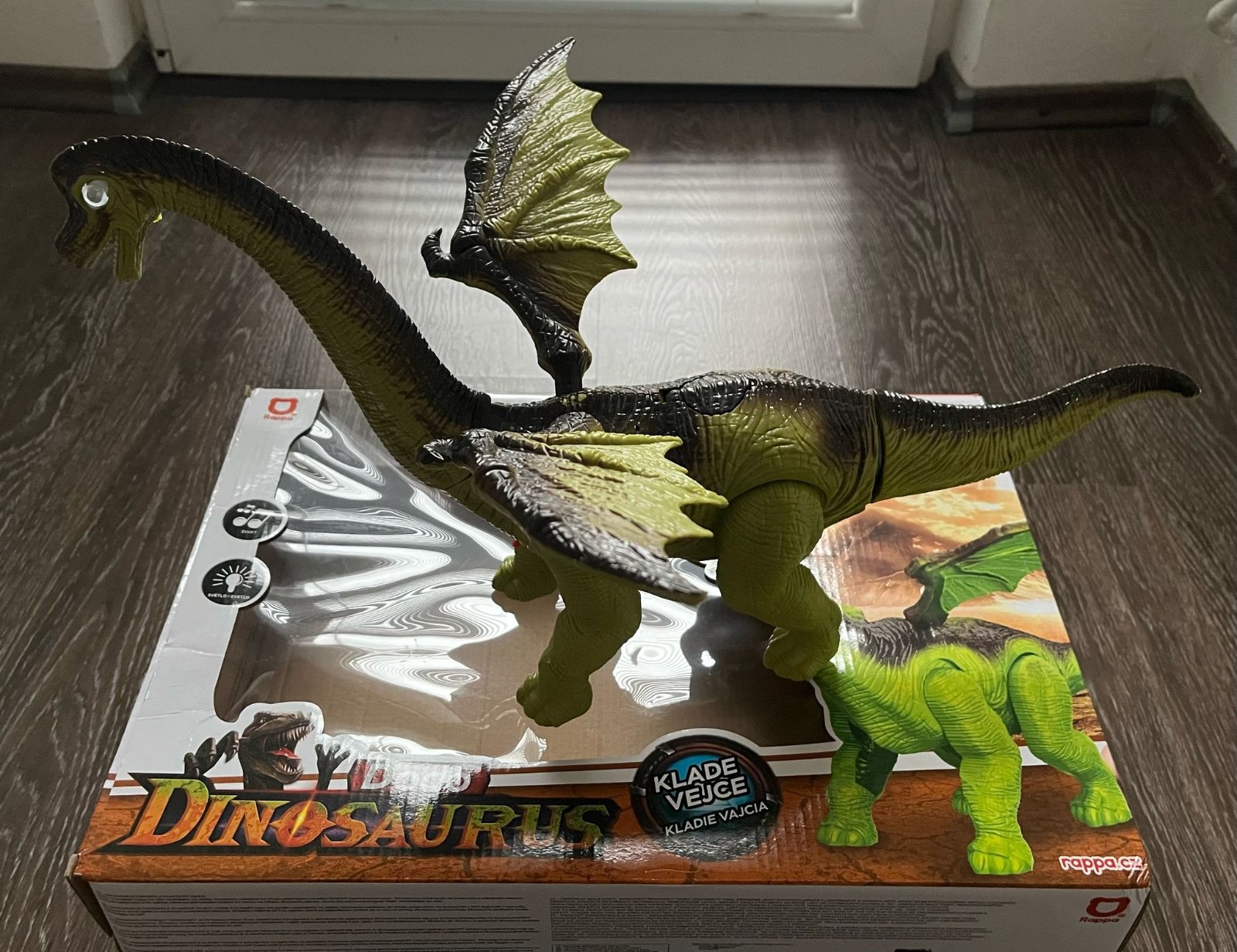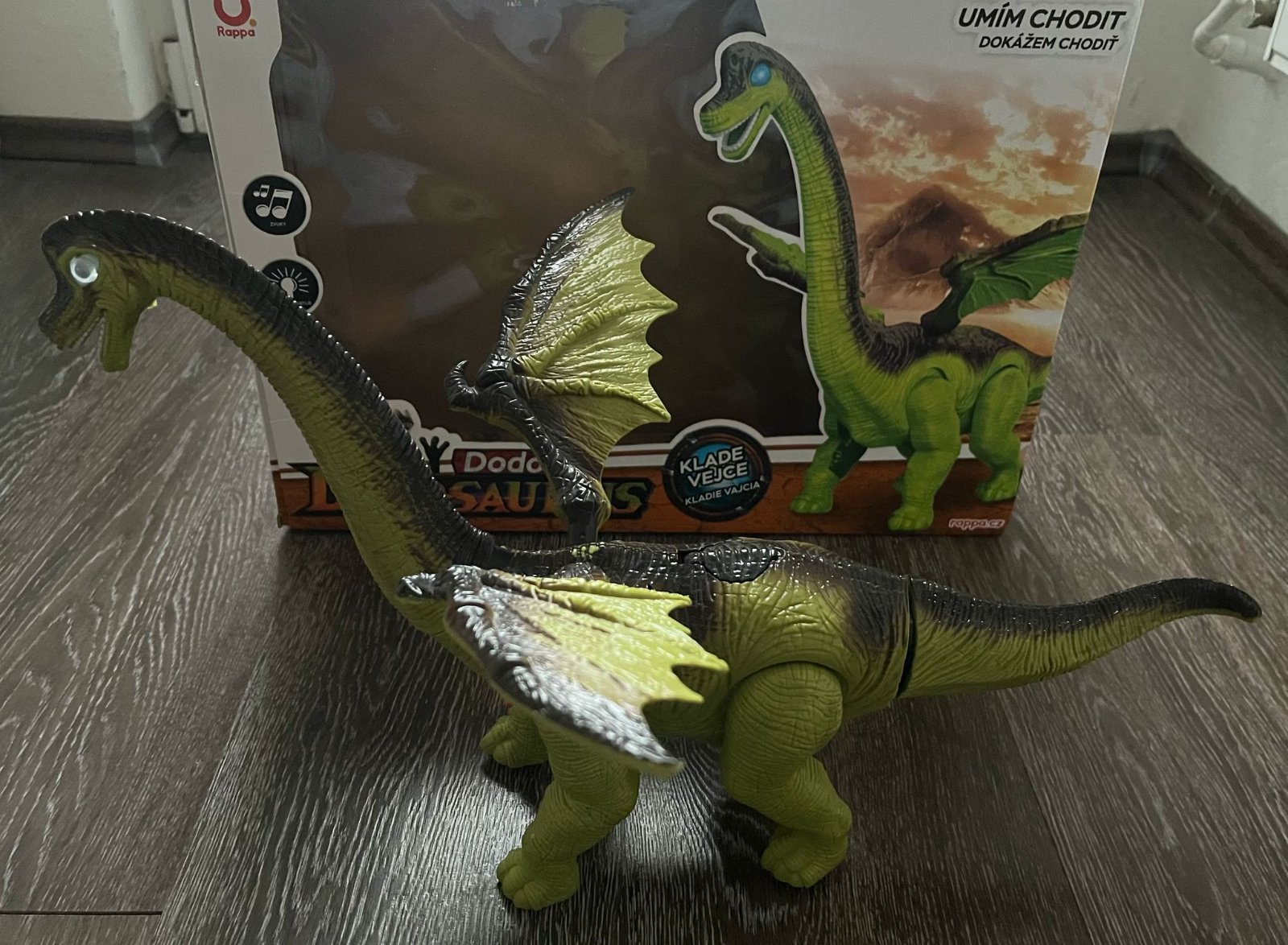 Hračka so zvukovými a svetelnými efektmi poteší všetkých chlapcov a dievčatá od troch rokov. Rappa chodiaci dinosaurus sa pohybuje, vydáva zvuky a hýbe hlavou aj chvostom. Praveký tvor zo série World Dinosaurs dokáže klásť pri chôdzi vajcia.