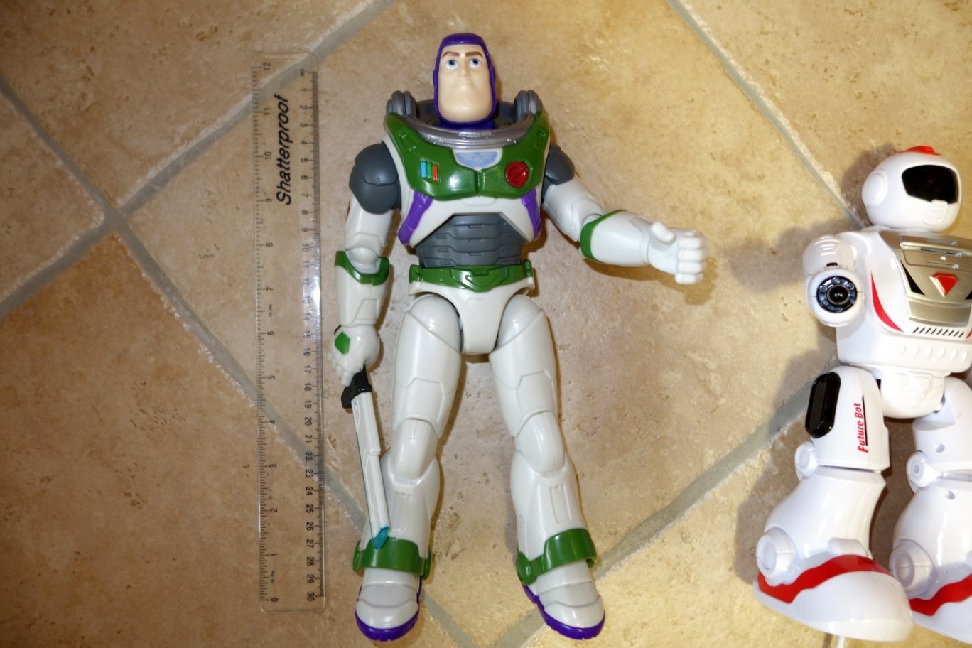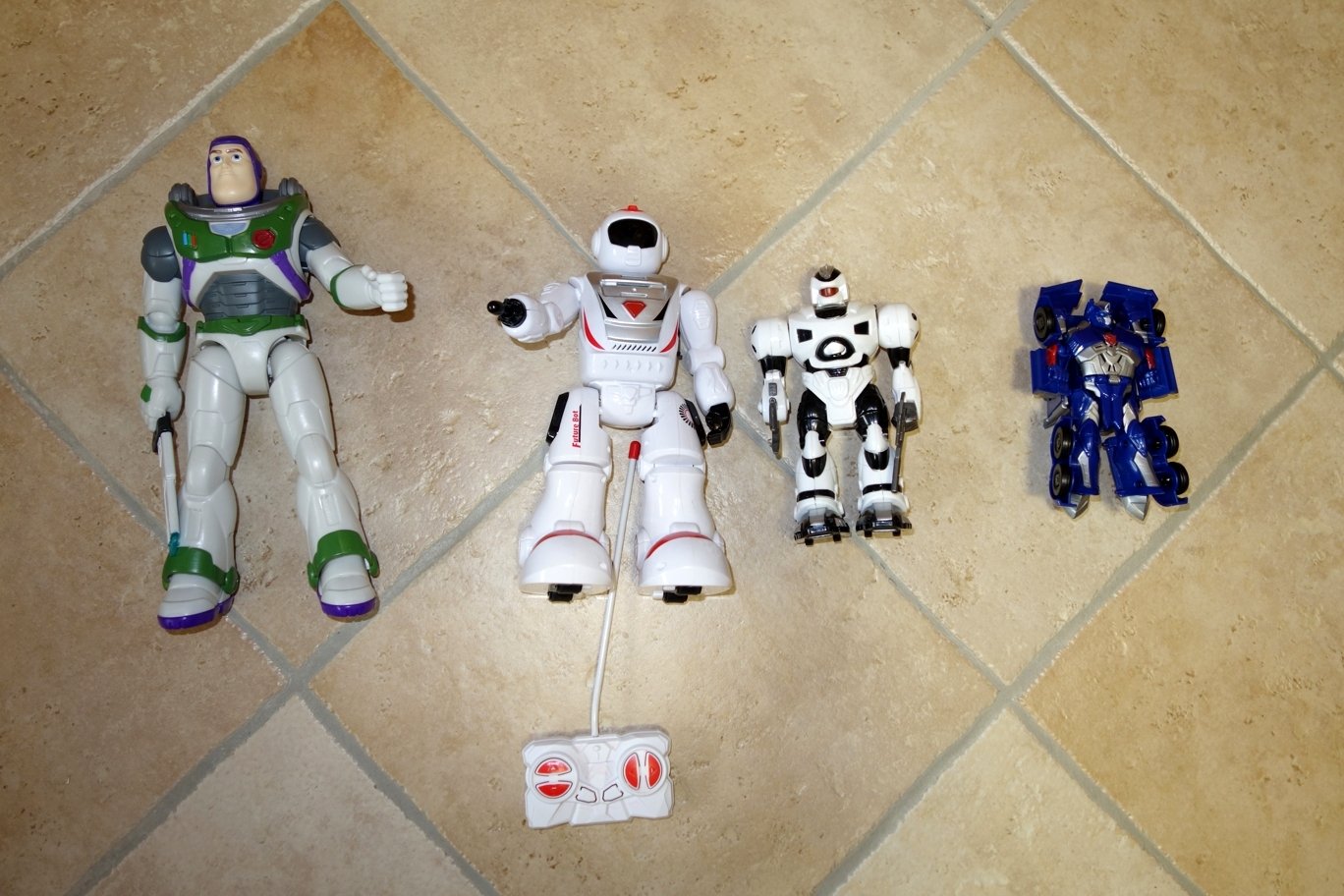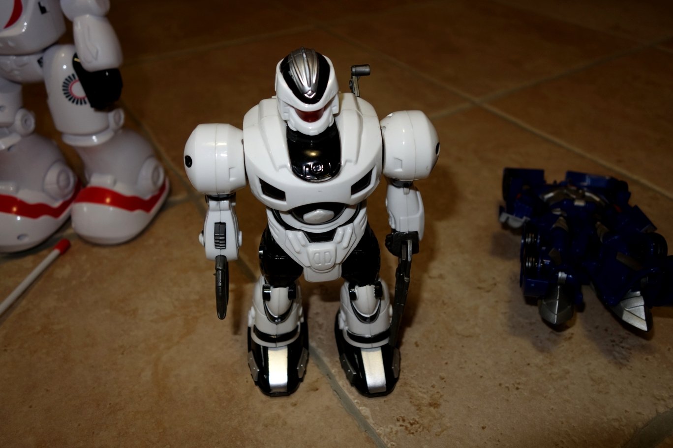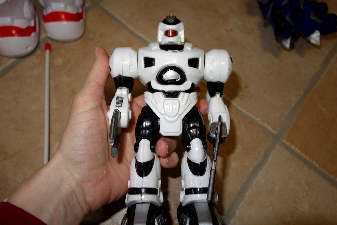Bieločervený robot na diaľkové - cca 27 cm, bežné známky používania. Po zapnutí má robot modré podsvietenie a dá sa ovládať diaľkovým - chodí vpred, vzad, točí sa vľavo, vpravo a vydáva pritom zvuky. Z ruky po stlačení tlačidla vystreľuje náboj. Dráčik - Future bot 20€ - teraz 3€