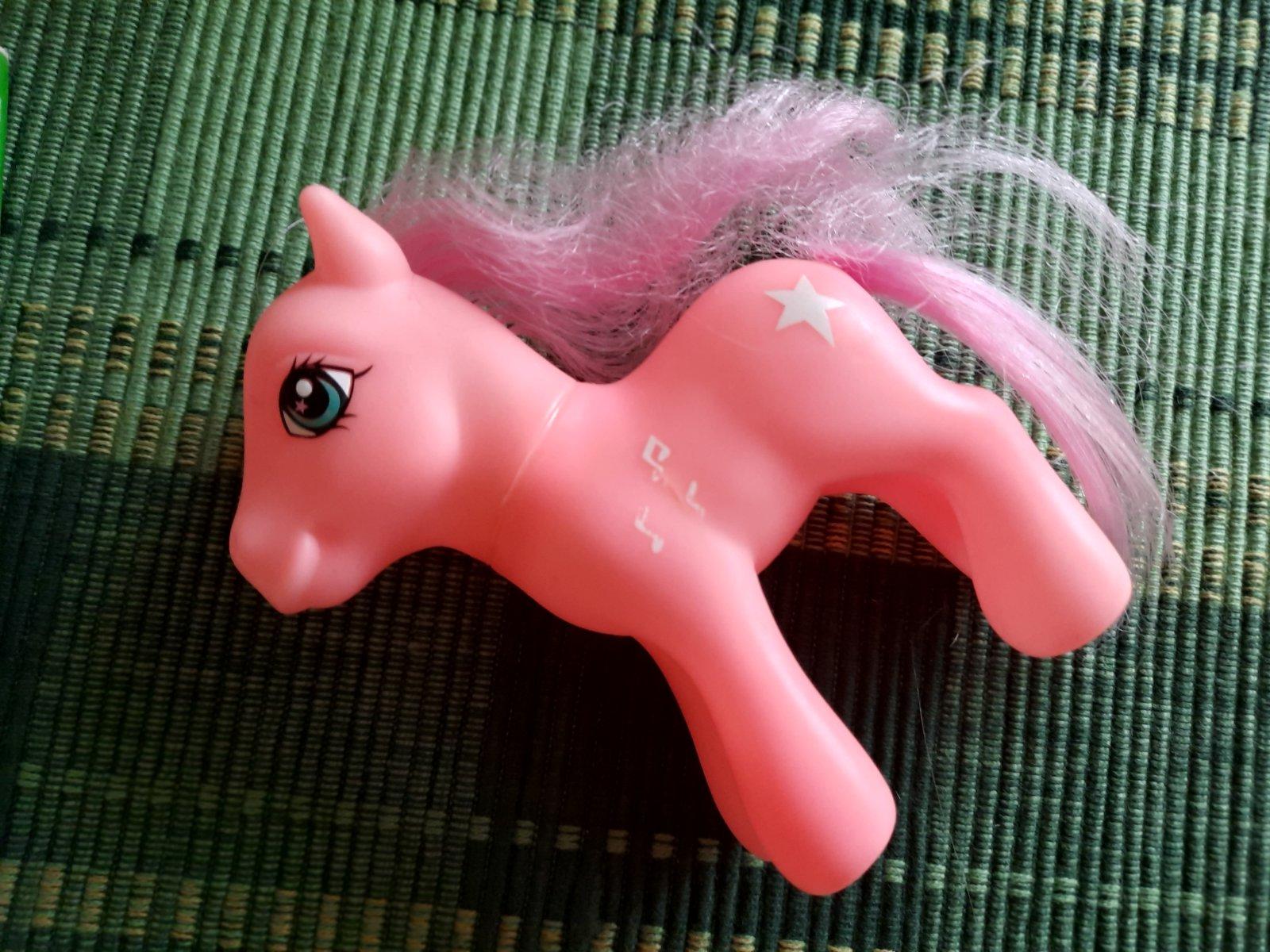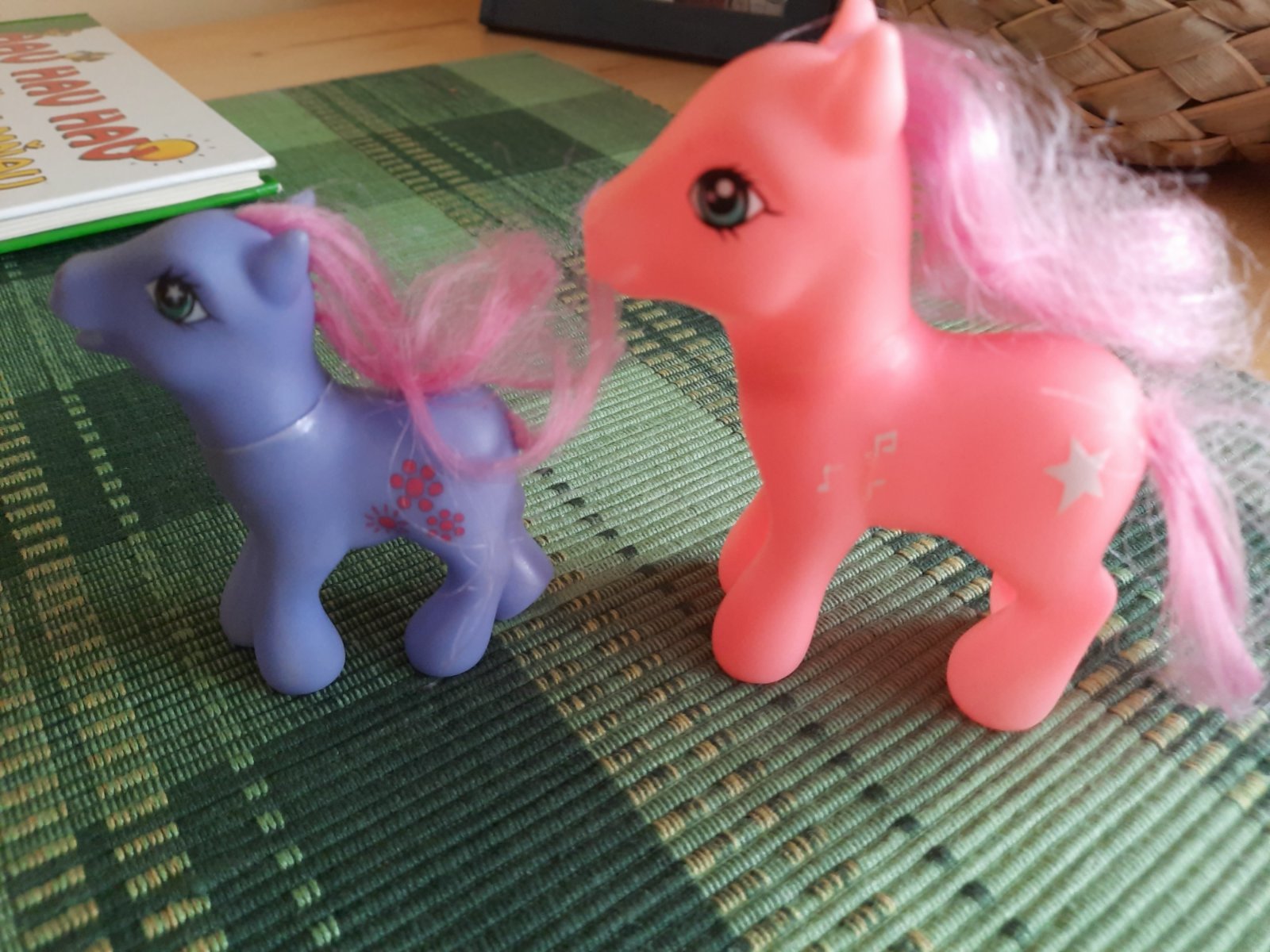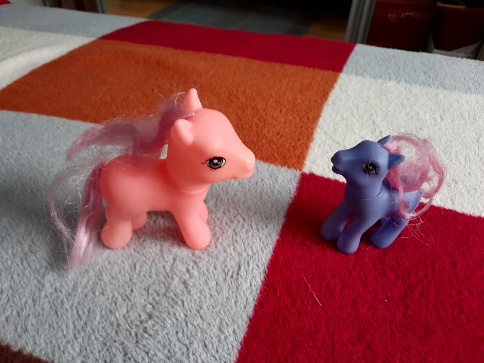 Predám 2 maličkých poníkov s hrivami. Rúžový je plástový - výška 10 cm, fialový je gumový - výška 8 cm. Hlavy sa im dajú otáčať.