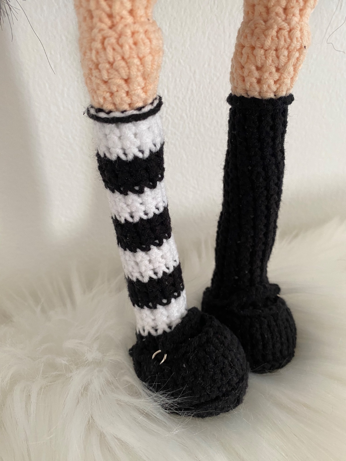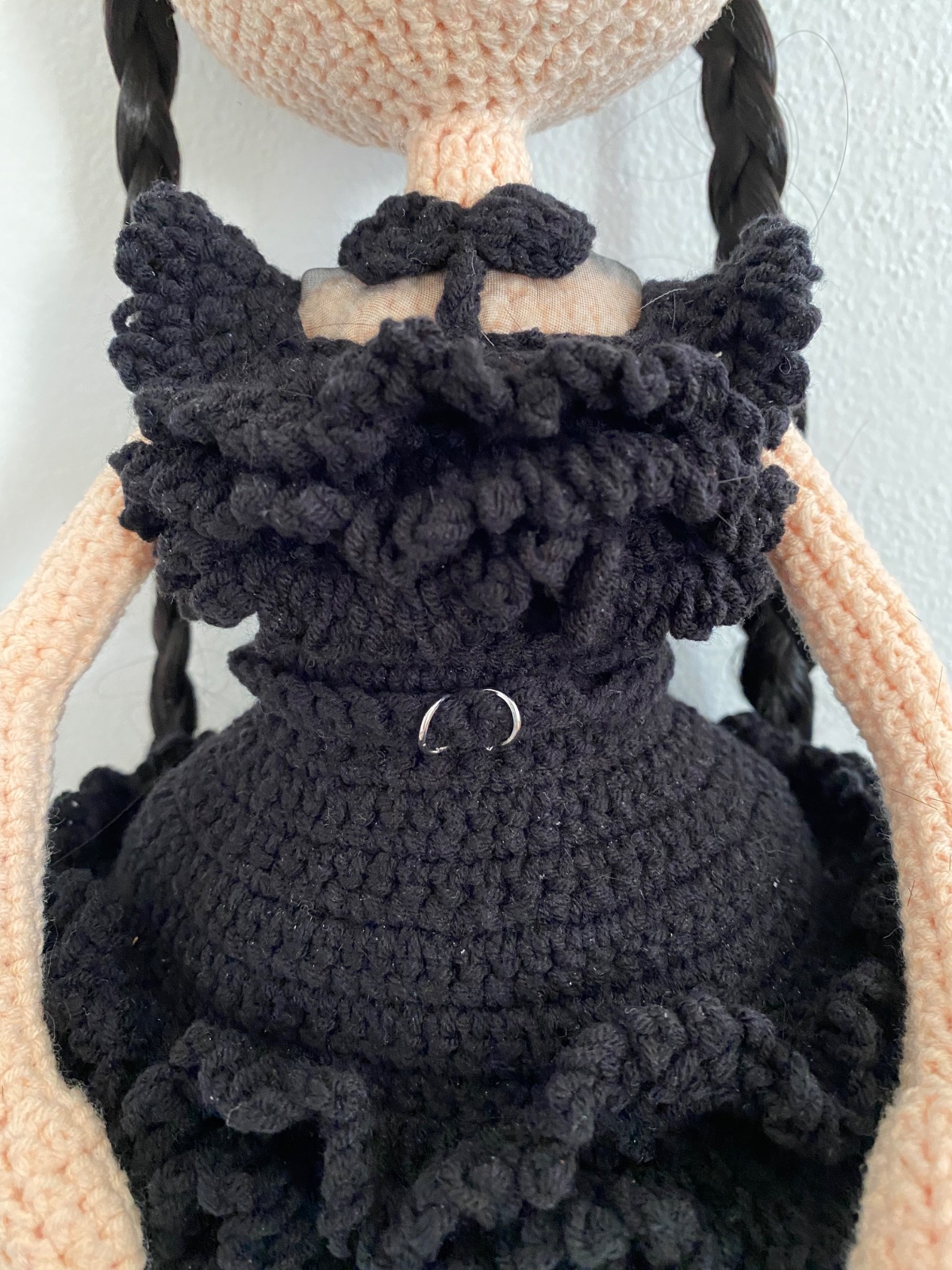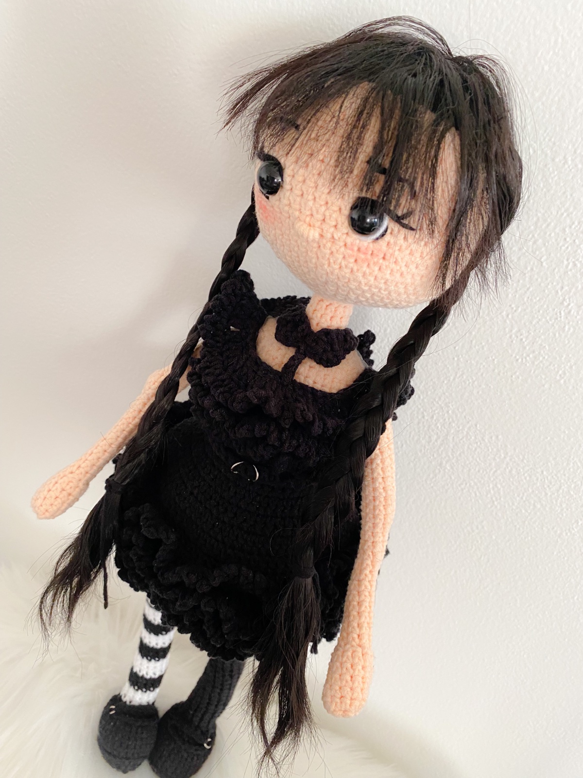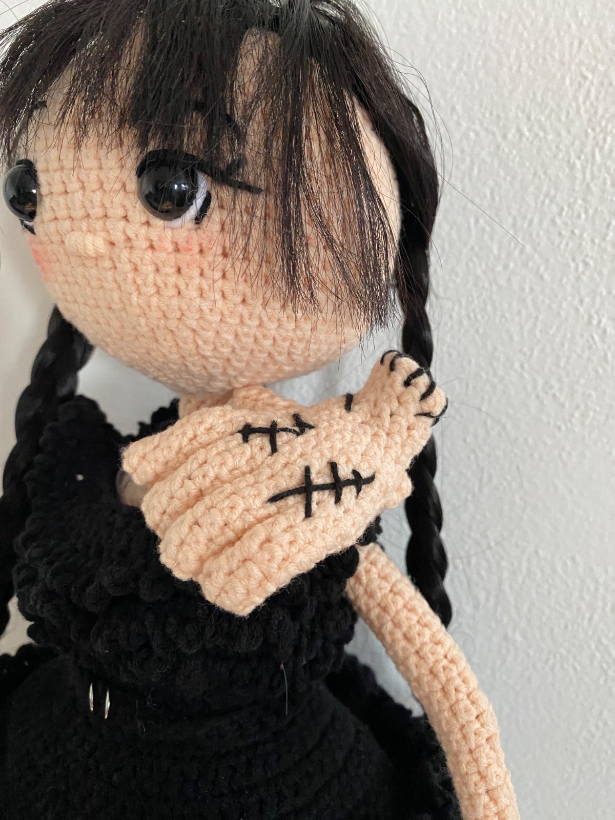 Háčkovaná bábika Wednesday Adams. Uháčkovaná z príjemnej zmesovej vlny, s bezpečnostnými očkami, umelými vlasmi, boty a šaty sa dajú vyzliecť. Ruky i nohy sa dajú ohýbať. Súčasťou balenia je aj ruka - Vec.