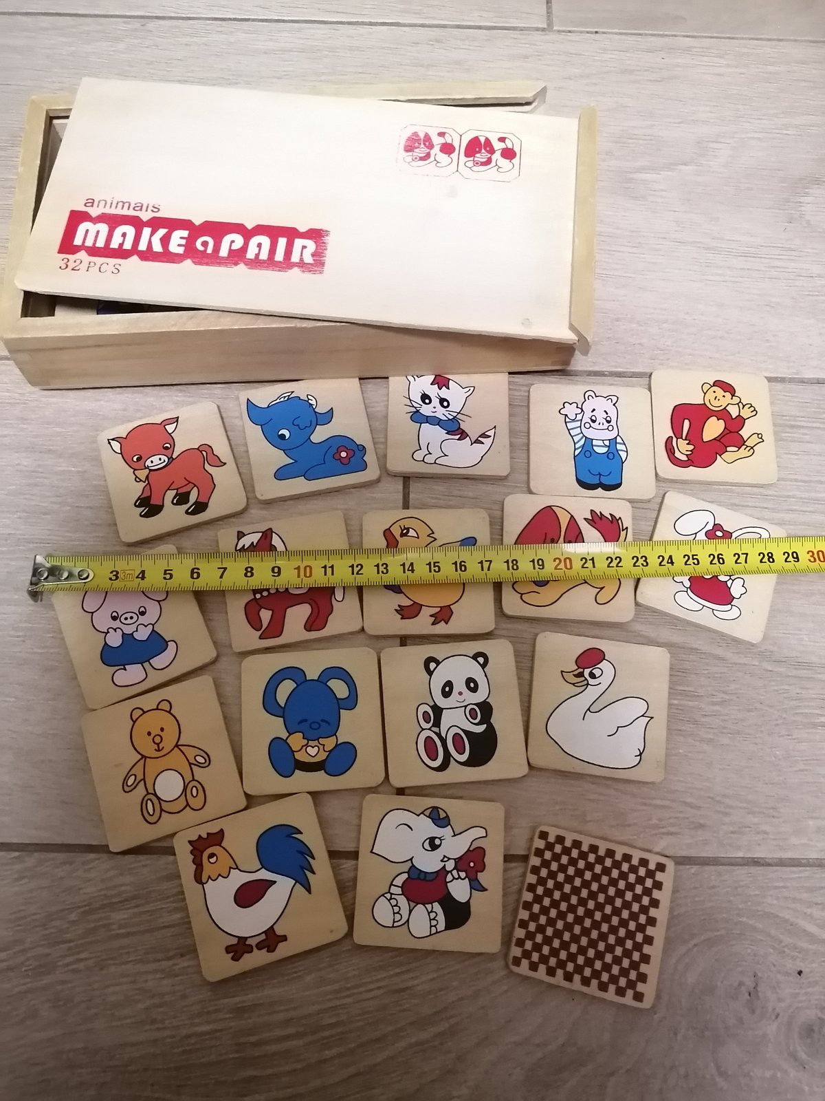 32 dielne, čiže 16 párov : sú tam rôzne zvieratká, panda, macko, opica, slon, kohút, myš, prasa, krava, kôň, labuť, mačka, kačka...