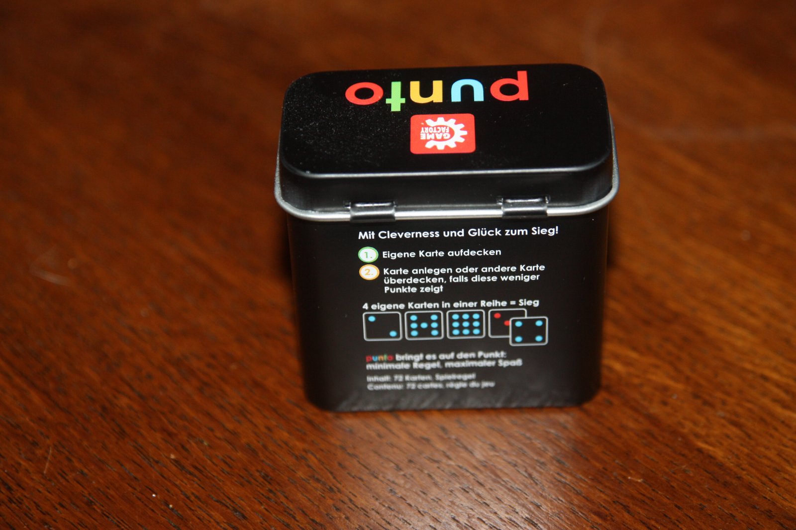 Spolocenska hra pre 2-4 hracov od 7 rokov. V praktickej plechovej krabicke. Pravidla v nemcine a francuzstine, na nete je mozne najst aj anglicky preklad. Hrana, ako nova, kompletna.