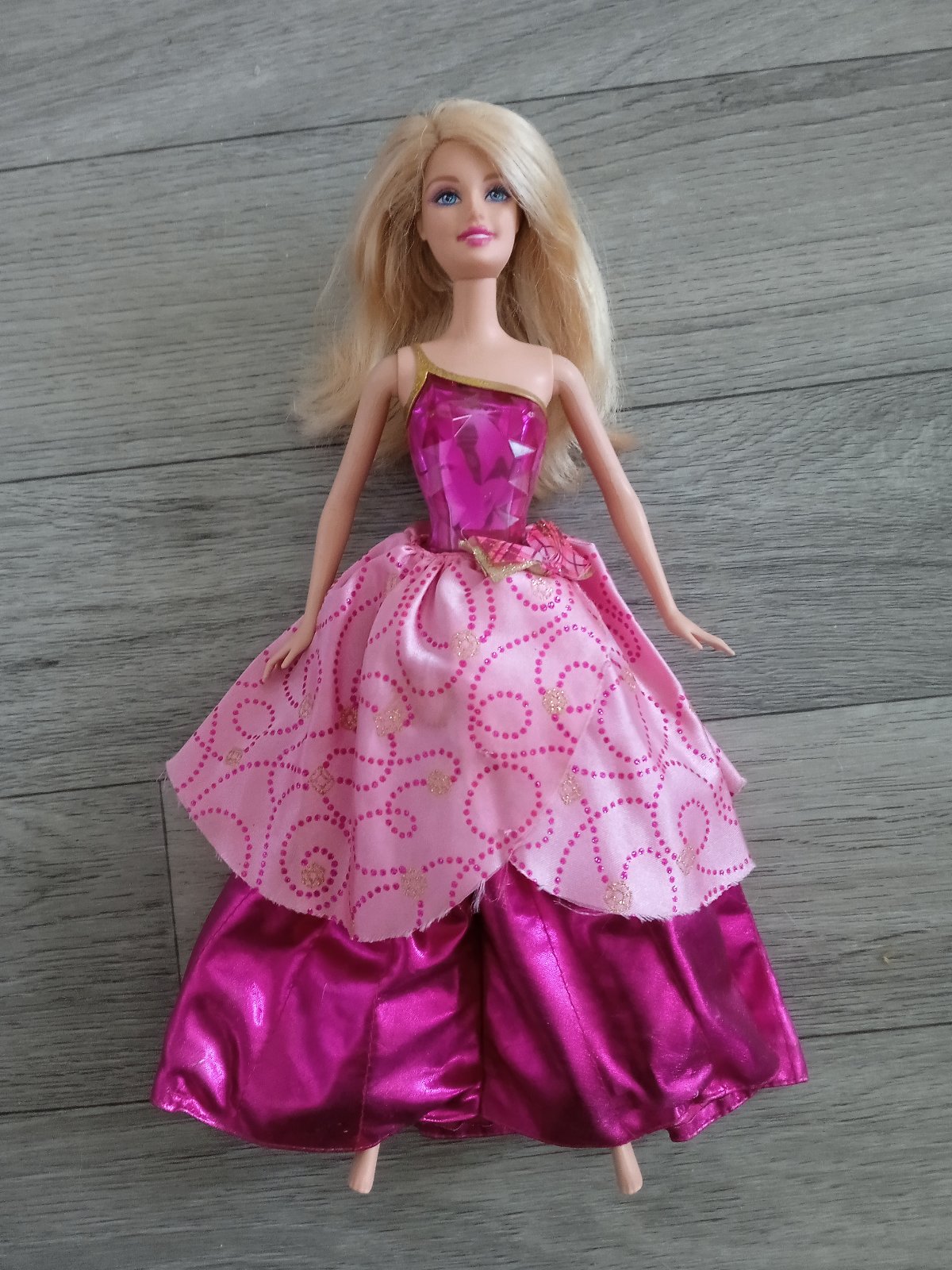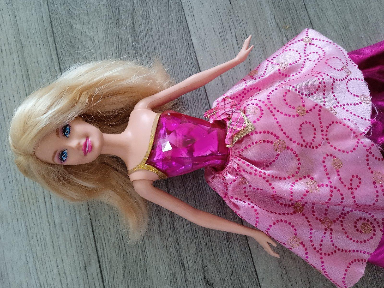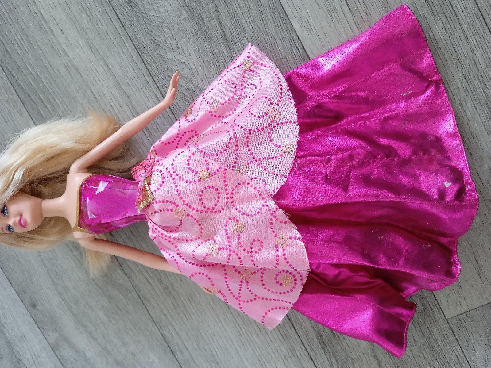 Hraná Barbie z rozprávky Škola šarmu. Vďaka kľúčiku na chrbáte sa jej sukňa skrčí asi 1,5cm a po stlačení srdiečka jej padne dole naspäť.