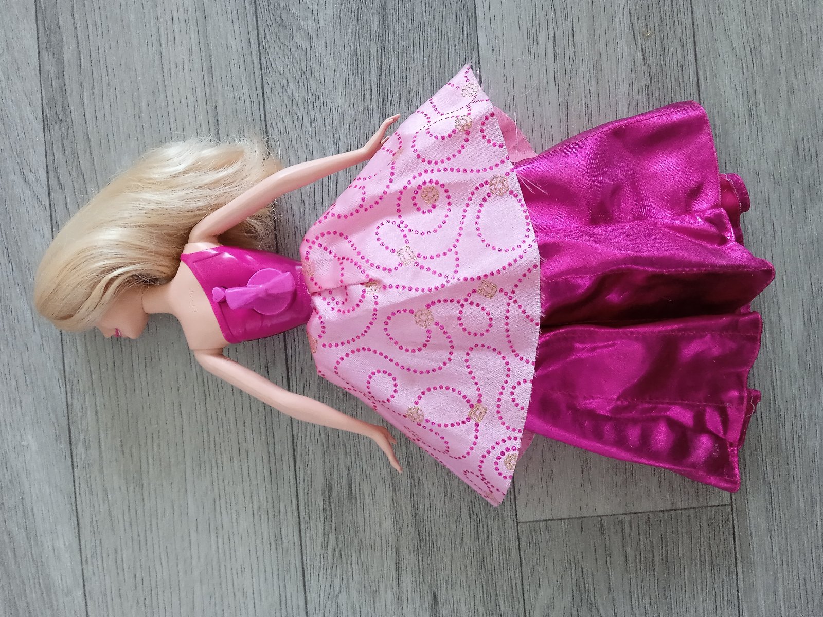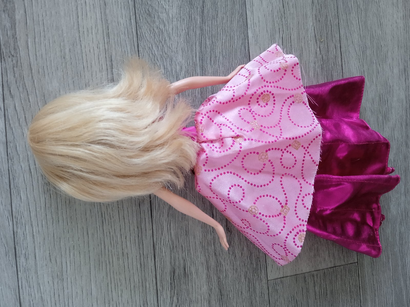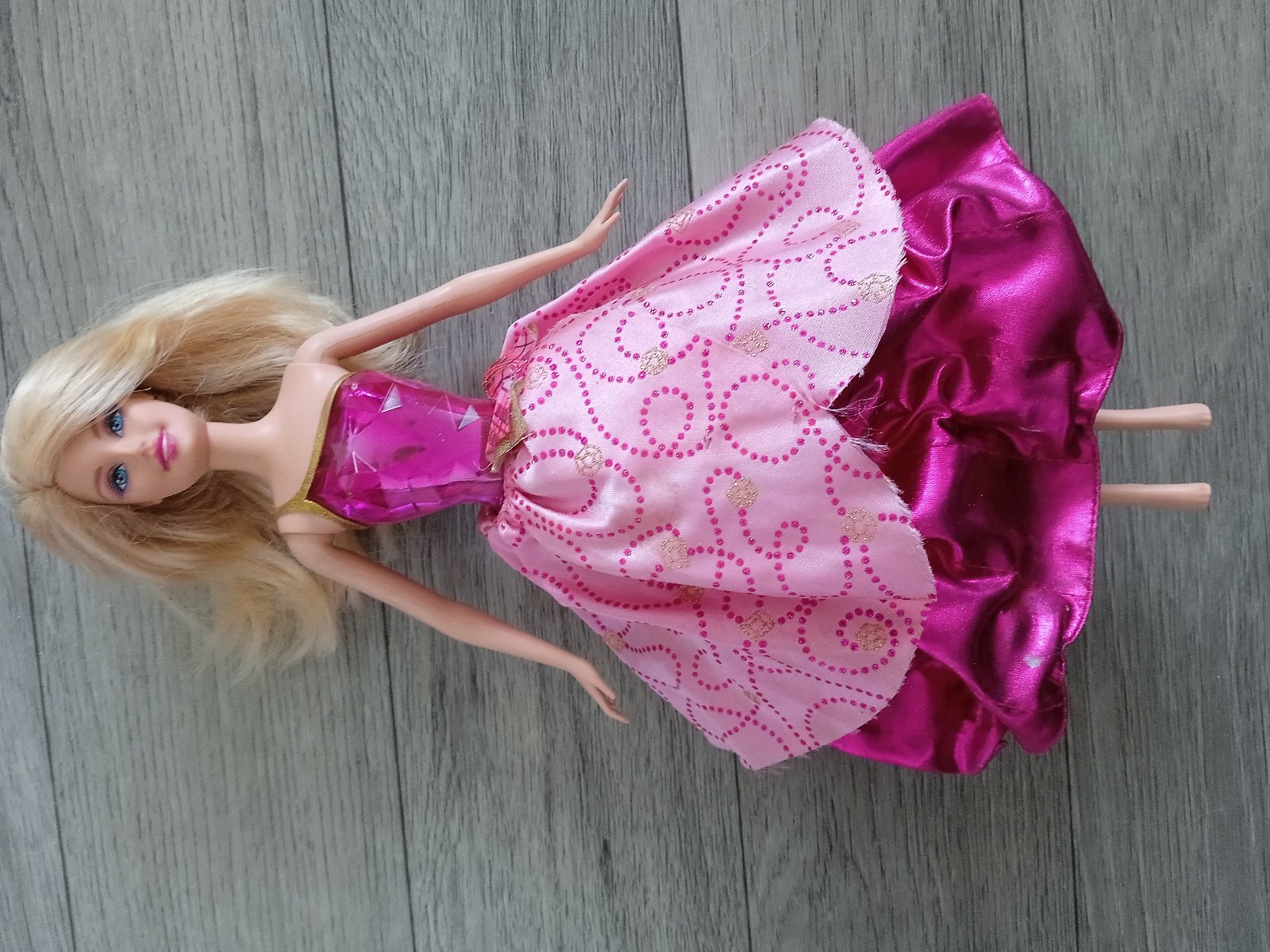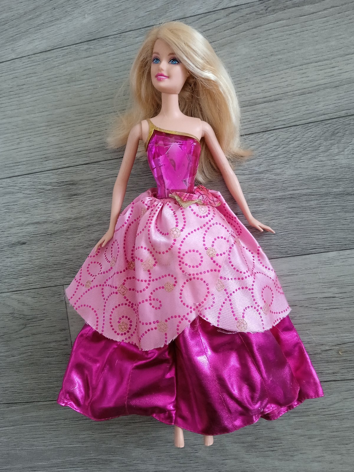 Hraná Barbie z rozprávky Škola šarmu. Vďaka kľúčiku na chrbáte sa jej sukňa skrčí asi 1,5cm a po stlačení srdiečka jej padne dole naspäť.