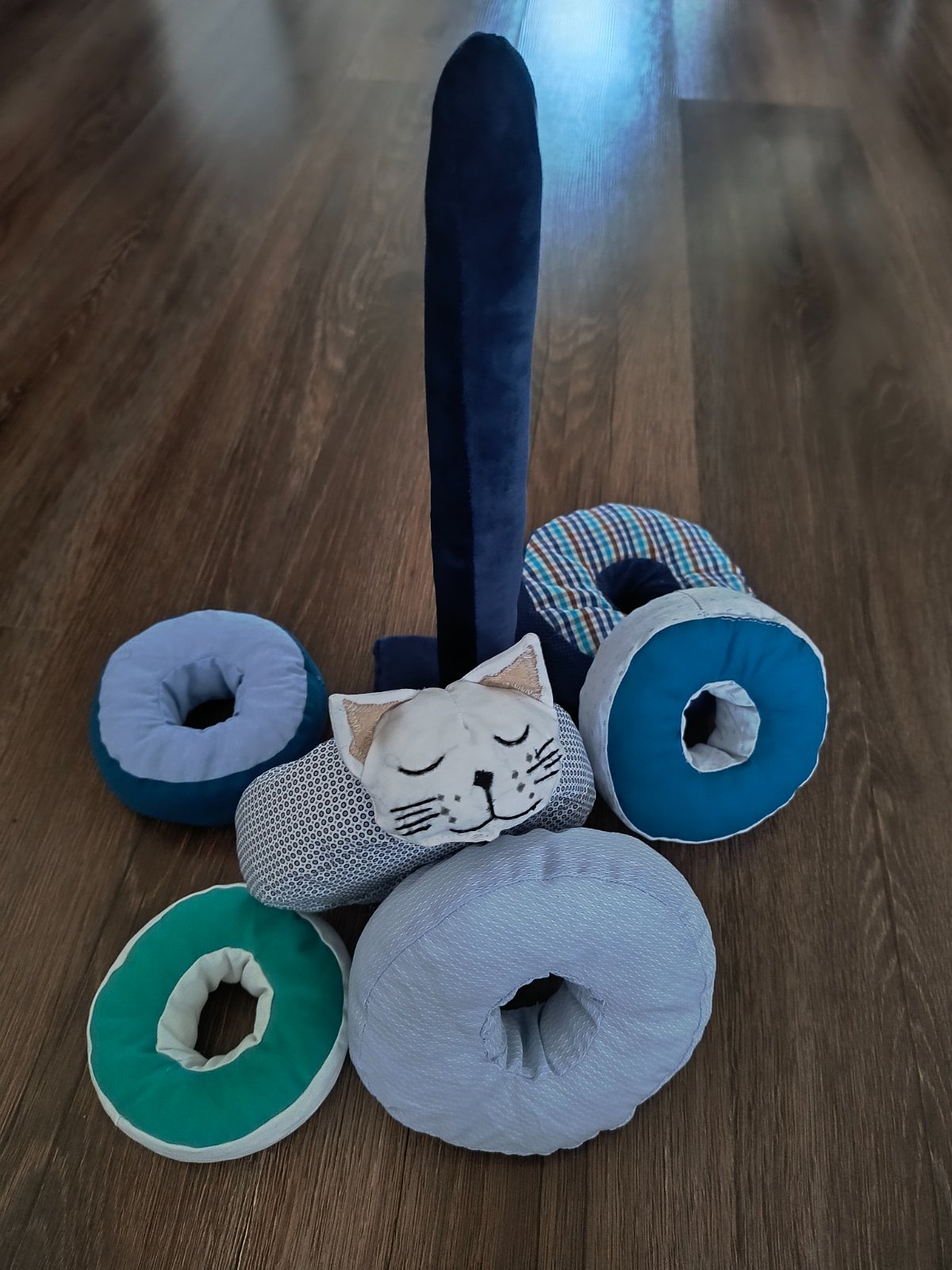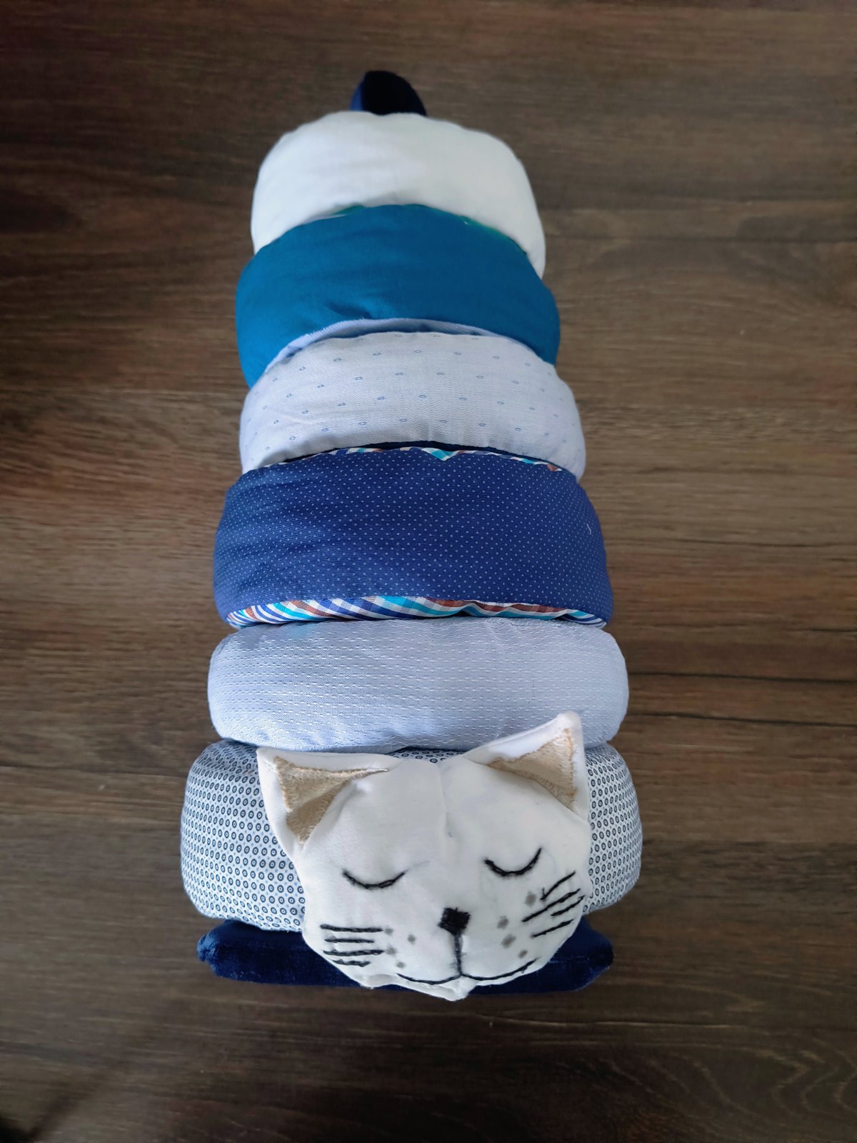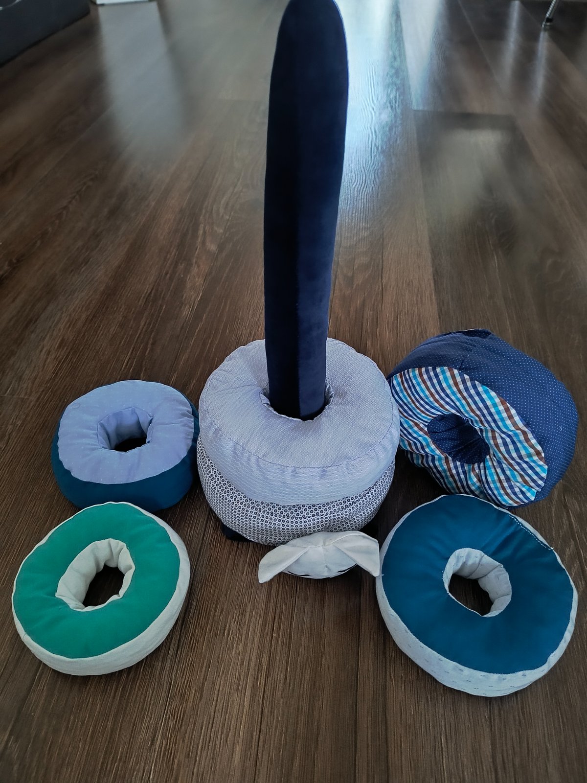 Pyramída edukačná, ušitá z bavlnených látok a vyplnená rúnom, výška je 35cm, lahučká, dá sa nosiť v ruke, rozvíja u detí motoriku ,nová, cena+pošta podľa taríf slovenskej pošty