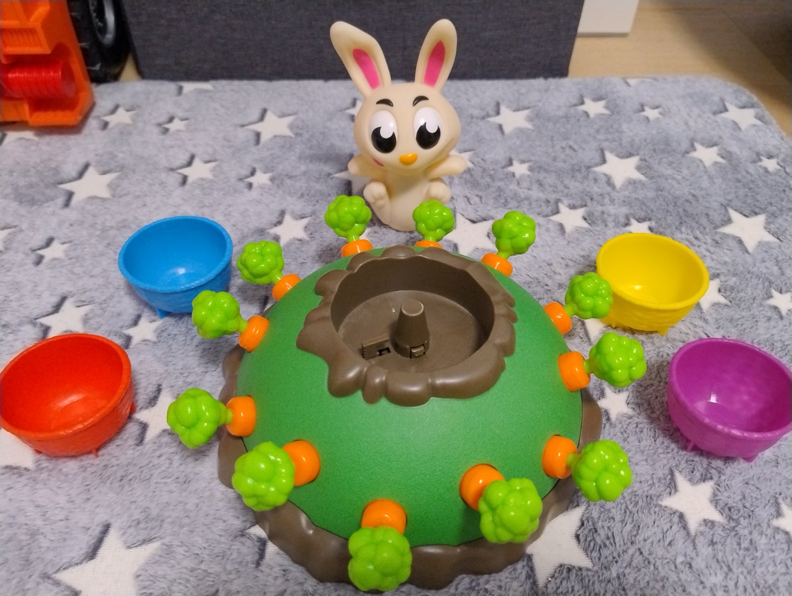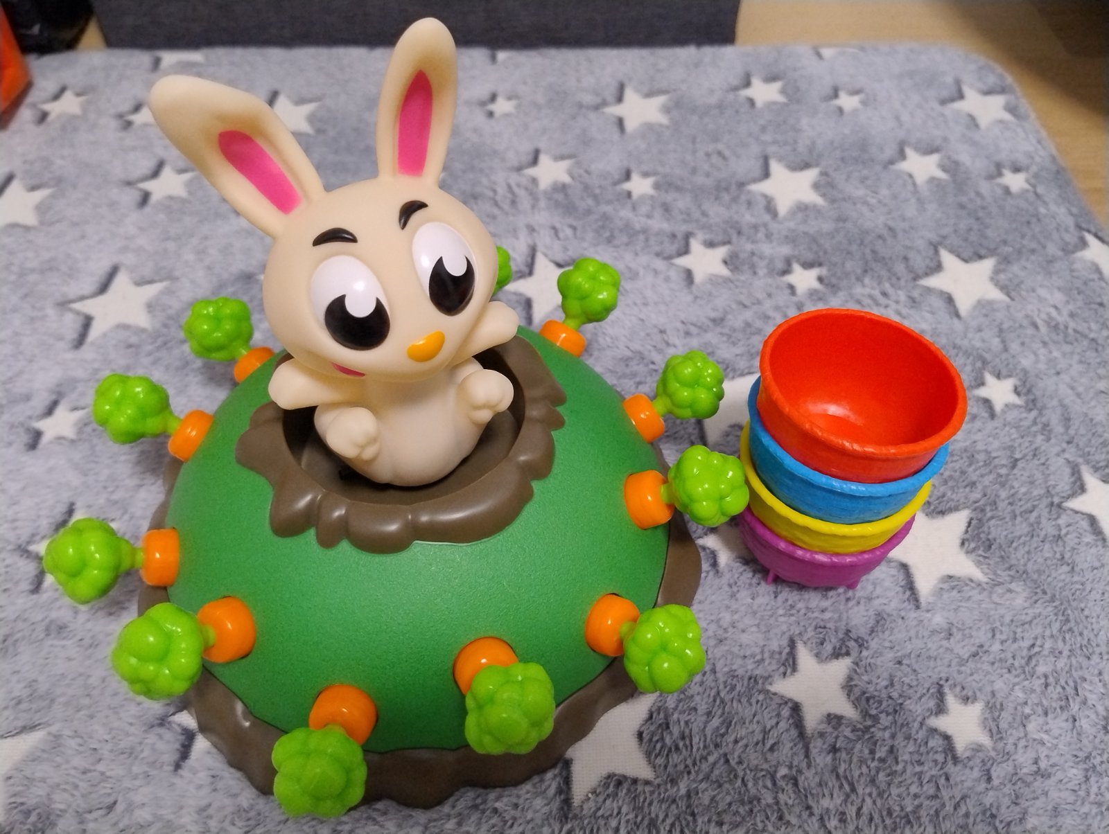Vyzbieraj mrkvičky v záhone bez toho, aby si ťa zajačik všimol. Keď ťa zbadá, vyskočí zo svojho brlohu a všetko bude záležať len na tvojich reflexoch, či ho dokážeš chytiť. Vyhráva ten, kto ukoristí najviac mrkvičiek. Hra pre 2 a viac hráčov, vhodná od 4 rokov.