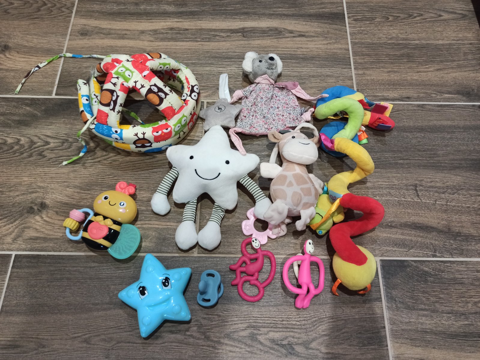 Posuniem tieto hracky.su ako nove,hrajuce i svietiace,mojkacik,helma proti buchnutiu hlavy,hracka na madlo kocika.