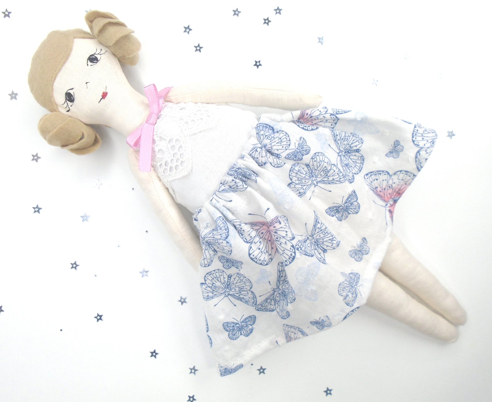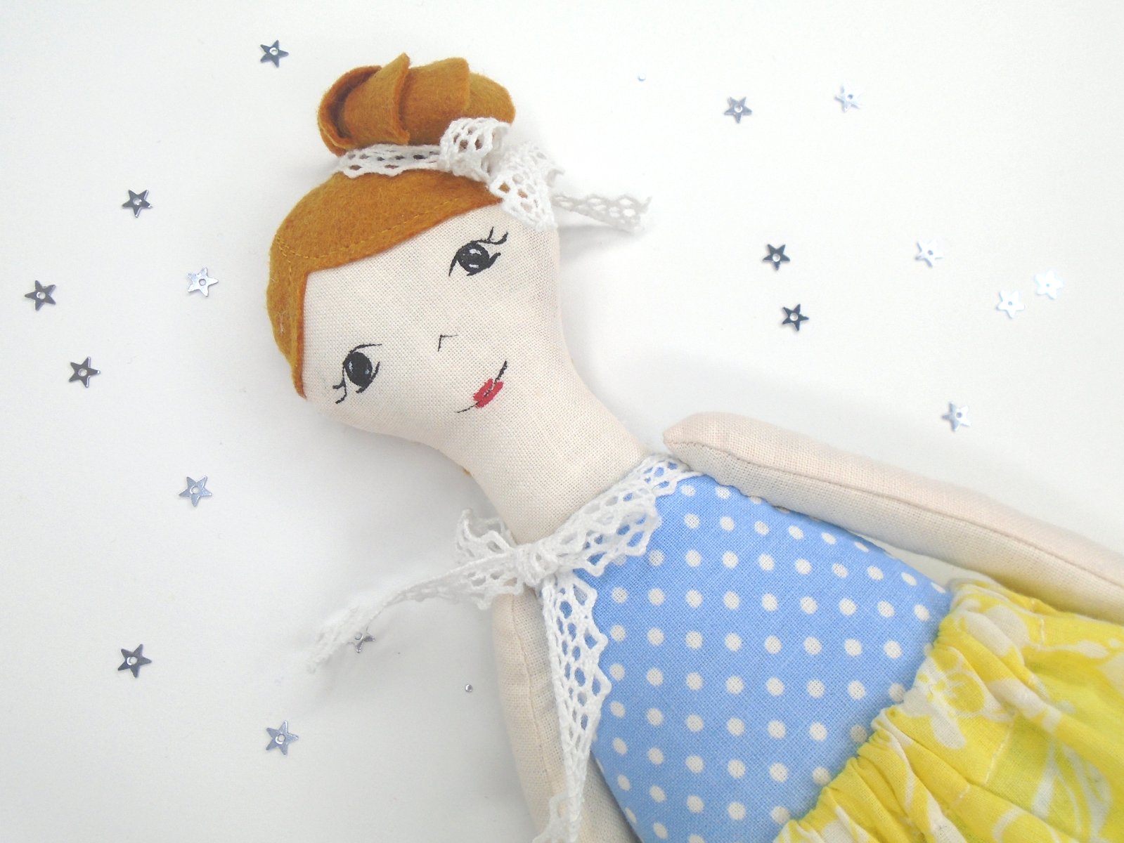 Rozkošná bavlnená hračka je ušitá podľa vlastnej predlohy. Textilná hračka pri láskavom zaobchádzaní vydrží dlhé roky. Bábiku odporúčam pre slečny cca. od 2-3 rokov.