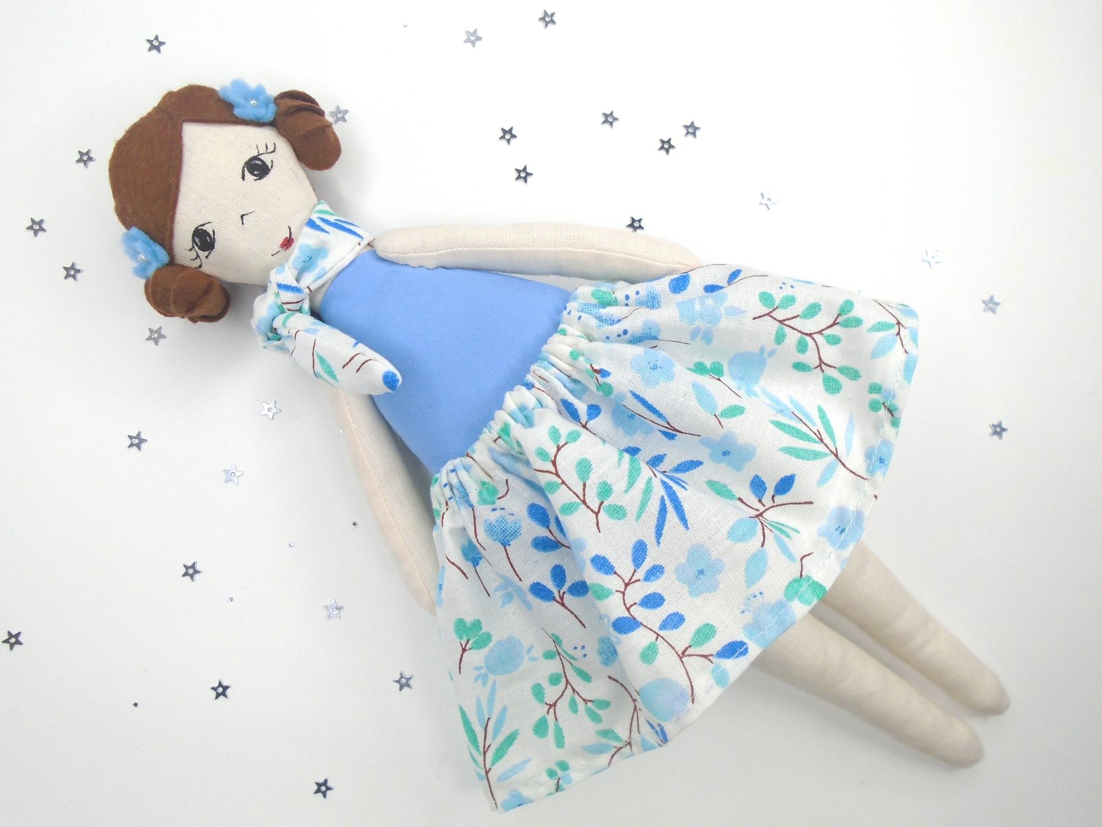 Roztomilé dievčatká sú ušité z bavlnenej látky, vyplnené je dutým vláknom. Vlasy majú z filcu. Tvárička je maľovaná ručne s textilnými farbami, farby sú zafixované žehlením, ale pre istotu bábiku uchovávajte na suchom mieste :) Niektoré majú šaty fixné, niektoré majú sukničku na gumičku tie sa dajú vyzliecť.