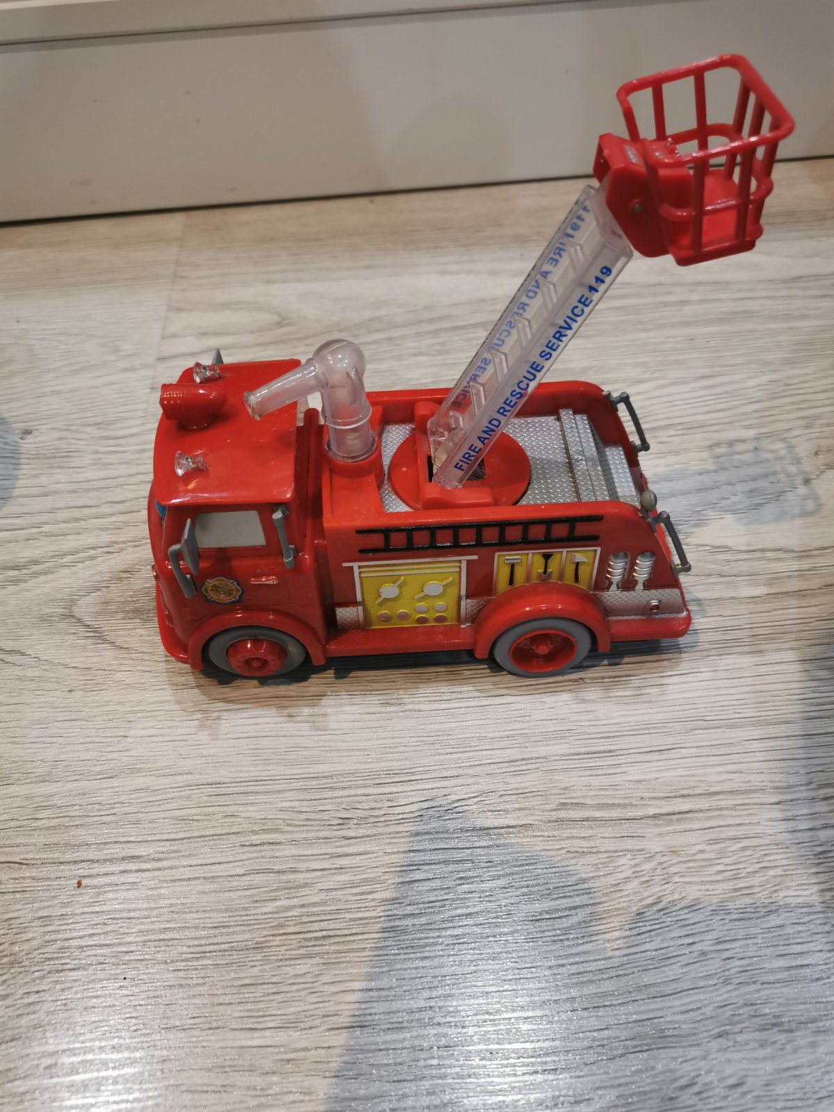 Hasičské auto v top stave. Auto sa točí, húka sirénu, bliká a rebrík chodí hore dole. Dĺžka s rebríkom 23cm, výška cca 12 cm, s rebríkom hore na výšku 17cm. V