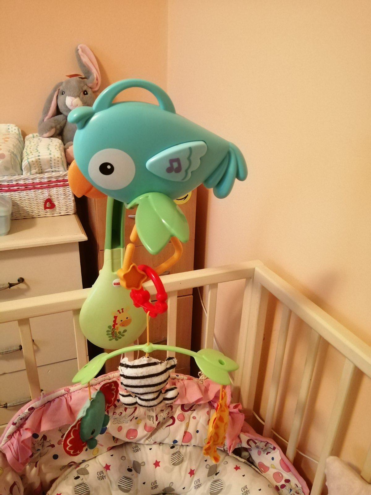 Sloník, tigrík a levíček sa otáča nad hlavou dieťatka a hudobné hračky v podobe vtáčika prehráva upokojujúce uspávanky, ktoré pokračujú aj potom, čo sa kolotoč dotočí . Keď dieťa vyrastie a prestane spať v detskej postieľke, hracie vtáčik na kolotoči sa zmení v bežnú prenosnú hračku s veselými zvukmi a kolotoč môžete pripnúť na kočík.