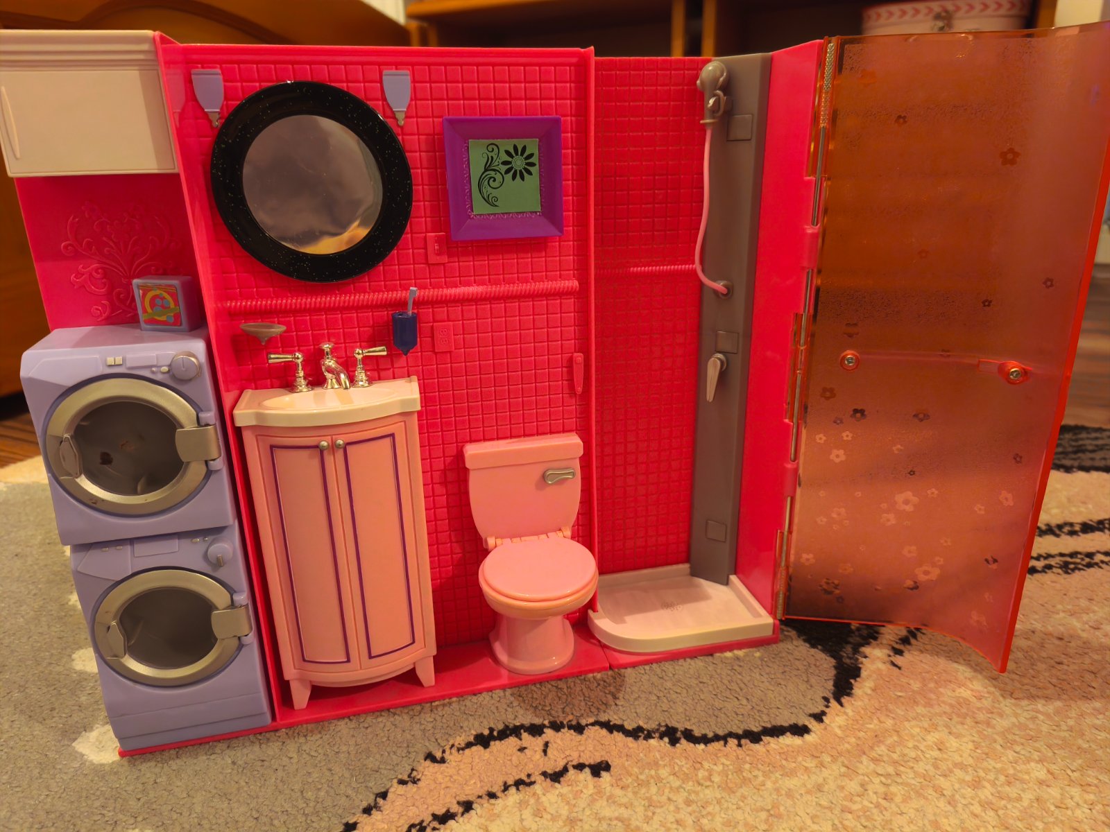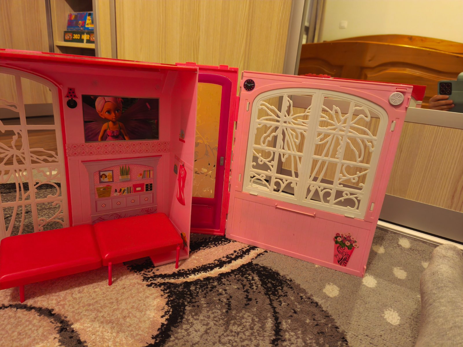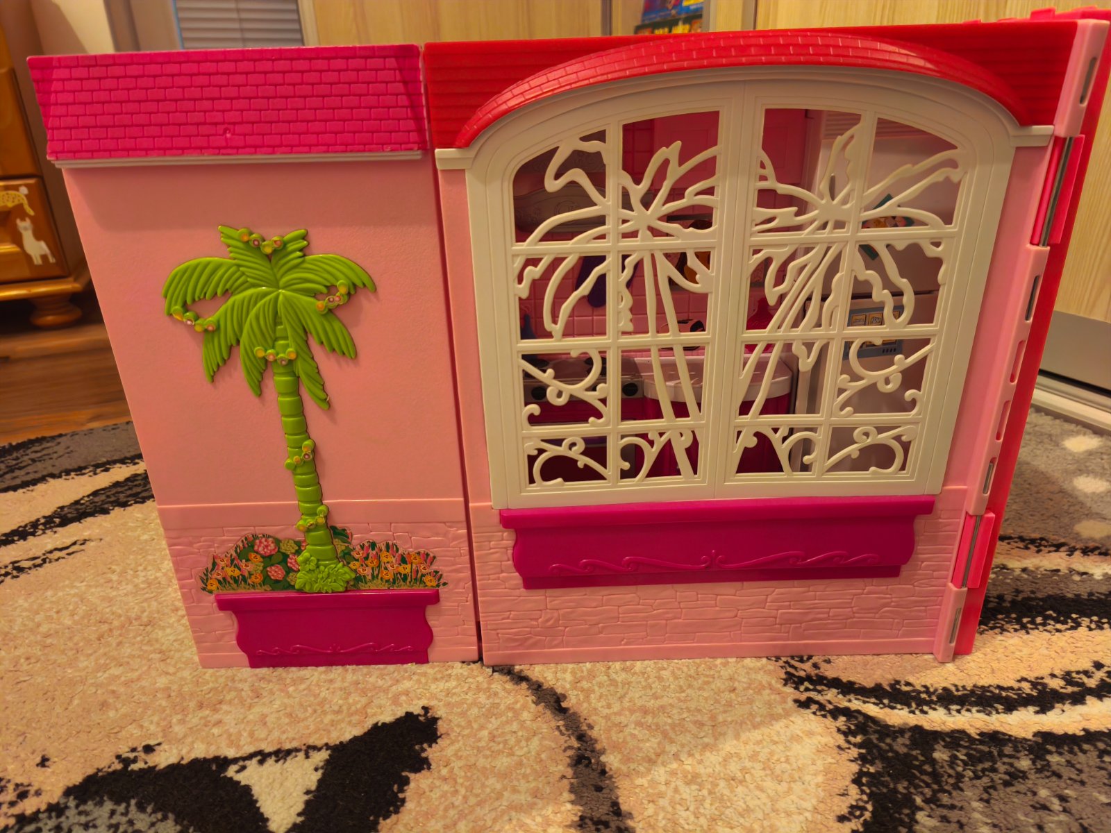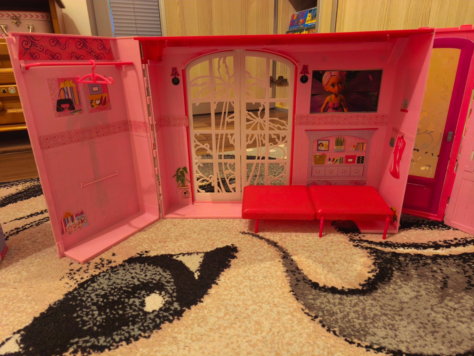 Domček rozkladací pre Barbie aj s príslušenstvom s posteľou, kuchynským stolom, vešiak,hrebeň,hrniec, kvet. Skladá sa z kuchynky, kúpeľne, obývačky. Možný len osobný odber
