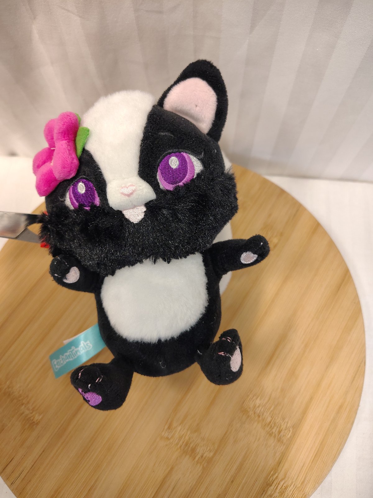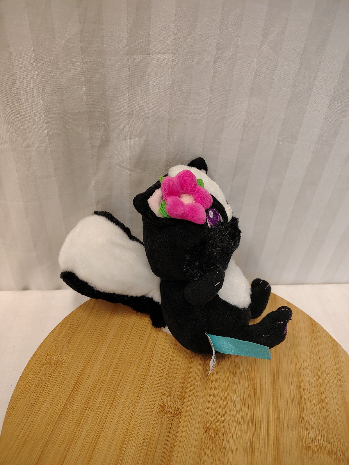 Plyšový Skunk Caper, má čierno biele sfarbenie s charakteristickým ružovým kvetom na hlave a fialovými vyšívanými očami.