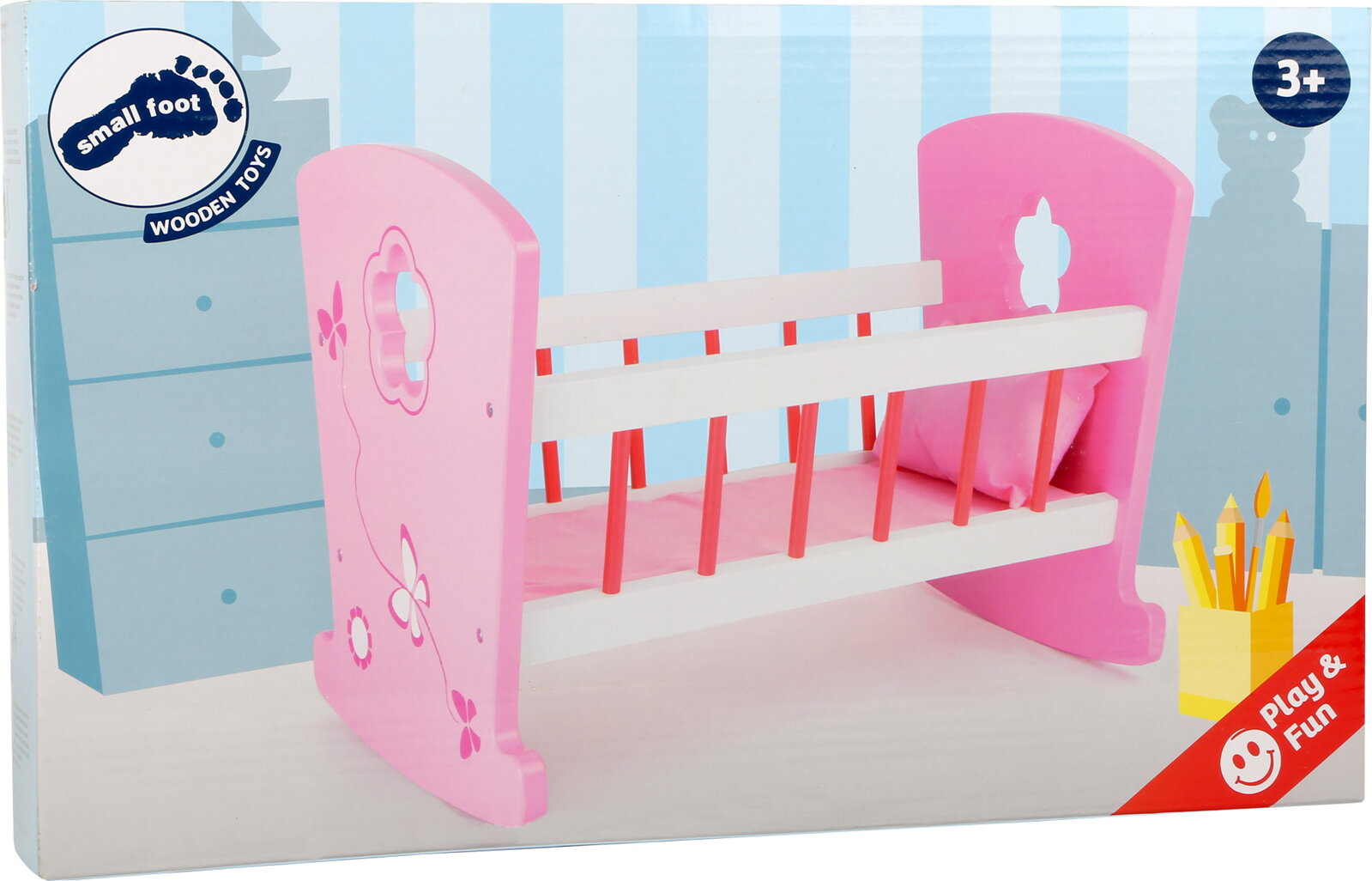Ružovo biela kolíska z kvalitného dreva. Súčasťou je matrac a vankúšik.