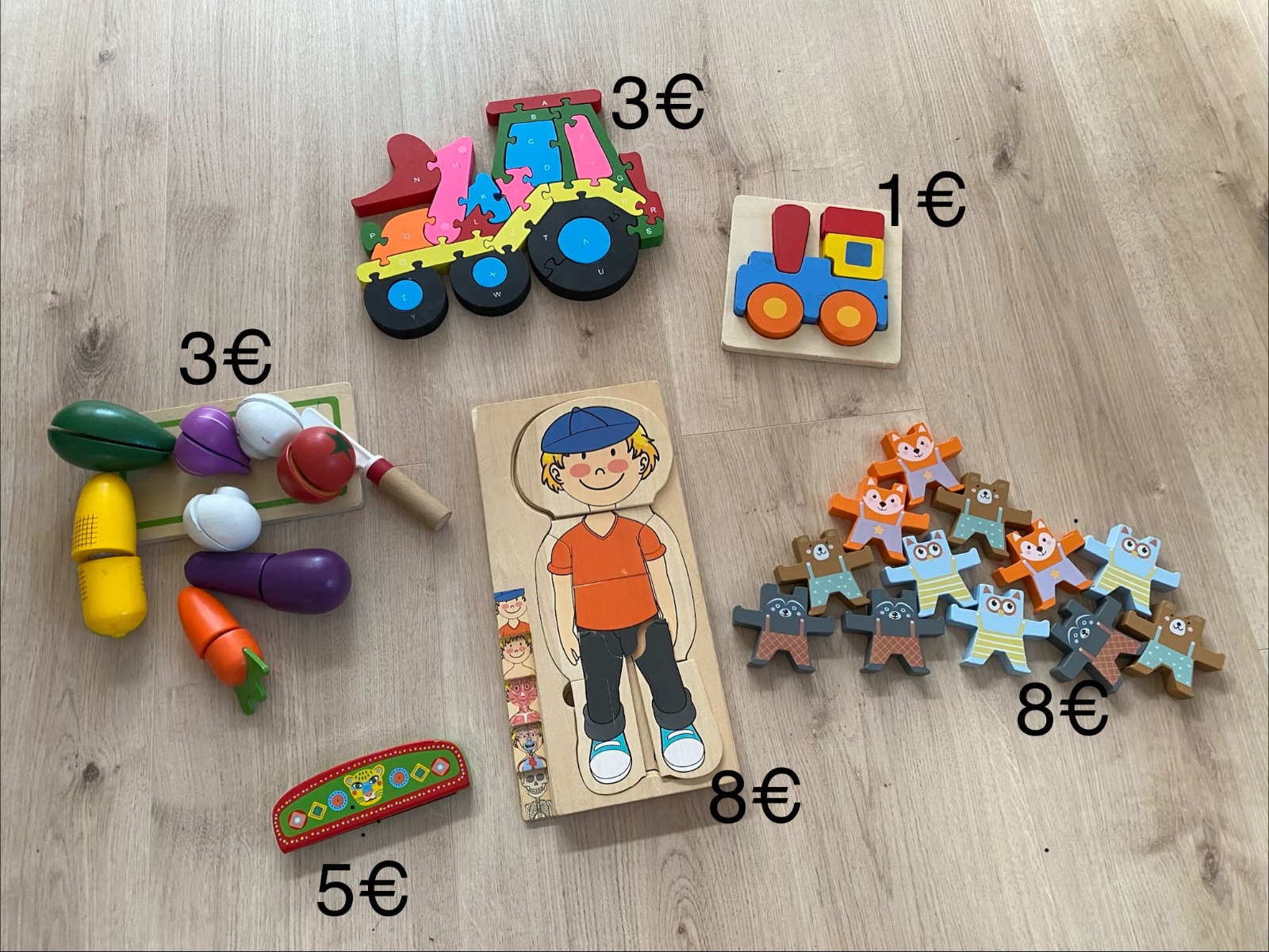 Drevené puzzle, čínska výroba, raz stavané, ideálne predaj ako balíček, všetky spolu. Predaný mýval, včielka, škriatkovia v domčeku a myška.