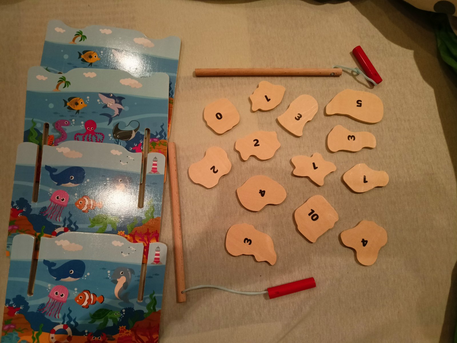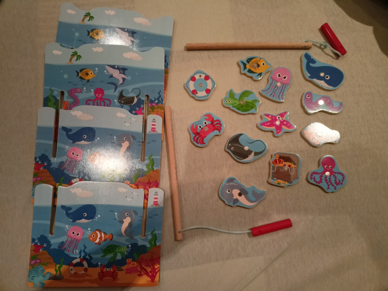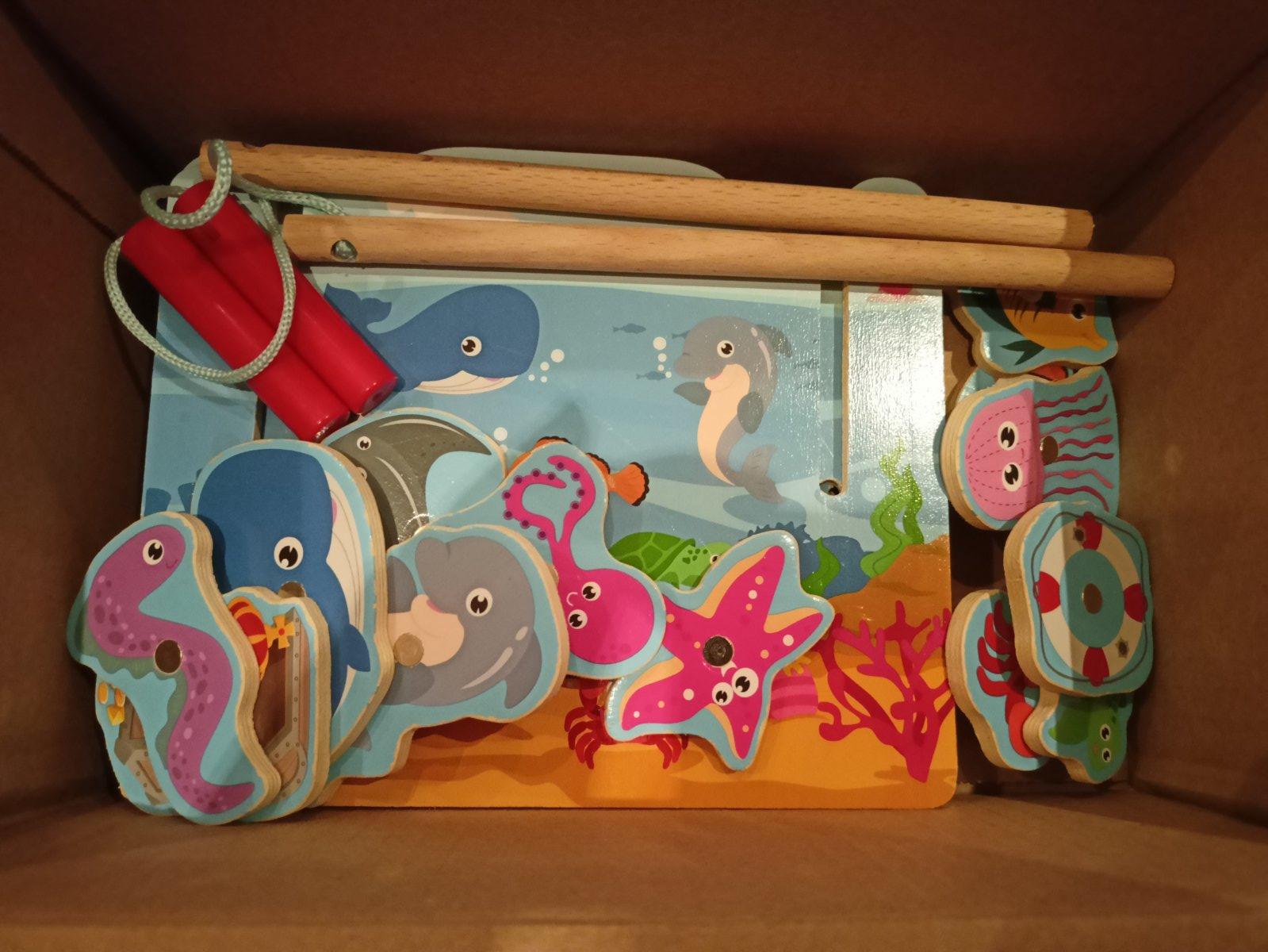 Poštovné v cene, predám drevenú hru, magnetickú - chytanie morských živočíchov na udicu. Môže sa hrať aj ako matematická hra, sčítavanie bodov ( zozadu sú čísla), kto má úlovok za viac bodov. Pôvodnú krabicu už nemám.