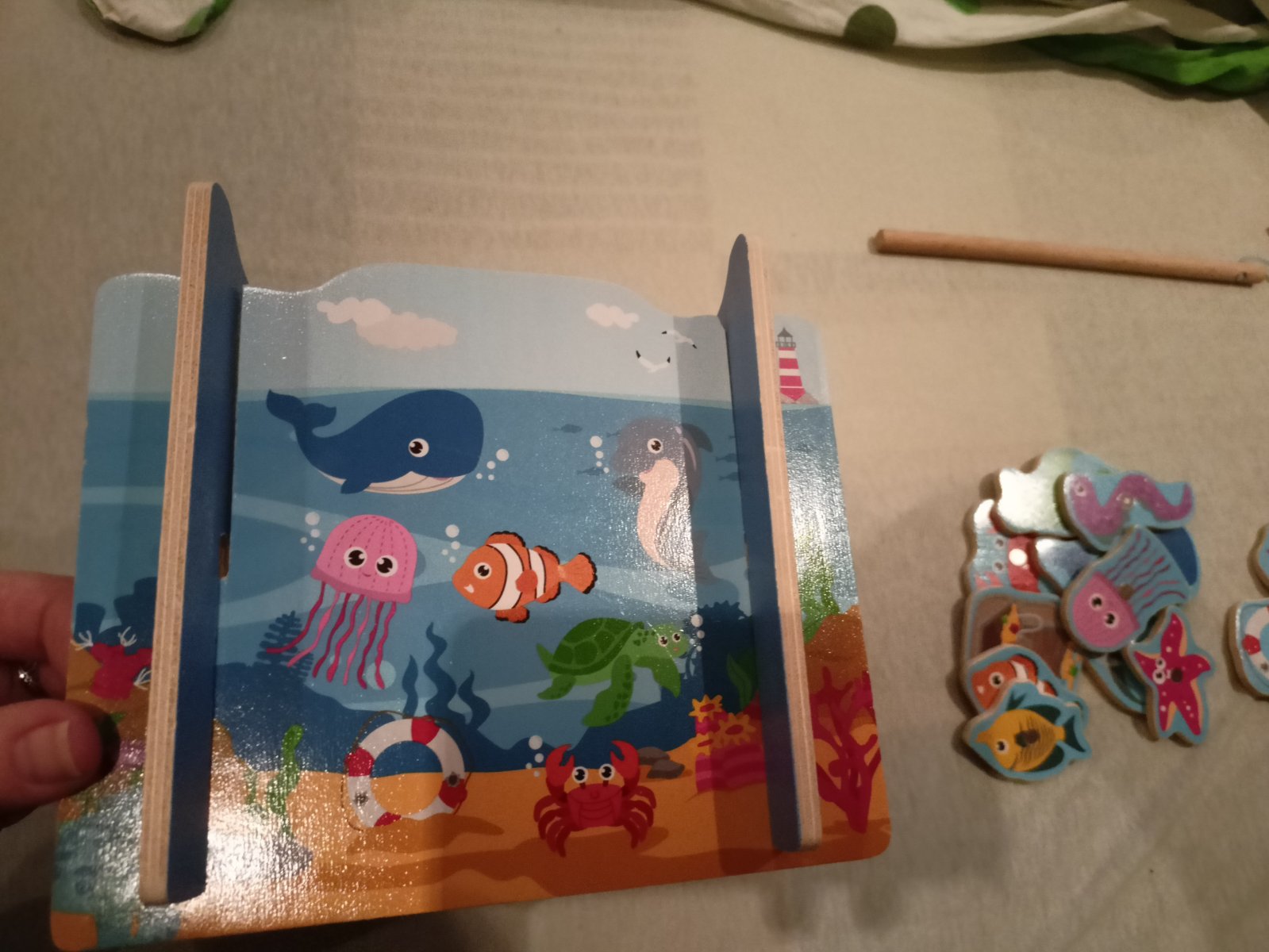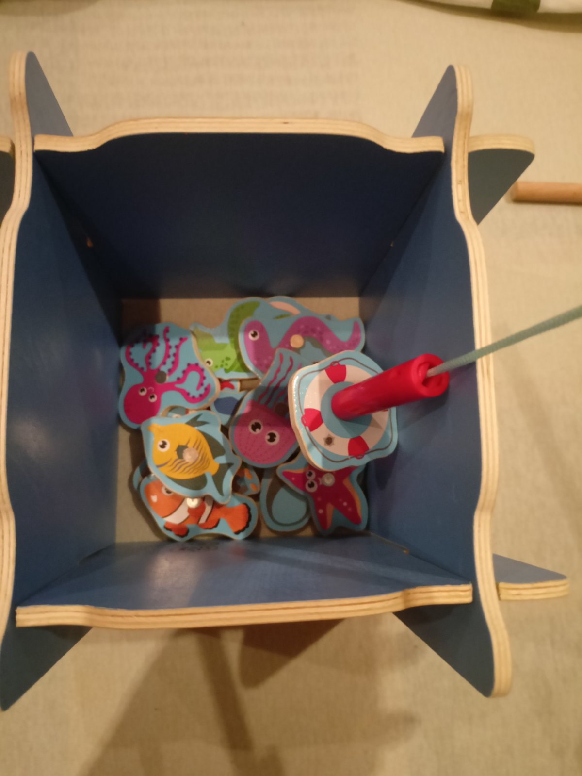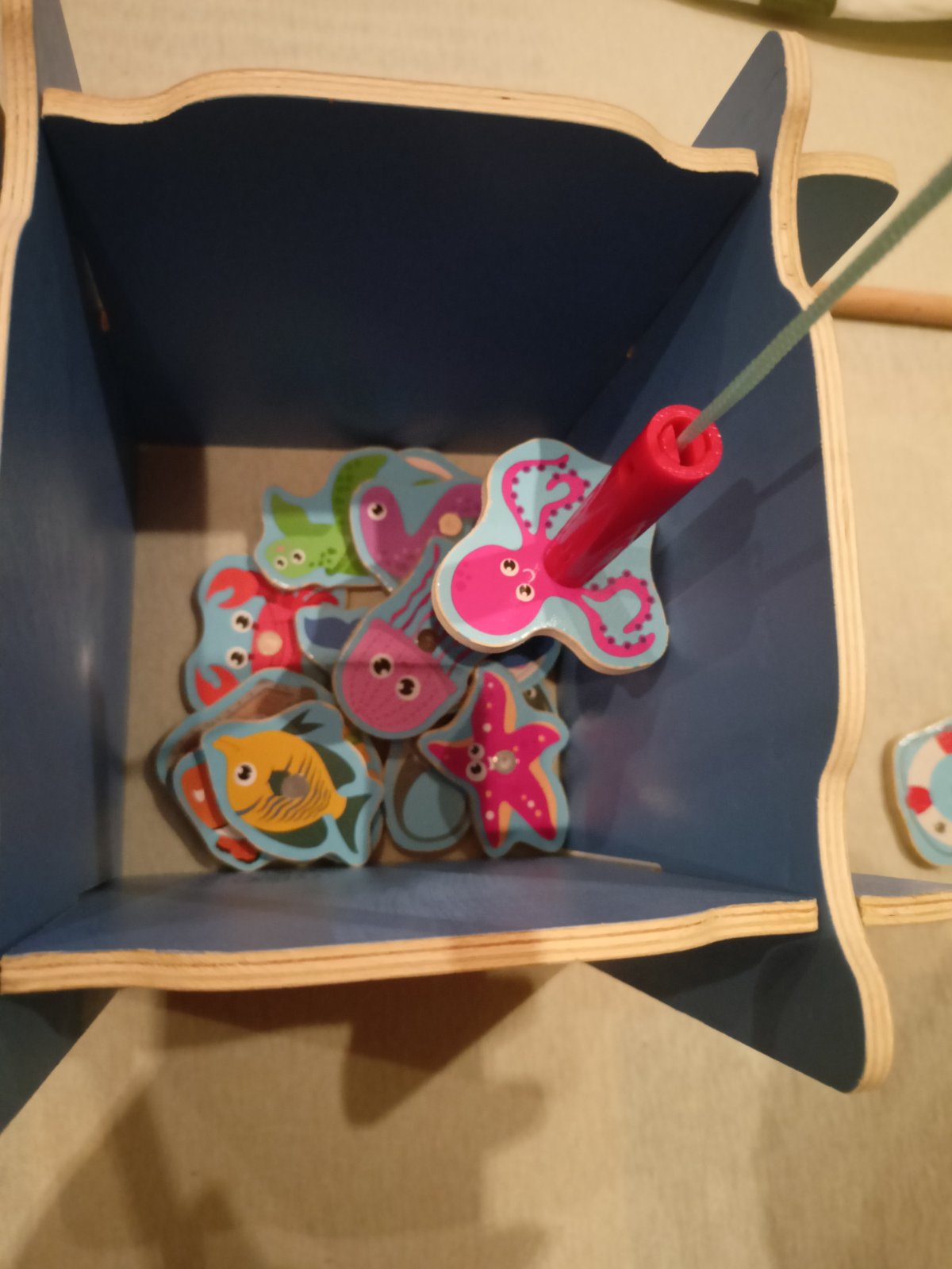 Poštovné v cene, predám drevenú hru, magnetickú - chytanie morských živočíchov na udicu. Môže sa hrať aj ako matematická hra, sčítavanie bodov ( zozadu sú čísla), kto má úlovok za viac bodov. Pôvodnú krabicu už nemám.