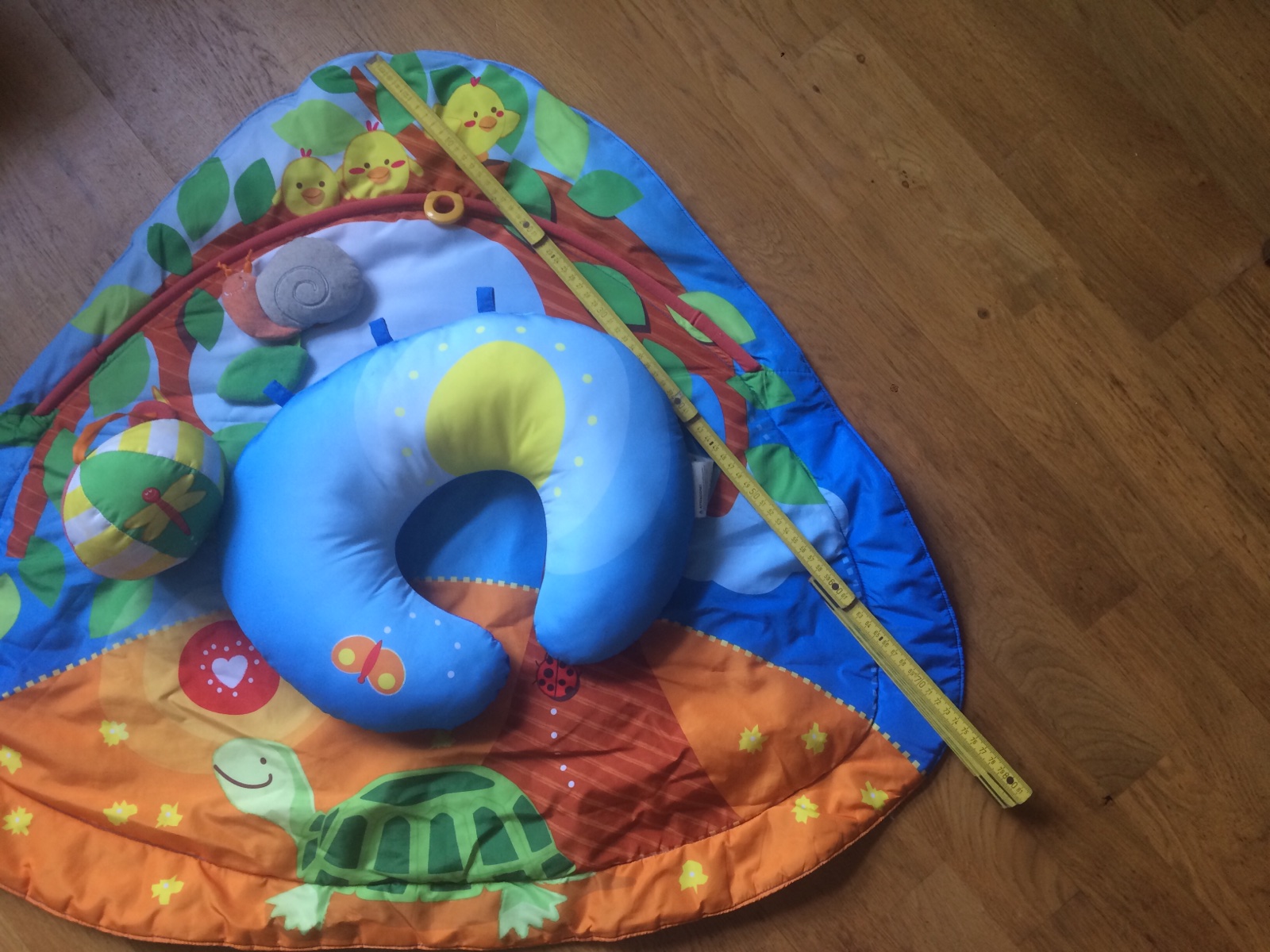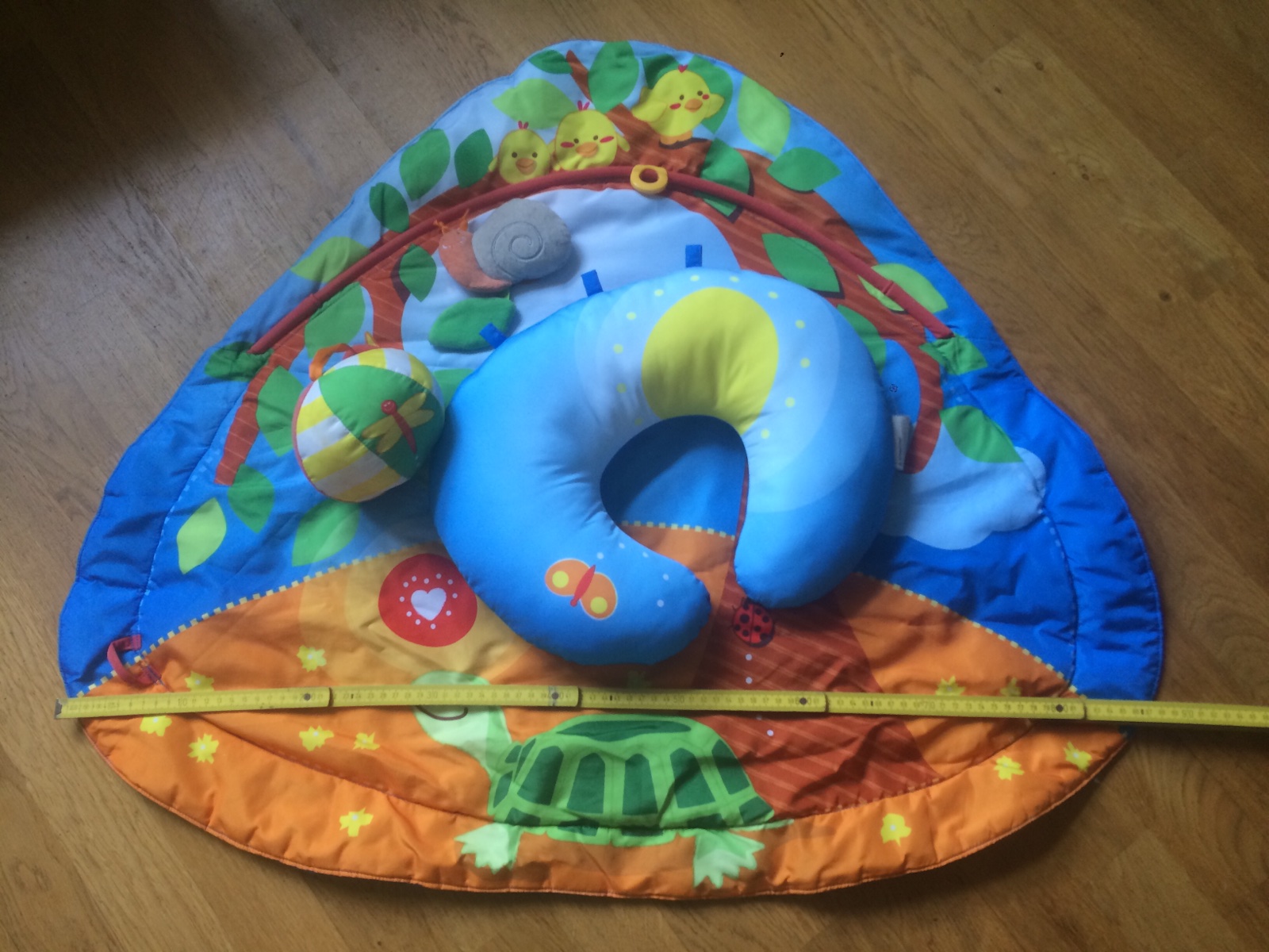 Podložka na hranie s vankusikom ak je už bábätko na brušku, tak ho podoprie a môže sa hrať. Dajú sa na ňu popripinat rôzne hračky, aj na vankúšik. Super do rohového gauči, my sme tak používali. Dá sa prat v práčke.