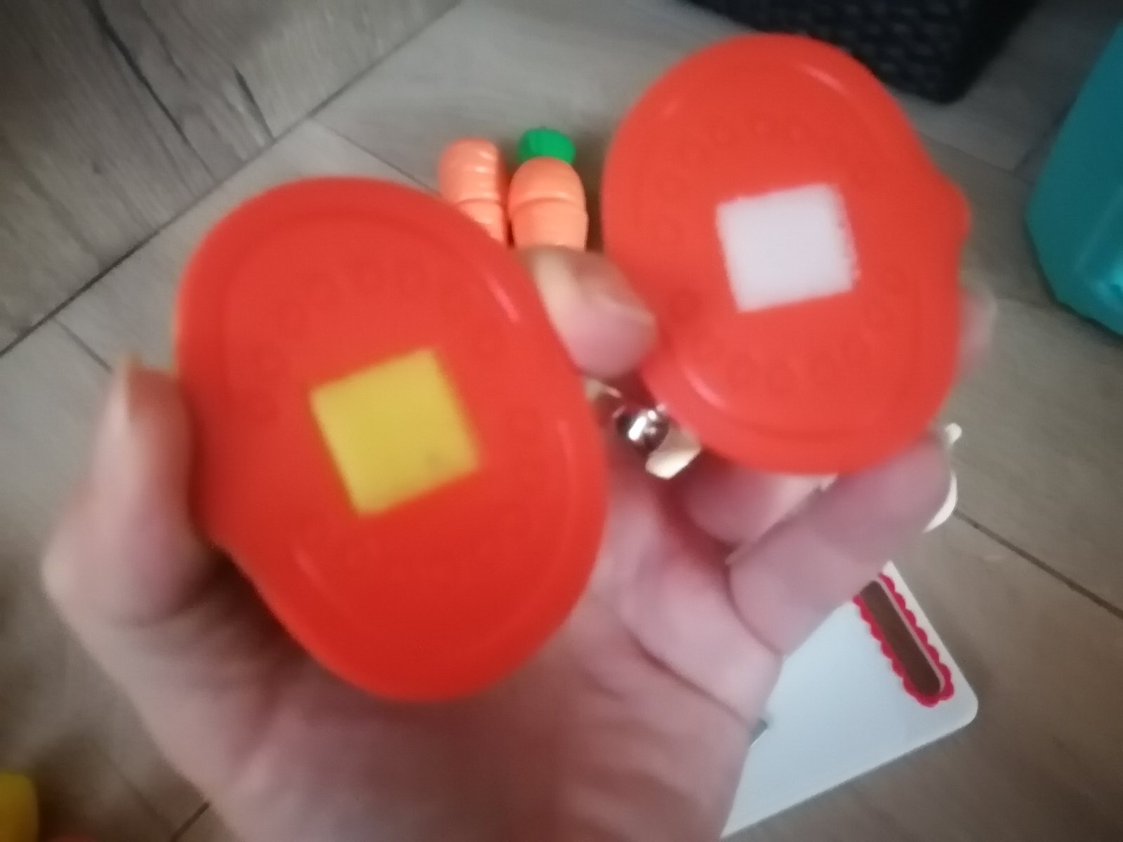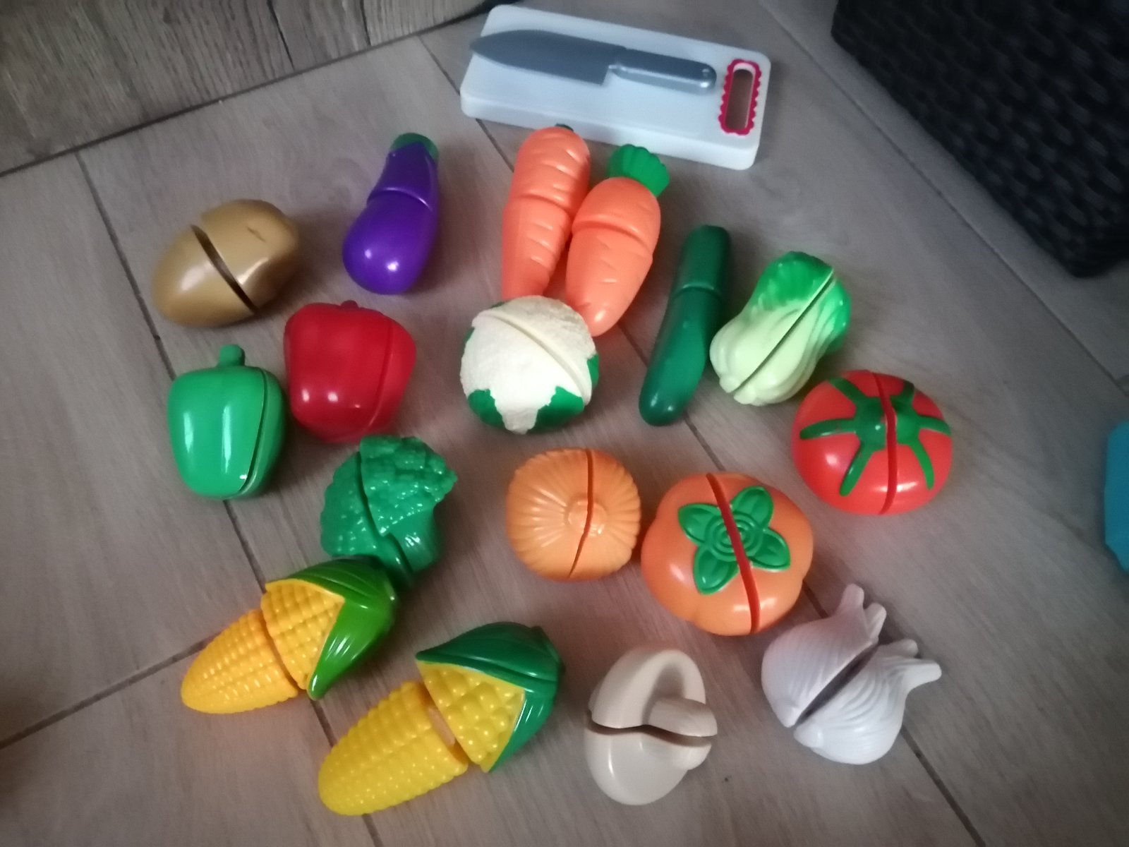Mám dve sady (nie sú úplne rovnaké), lebo sú v nich kúsky zeleniny z inej sady, + nôž + doska na krájanie, do detskej kuchynky, na varenie, suché zipsy držia dobre, krájanie vôbec nie je jednoduché (väčšina, nie všetky majú z jednej strany biely, z druhej žltý suchý zips).
