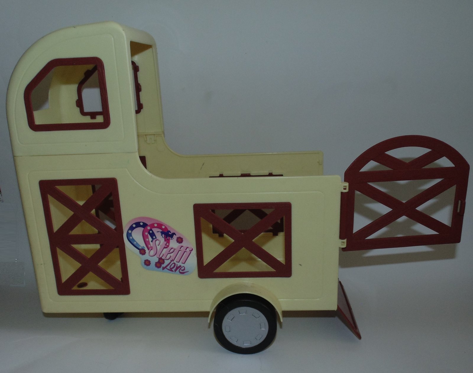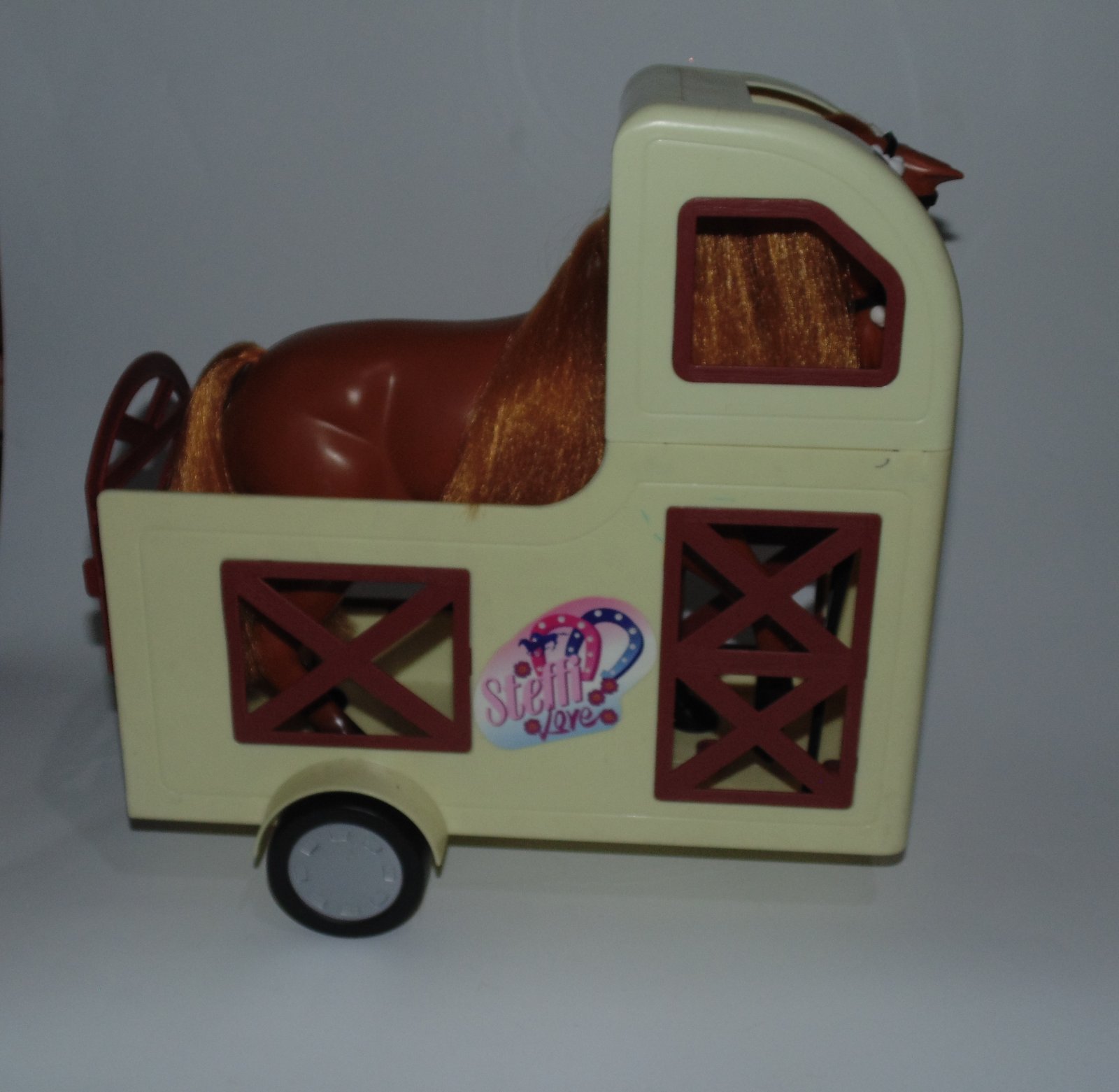 1. Žlto-hnedý príves pre koníky k barbie bábikám. Výrobca Steffi Simba Toys. Koník nie je na predaj, len príves s tromi kolieskami.