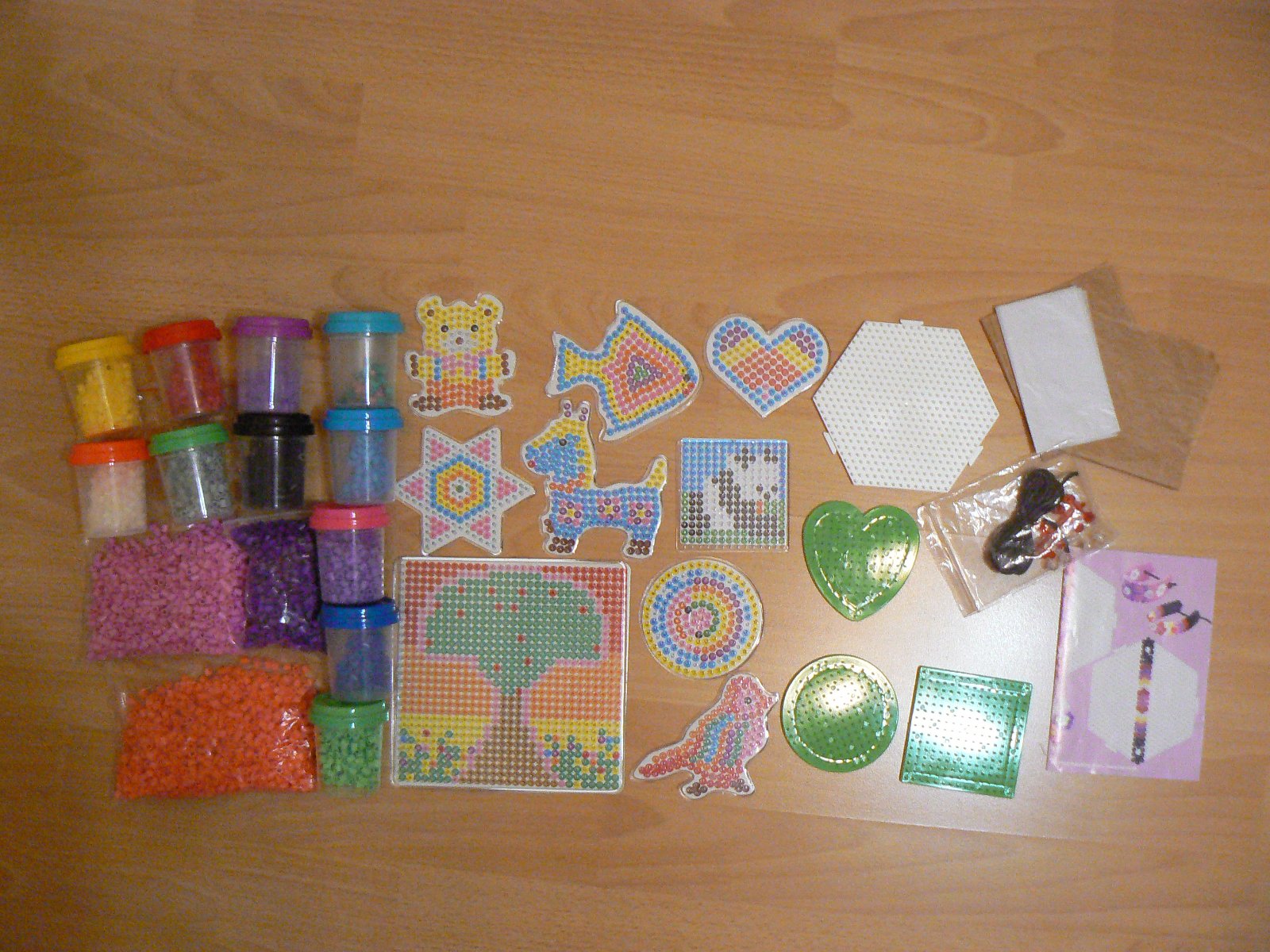 Zažehľovacie korálky v rôznych farbách + príslušenstvo: 13 podložiek (9 z toho aj s predlohou), 3 papiere na zažehľovanie, papier s predlohami a ozdoby.