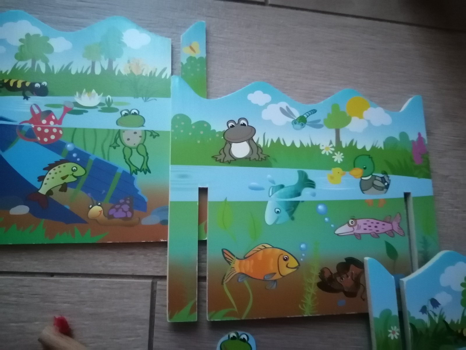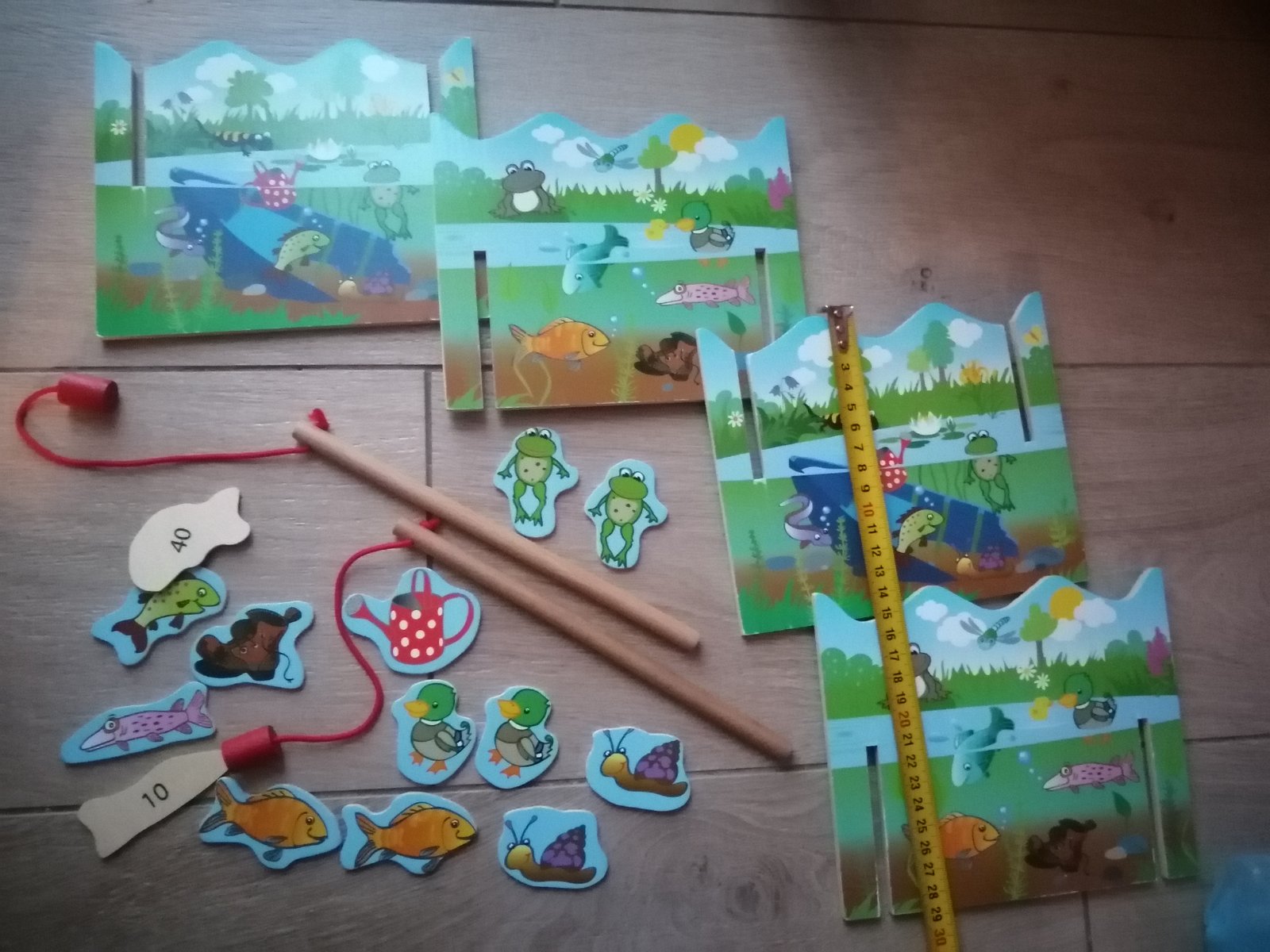 Súprava sa skladá zo 4 x akváriových dielov, ktoré sa dajú poskladať, dvoch rybárskych prútov vybavených magnetmi a 6 párov zábavných vodných živočíchov, ryby, divé kačky, vodné slimáky a žabky a 2 vecami, čo do vody nepatria. Na zadnej strane sú čísla = body. Každá vylovená časť je za body, kapor je za 50, ale stará topánka za 0 bodov. Kto uloví najviac rýb - bodov, stáva sa víťazom.