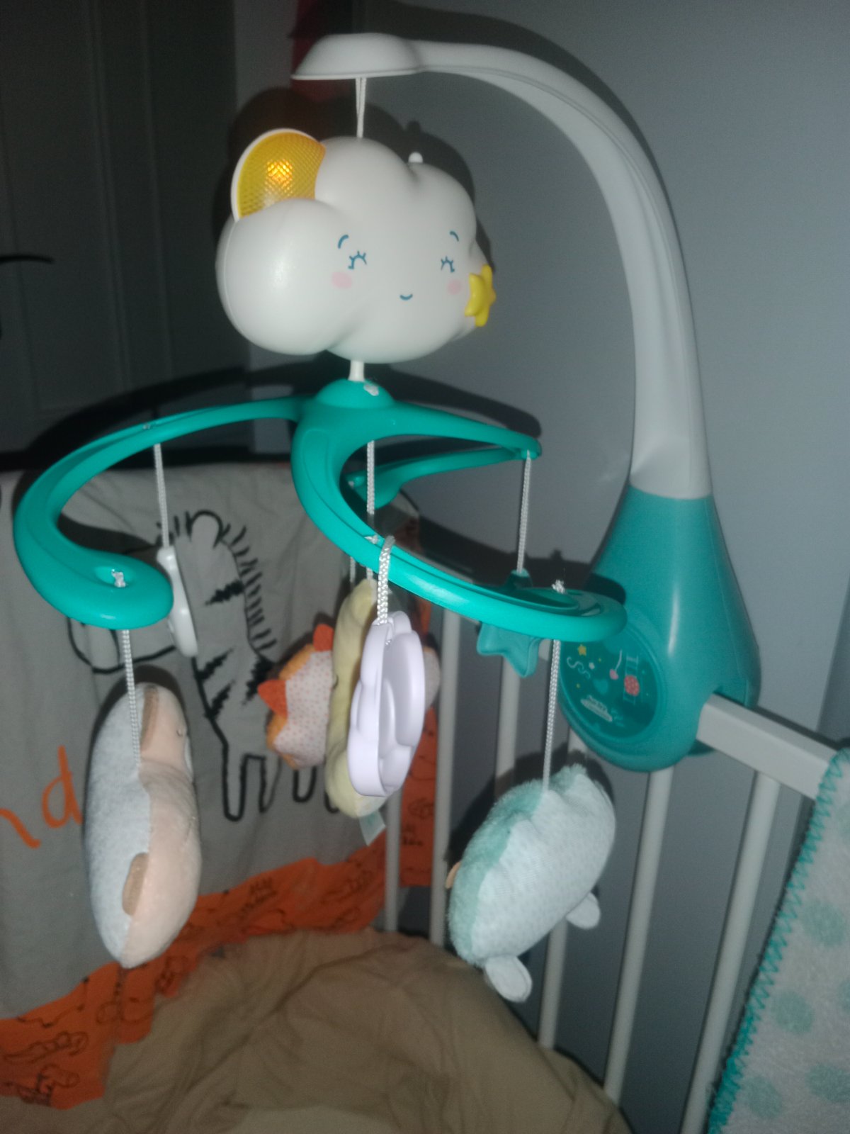 Značka Fisher price. Hrá upokojujúce melódie, bruško sa pohybuje hore dole, lampa svieti, hračka dýcha, bije mu srdiečko. Toto všetko sa dá zvlášť vypínať podľa potreby. Super pomôcka na zaspávani...