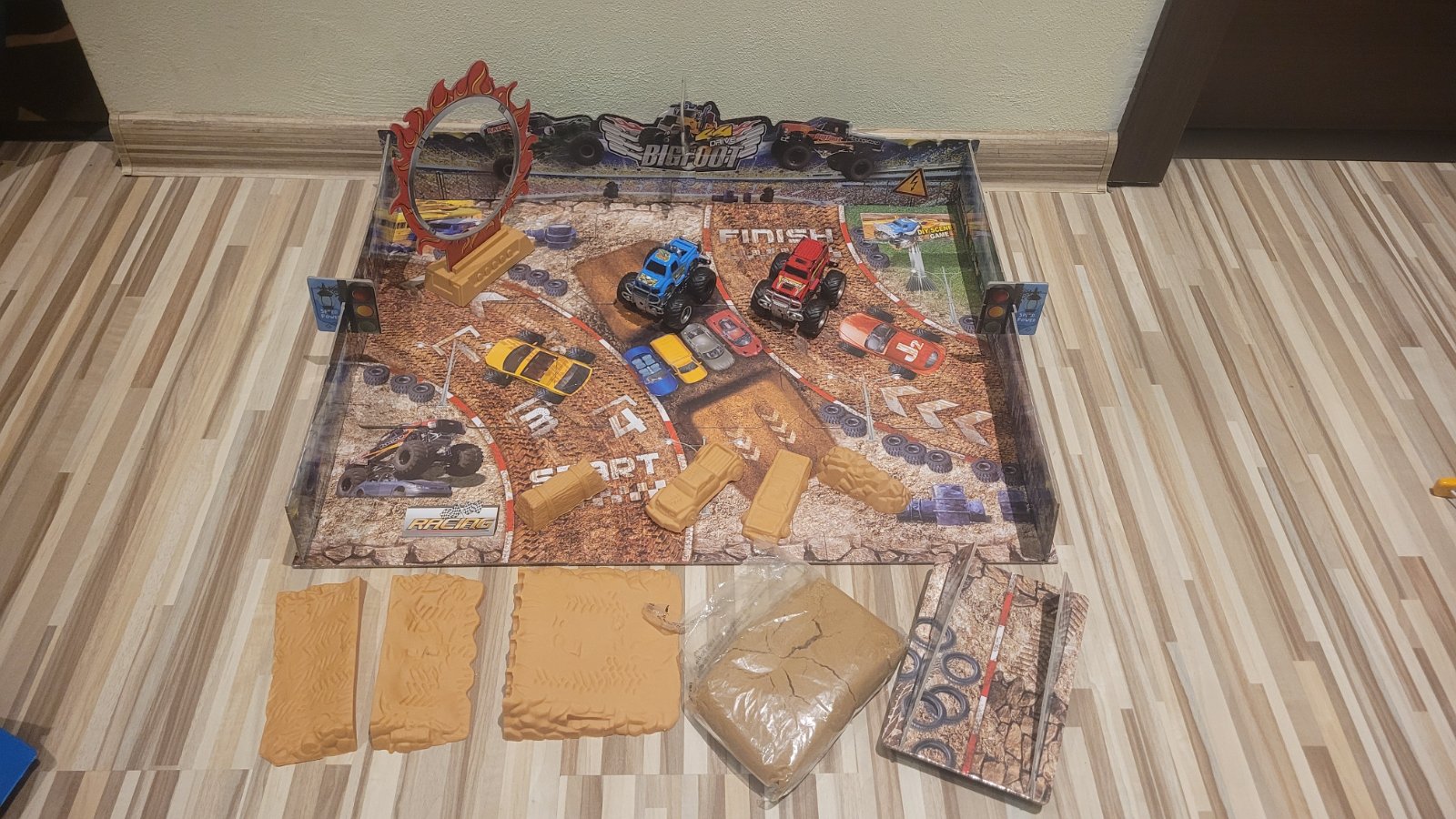 Monster truck arena z pevneho kartonu obsahuje 2 auta, piesok a rozne komponenty