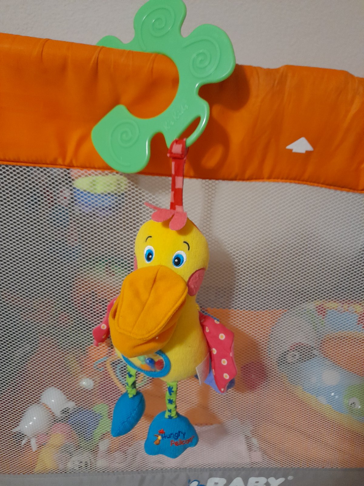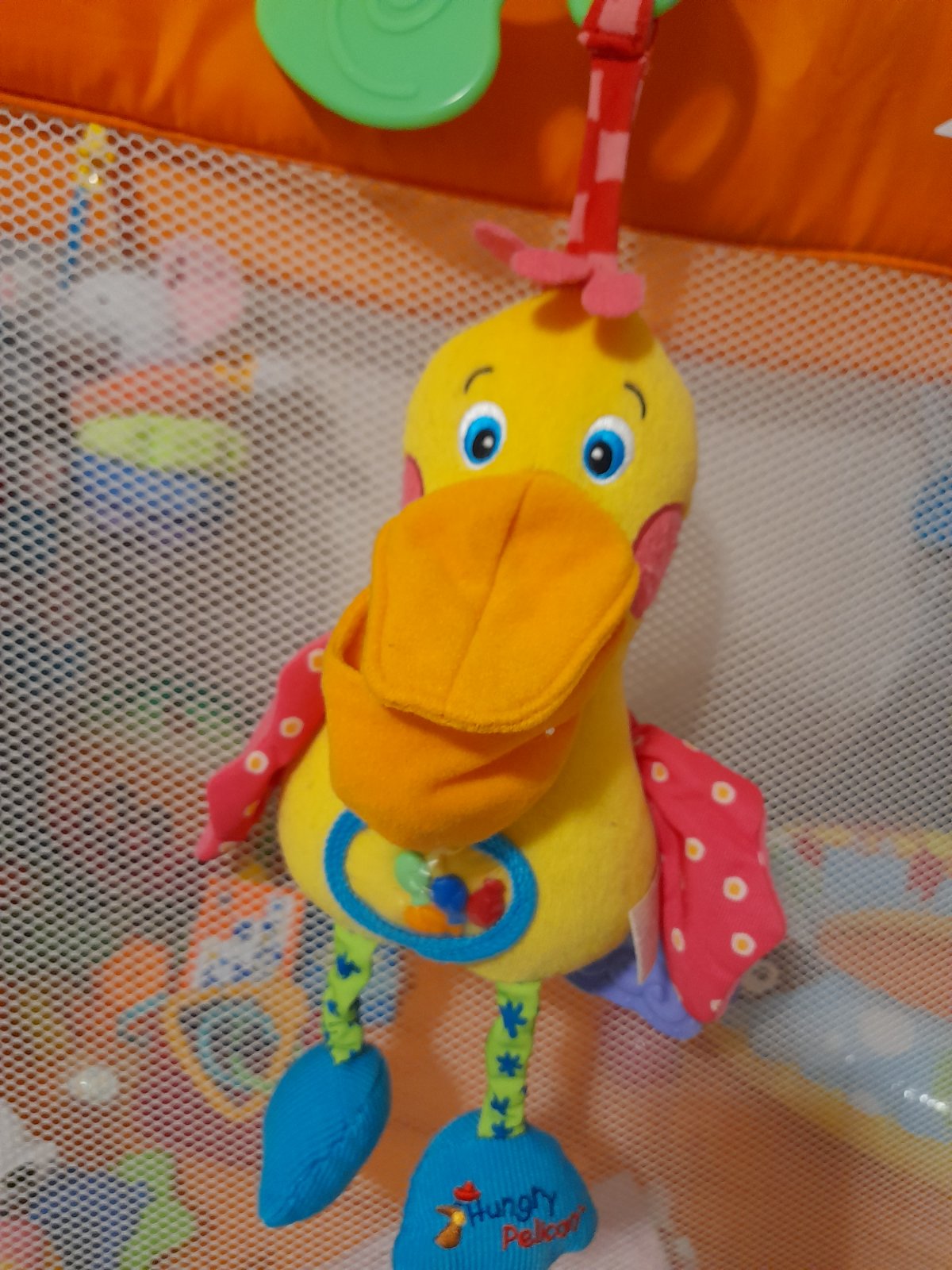 Závesný pelikán, s aktivitami a hryzátkom. Píska, hrkálka, šuští. Krásny stav, bez poškodení.