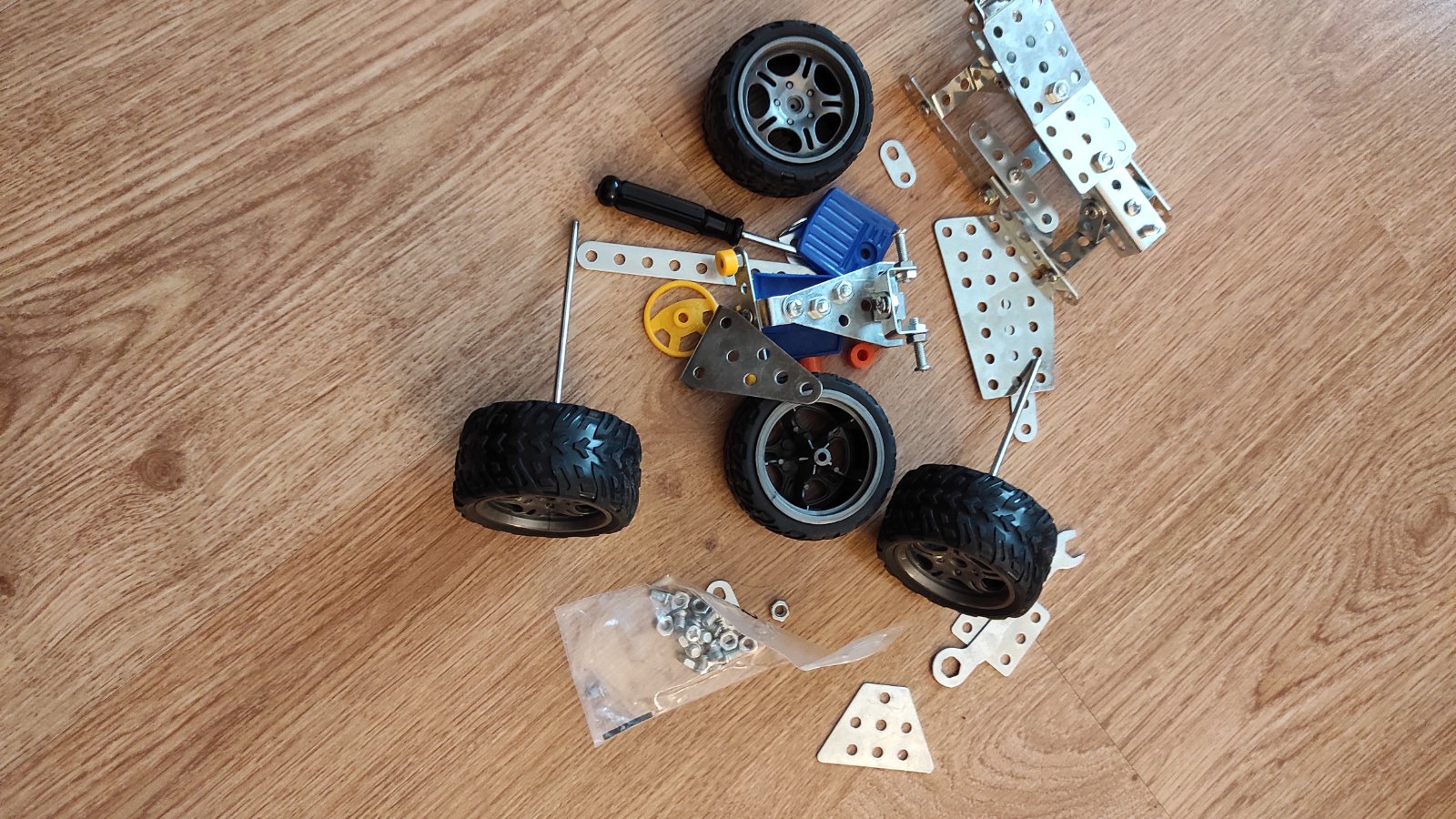 Jedinečná stavebnica pre domácich majstrov pozostávajúca zo 434 prvkov vo forme farebných doštičiek, skrutiek, objímok, plastových prvkov, ako sú kolesá, sedadlá, volant. Vďaka náradiu, ktoré je sú...