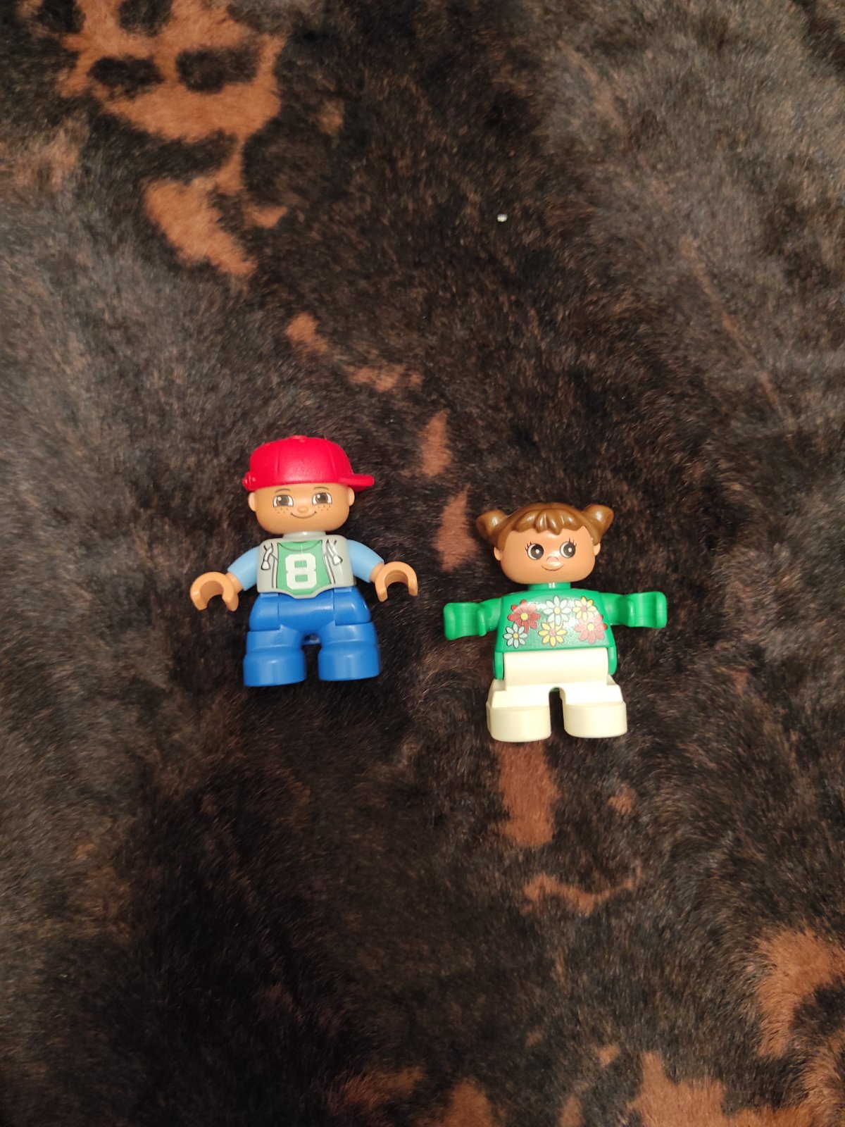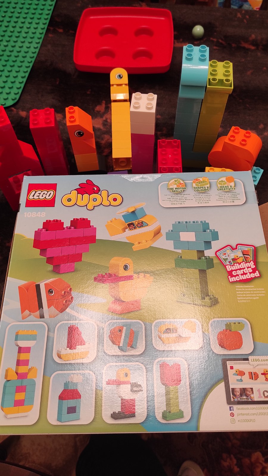 Chybajuce kocky su nahradene kockami v inej farbe (zlta namiesto oranzovej) a misto chybajucej cervenej dam 2 deticky Lego DUPLO (chlapcek a dievcatko)