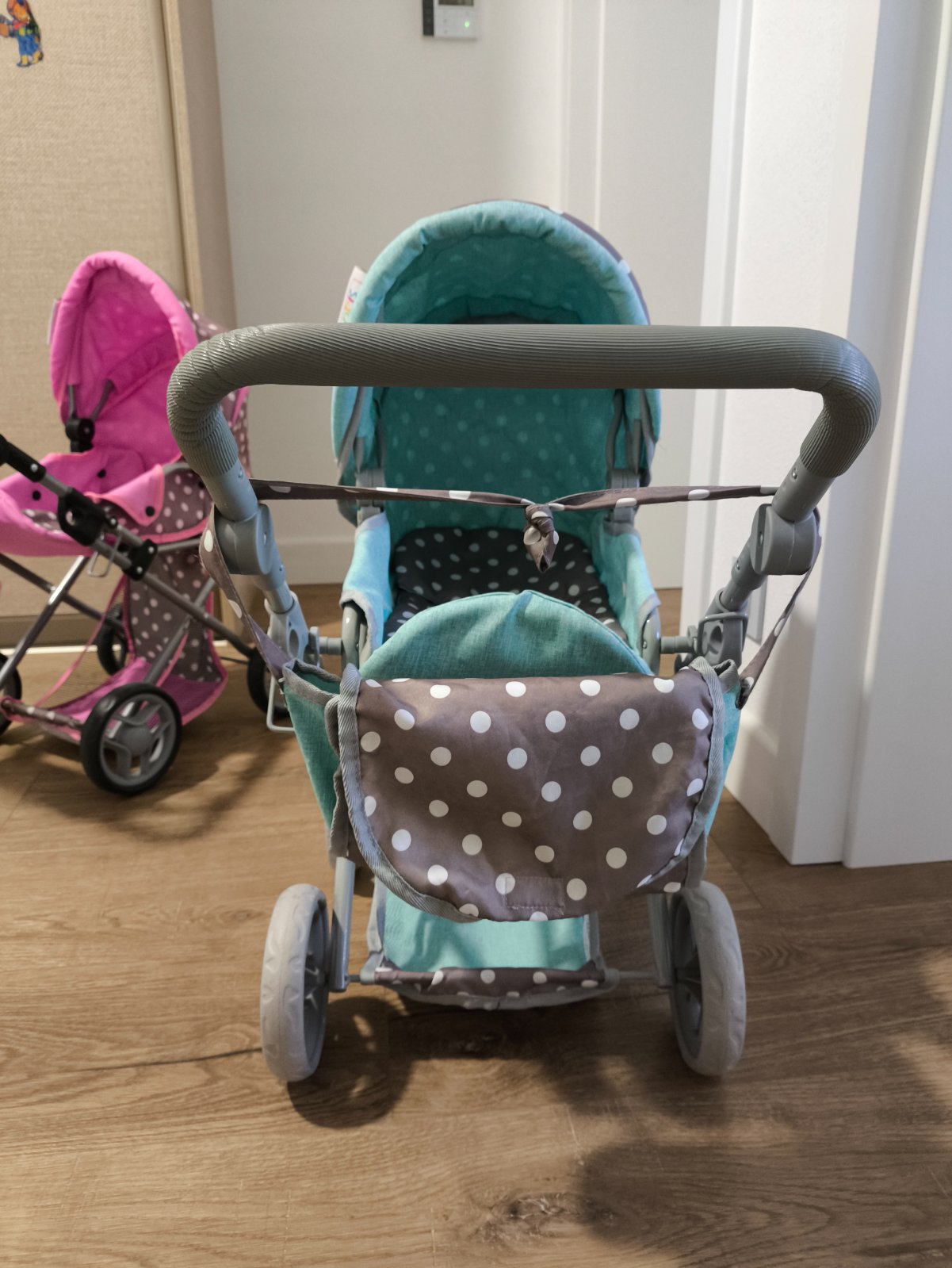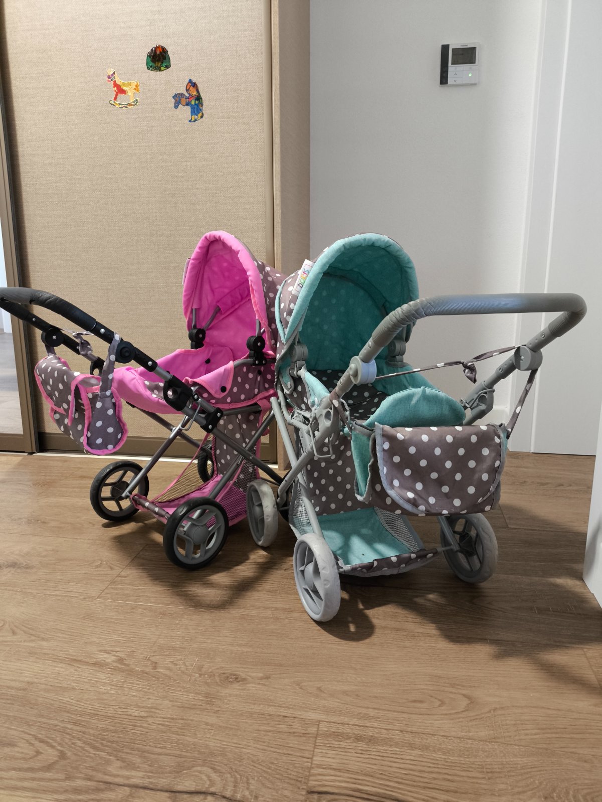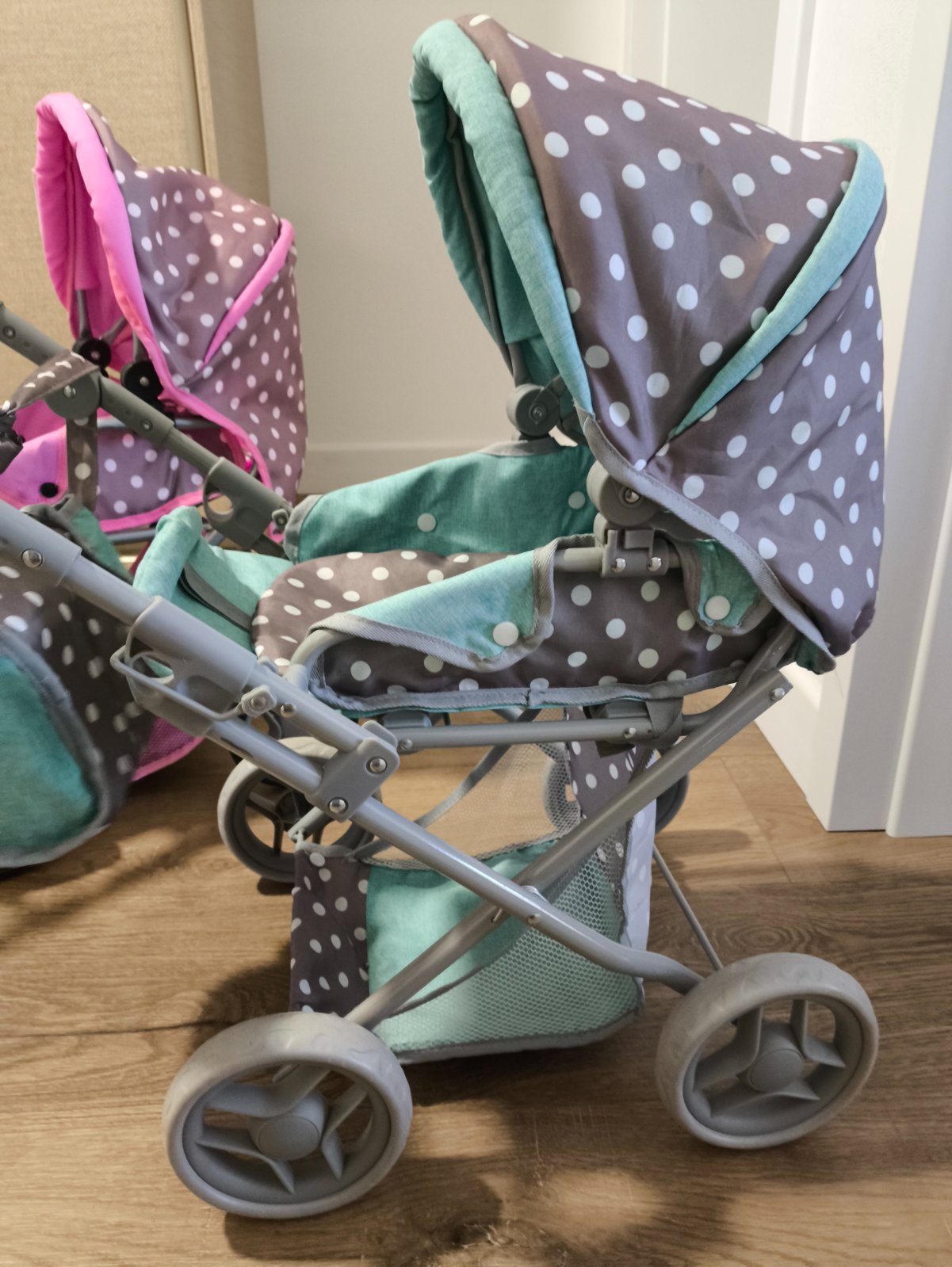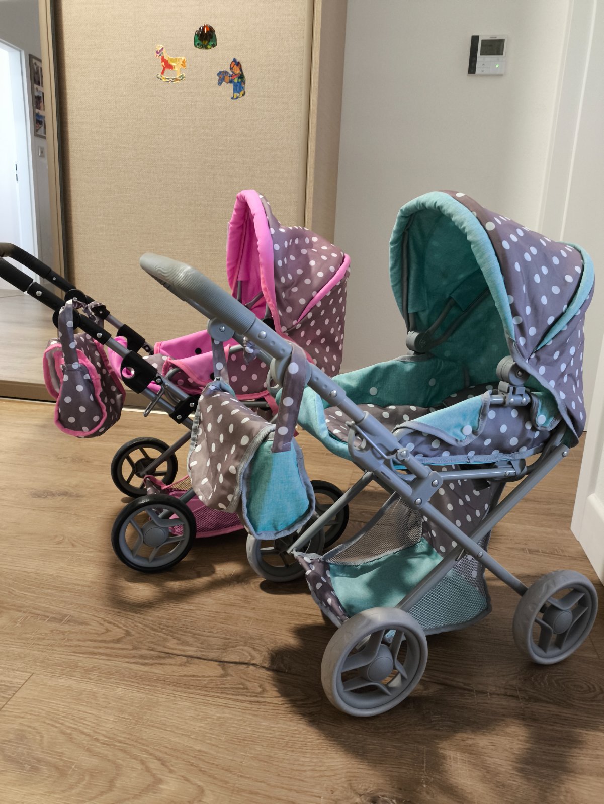 Kočíky boli používané, ale sú vo veľmi dobrom stave. Akurát na ružovom praskla guma na rúčke (asi z tepla) viď foto. V prípade záujmu poposielam detailnejšie fotky. Ku každému kočíku je taška aj vankúšik s paplónom.