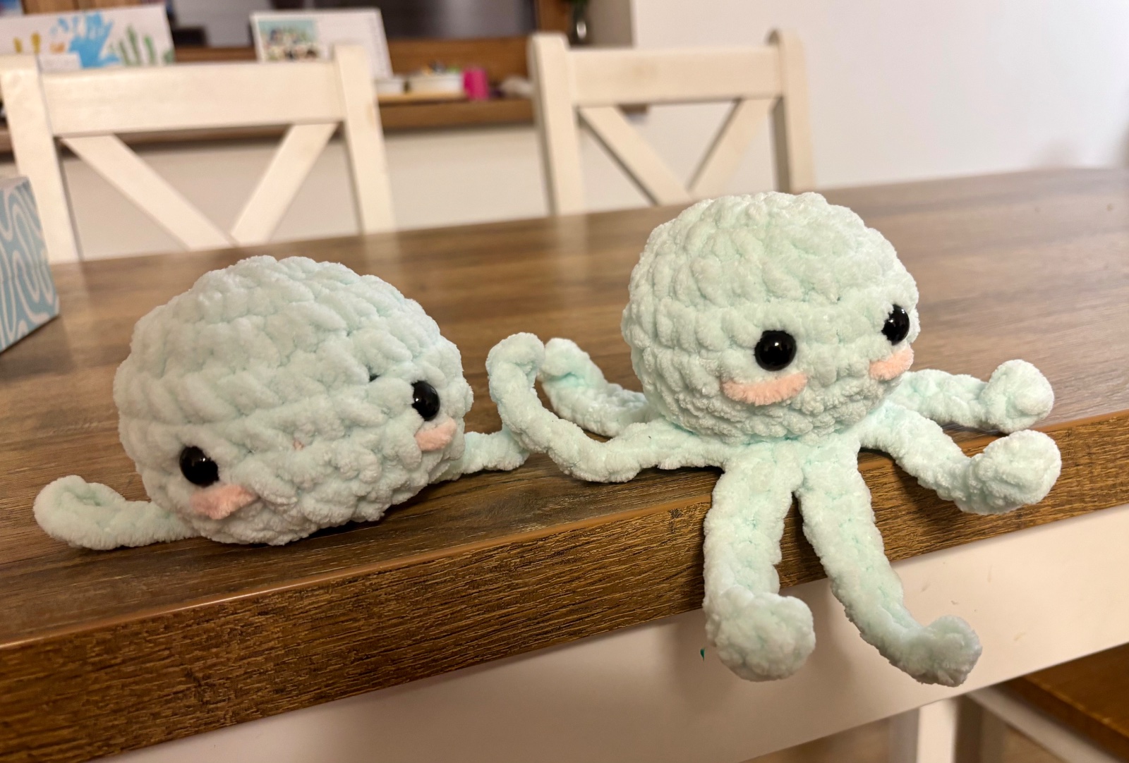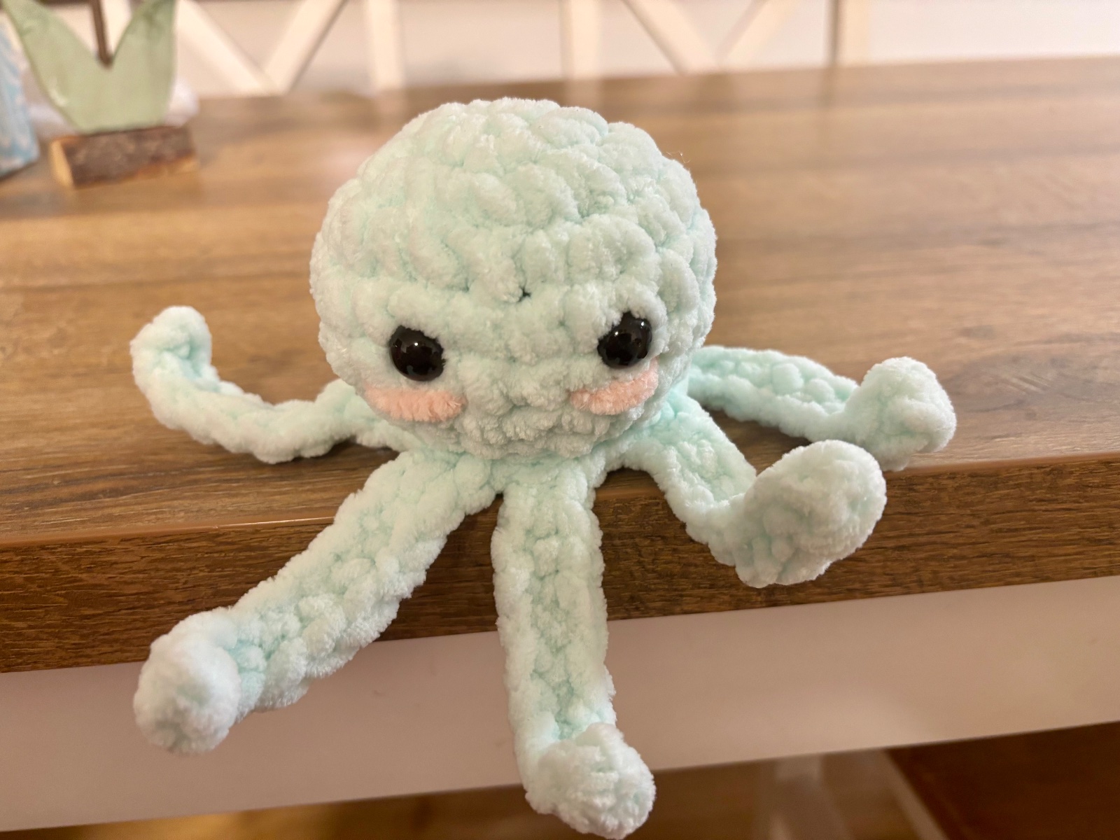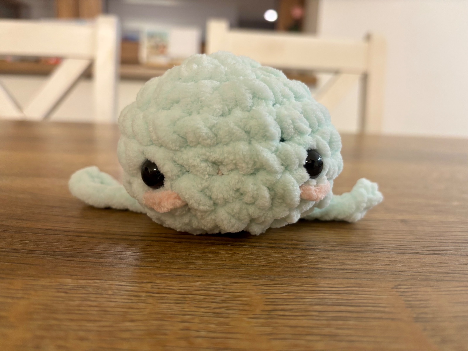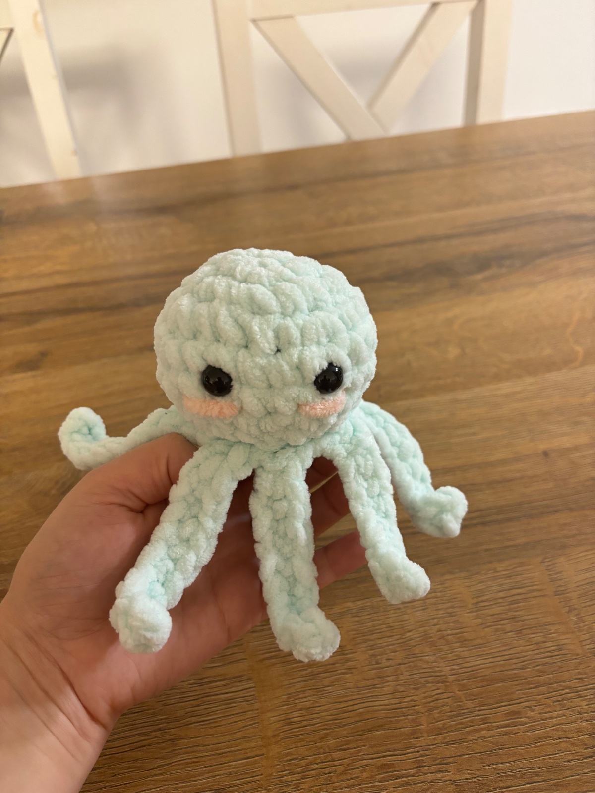 Ručne hackovana nádherná chobotnička s chapadielkami a velrybka. Hand made. Vhodne ako darcek. Hackovala moja 10 rocna dcérka. Chcela, aby jej tvorba urobila radosť niekomu inému. Urcite sa poteší nejaké dievčatko alebo aj chlapček. Cena spolu. Nádherná farba baby blue. Makkucka plnená antialrgickou náplňou, aká sa dáva do vankúšov.
