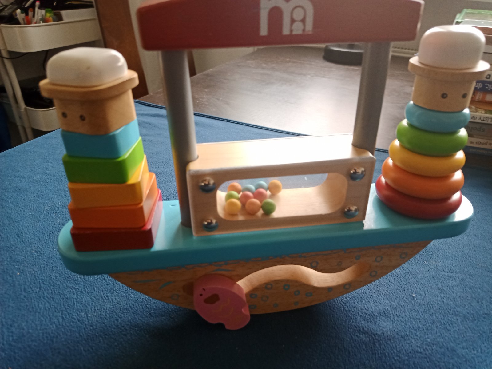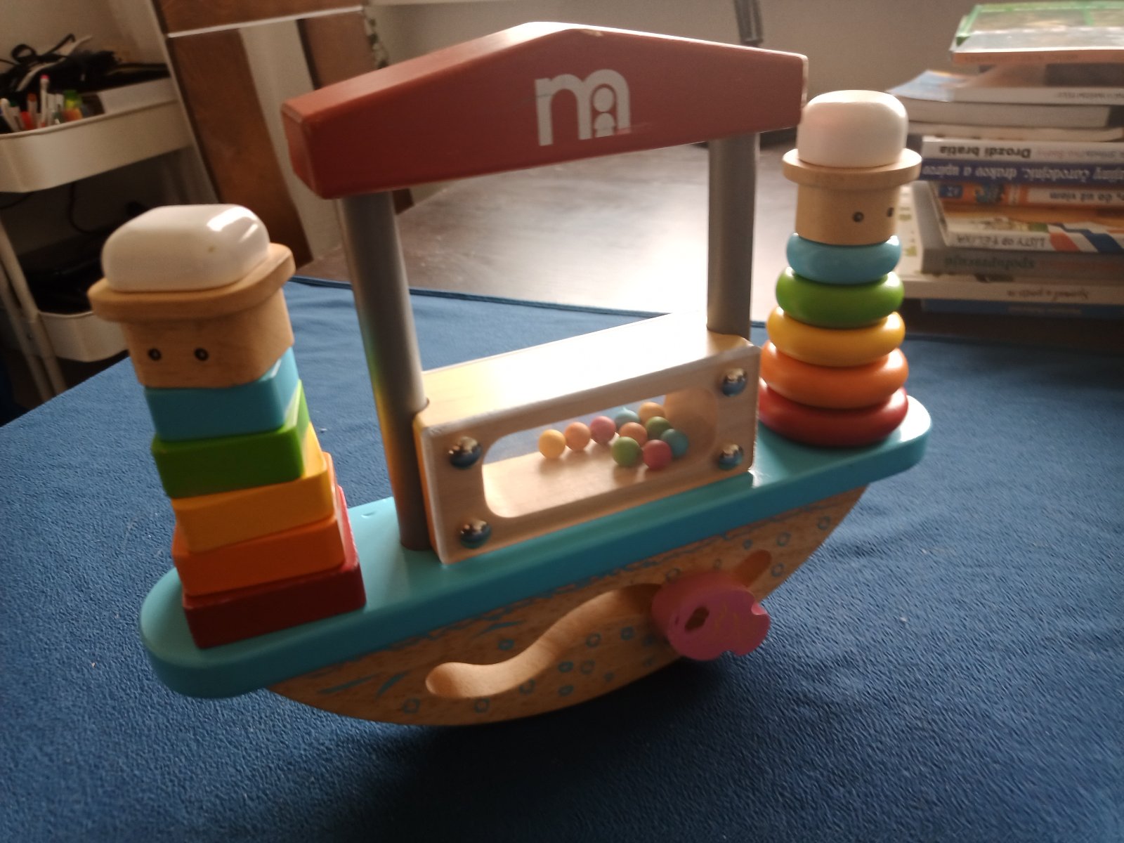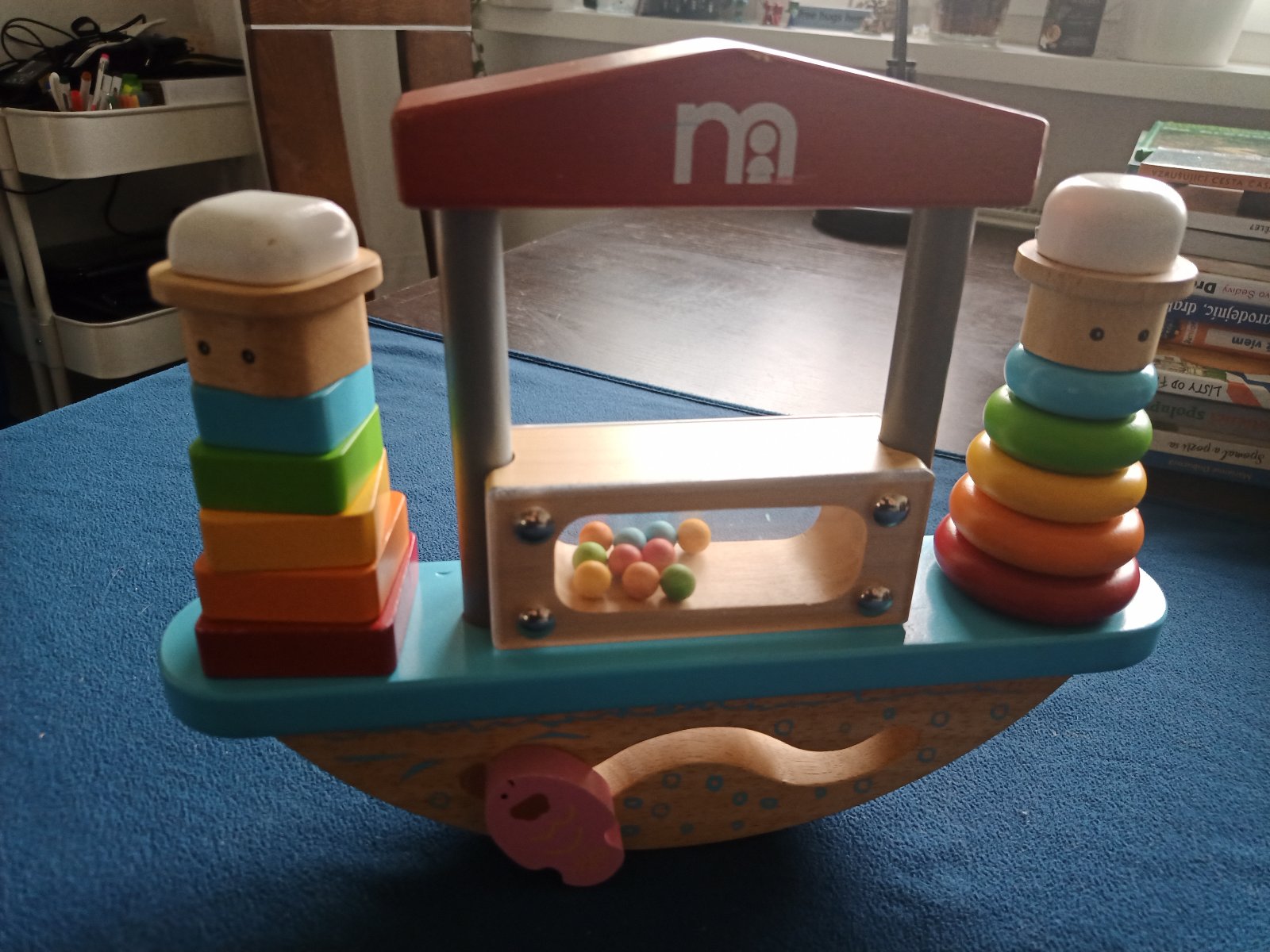 Mothercare balančná hojdačka loď. Masívne drevo, bezpečné farby, kvalitné prevedenie zn. Mothercare. Jednotlivé komponenty fungujú ako navliekačka kruhov a štvorcov, dieliky sa dajú radiť podľa tvaru (štvorce, kruhy), veľkosti (menšie, väčšie), rozvíjajú koordináciu oko ruka. Spodná časť vlnky posúva rybičku. Stredný panel sa dá rovnako navliekať - vnútri guličky (presýpanie evokuje dažďovú palicu - zvukový stimul). Plus celé to funguje ako balančná hračka na vyvažovanie podľa počtu navliekaných komponentov. Super drevená hračka pre batoľatá.
