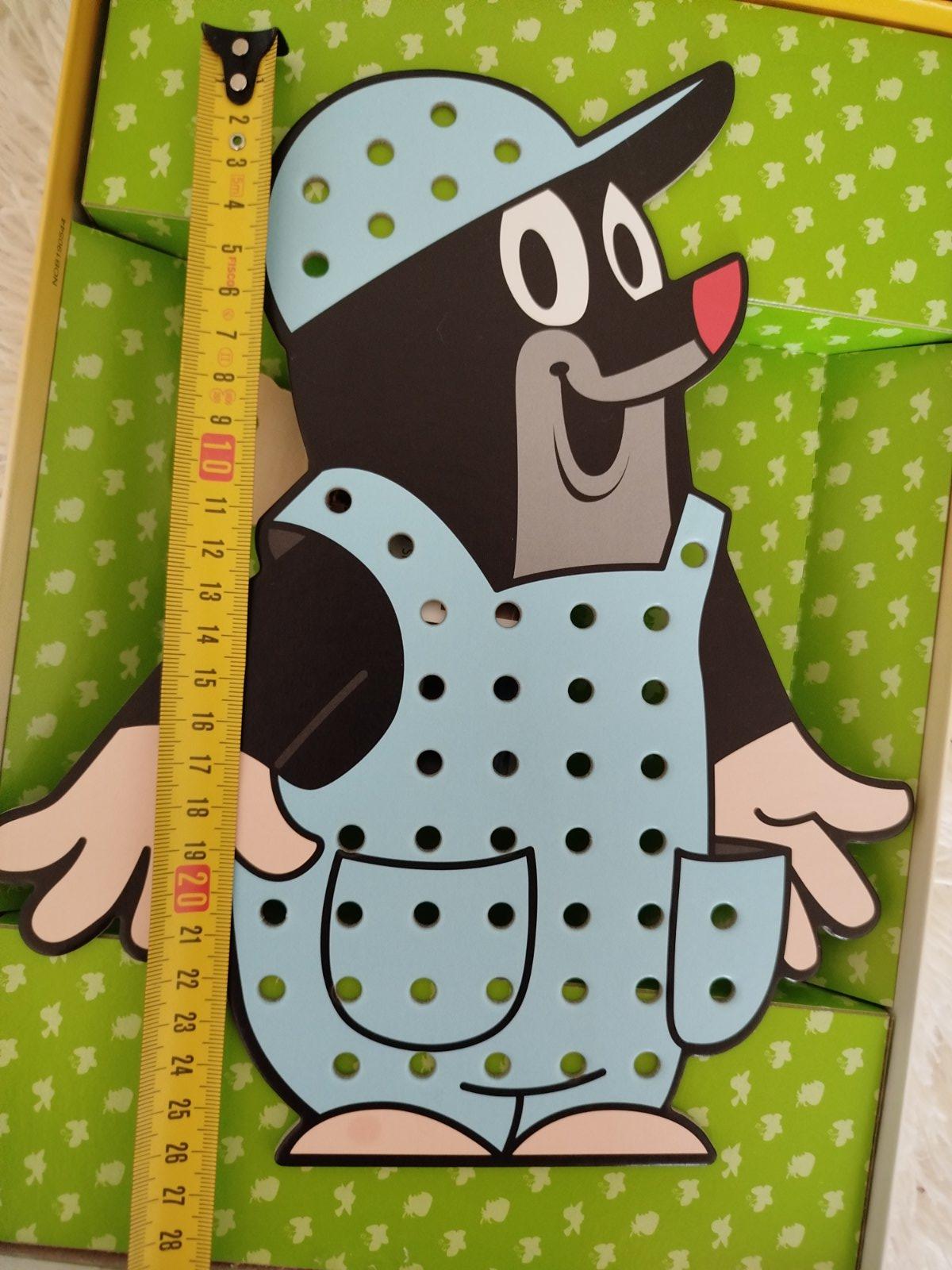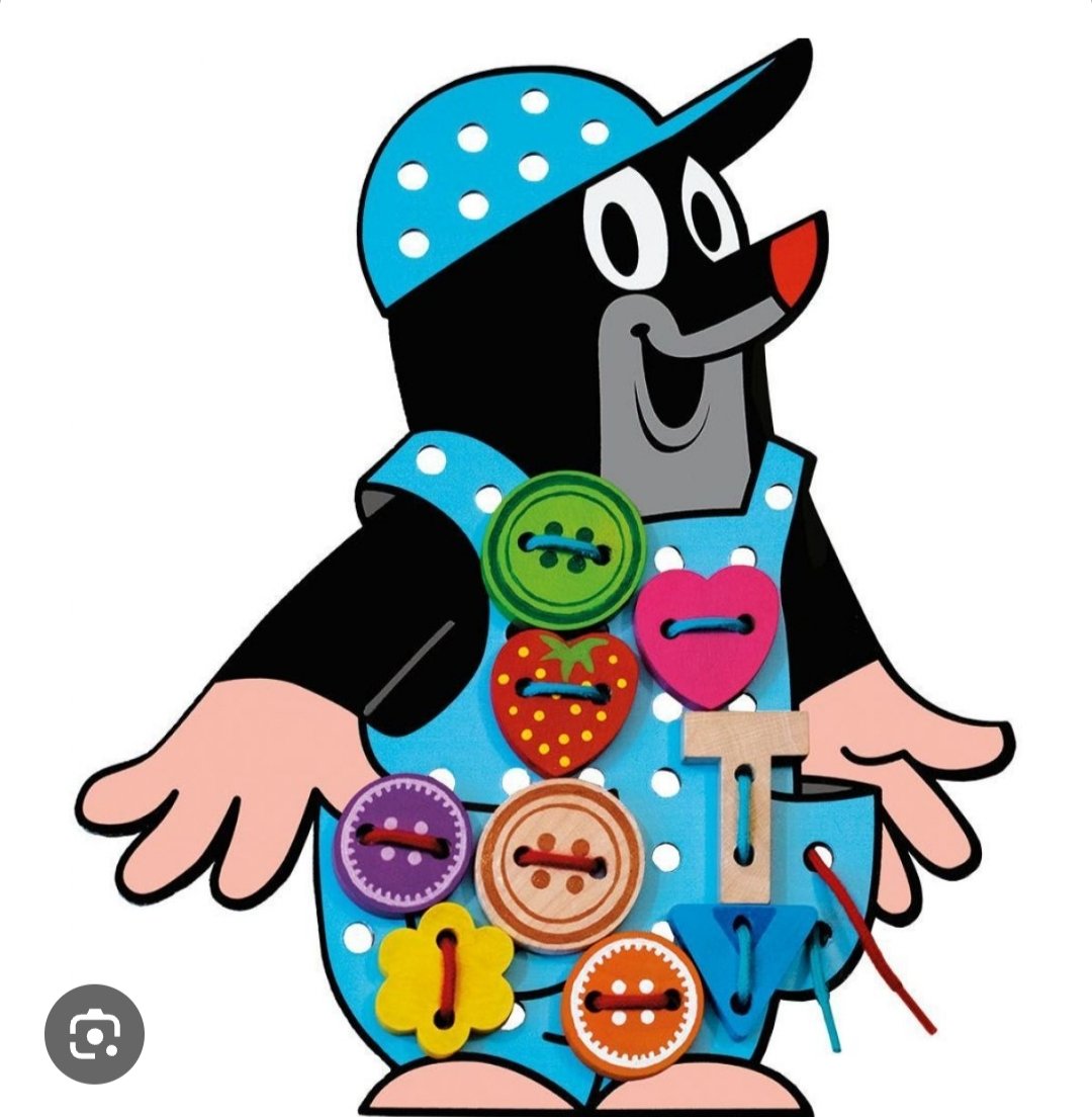 Gombíky sú drevené, samotný krtko je veľký z pevného kartónu, takže sa s ním dobre manipuluje aj detským ručičkám. Z jednej strany má prekvapený výraz, z druhej strany je vysmiaty. Podpora jemnej motoriky a kreativity. Hračka má z jednej strany šuchnutie, dá sa zafarbiť, ale nechcela som maskovať kvôli férovosti. Ostatné časti sú vo výbornom stave.