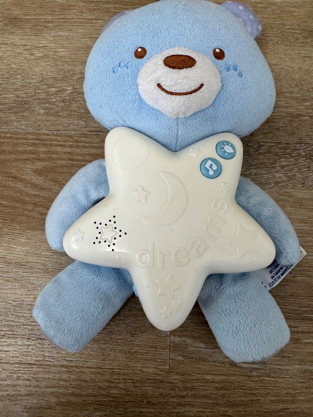 Medvedík na dobrú noc modrý. Mäkký plyšový medvedík z radu First Dreams je zavesený na detskú postieľku s melódiami a nočnou lampou, aby sprevádzal dieťa v čase zaspávania. 10 minút klasickej hudby (Chopin, Brahms) a zvukov prírody (morské vlny, tropický dážď, spev vtáčikov). Nočná lampa v 2 farebných variantoch, ktoré vytvárajú magickú atmosféru počas zaspávania. Dieťa sa hrá so zvukmi a notami a zároveň rozvíja citlivosť na rytmus a hudbu.
