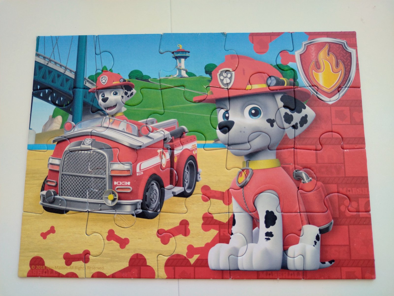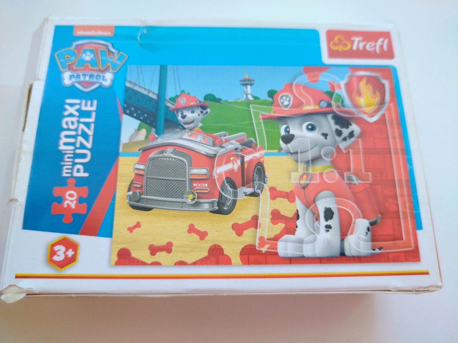 Puzzle Labková patrola s motívom hasičského psa Marshalla od výrobcu Trefl. Táto skladačka obsahuje 20 veľkých (maxi) dielikov, ktoré sú špeciálne navrhnuté pre deti od 3 rokov. Rozmer zloženého obrázku je približne 22 x 16 cm, bez poškodenia.