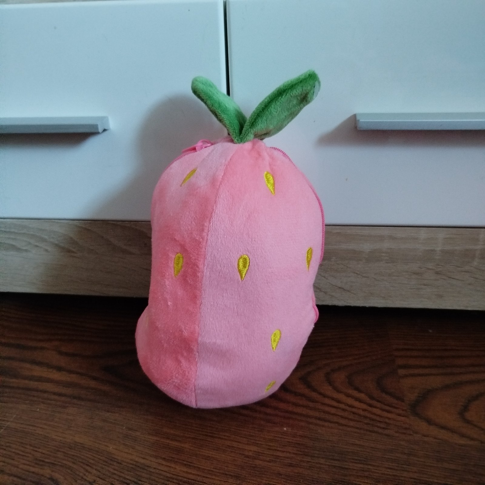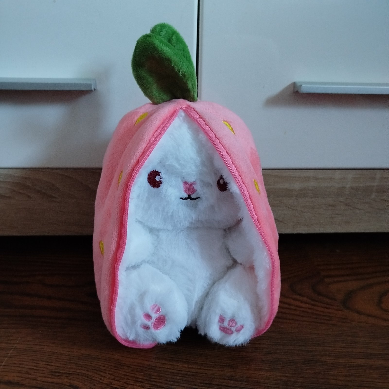 Zajko v jahôdke 18cm, top stav. Je nový, len visačka nám niekde odpadla. Je veľmi milý a hebunký, zatvára a otvára sa zipsom. Cena + pošta.
