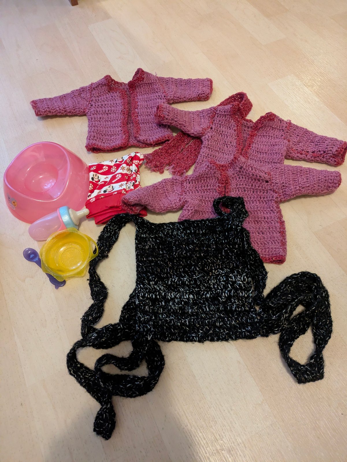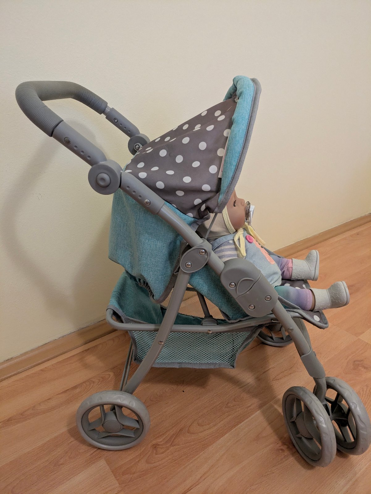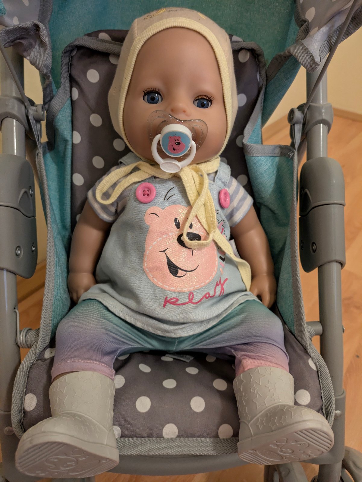 Predám kočík s bábikou a prislušenstvom v peknom stave. Kočík je kvalitný, má nastaviteľnú rukoväť, rastie s dieťaťom. Bábiku je možné kŕmiť, aj jej dávať piť, dokáže cikať. Príslušenstvo - oblečenie, nosič pre bábiky, nočník, veci na kŕmenie.