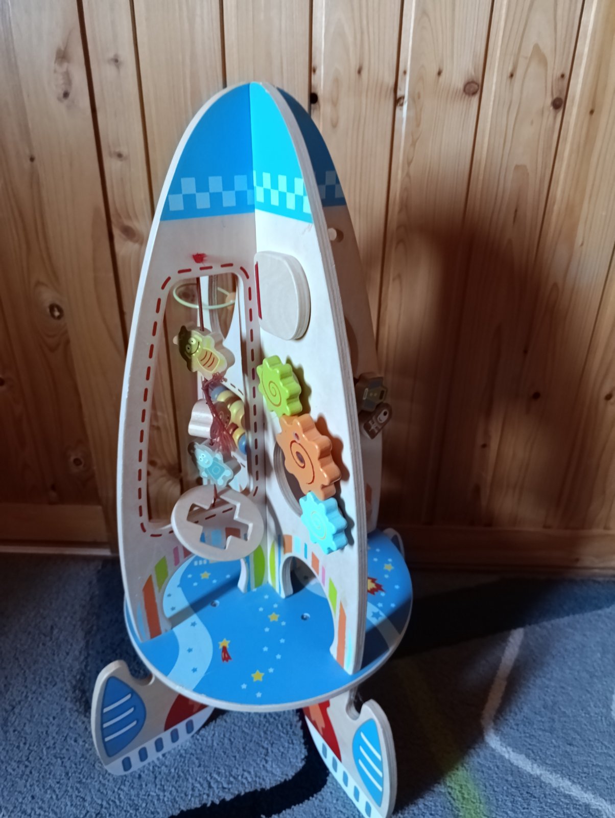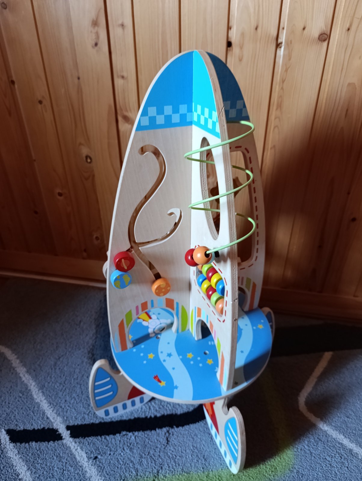 Montessori drevená raketa. Dieťa sa s tým parádne zabaví, vynikajúca na motoriku. Má maličké poškodenie - pretrhla sa tá červená gumička a keďže sme to nevedeli vymeniť tak sme ju len zviazali dokopy ale stále je funkčná. Popis tu: https://www.krajinahraciek.sk/Small-Foot-Motoricka-hra-Raketa-d15622.htm?tab=description