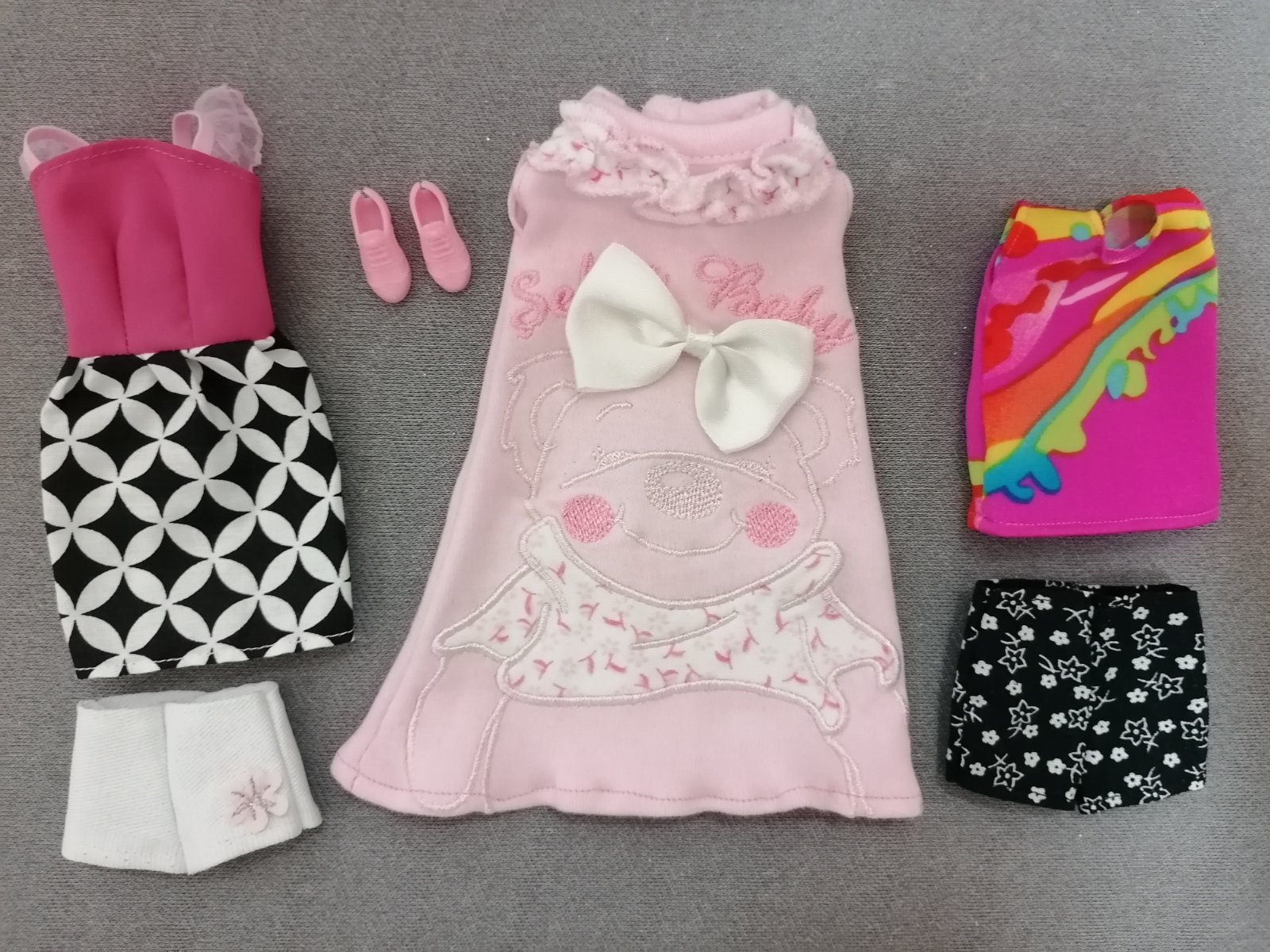 Čerstvo došité handmade oblečenie pre bábiku typu Barbie vysokú 30cm, ľahké obliekanie, zapínanie na suchý zips. Takmer všetko je ušité z kvalitných nových látok, ale nájdu sa aj kúsky z recyklovanej látky. Oblečenie je poriadne ušité, netrhá sa, nepára sa.