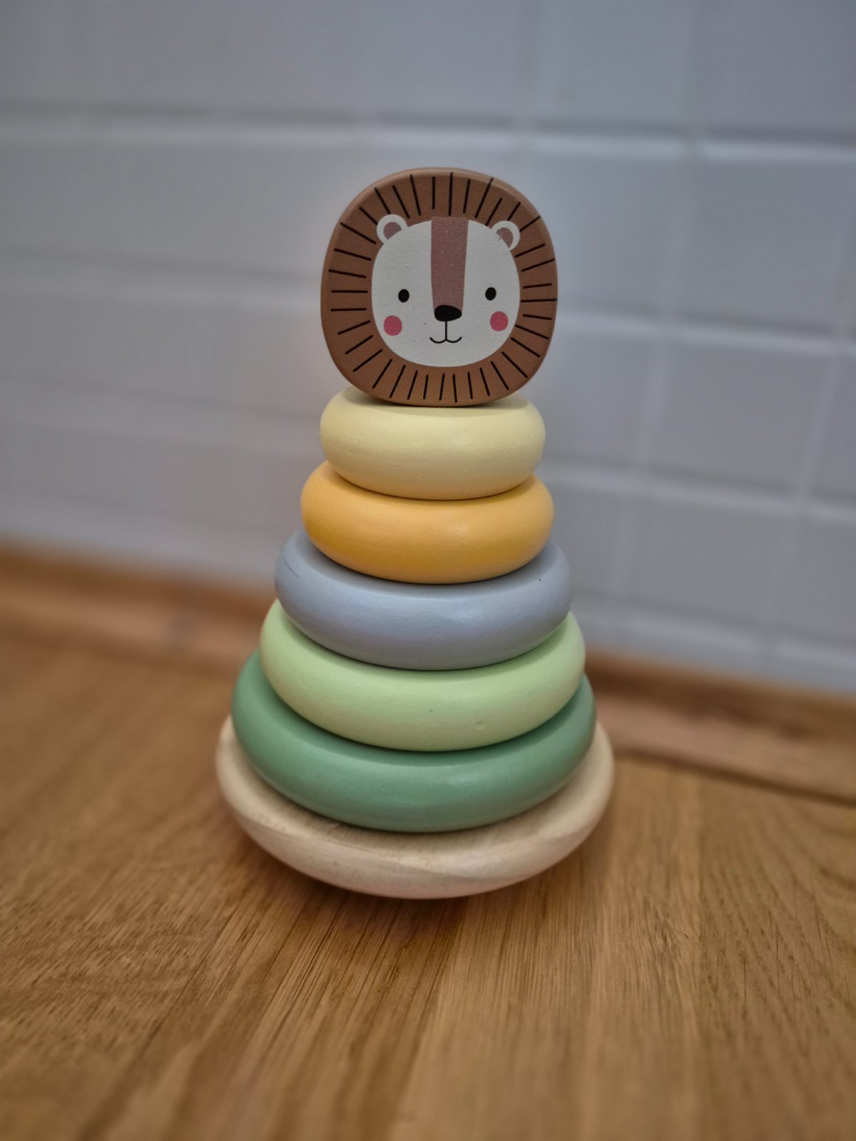 Ponúkam v top stave motorickú nasadzovaciu hračku Lev Pastel od značky Tooky Toy.