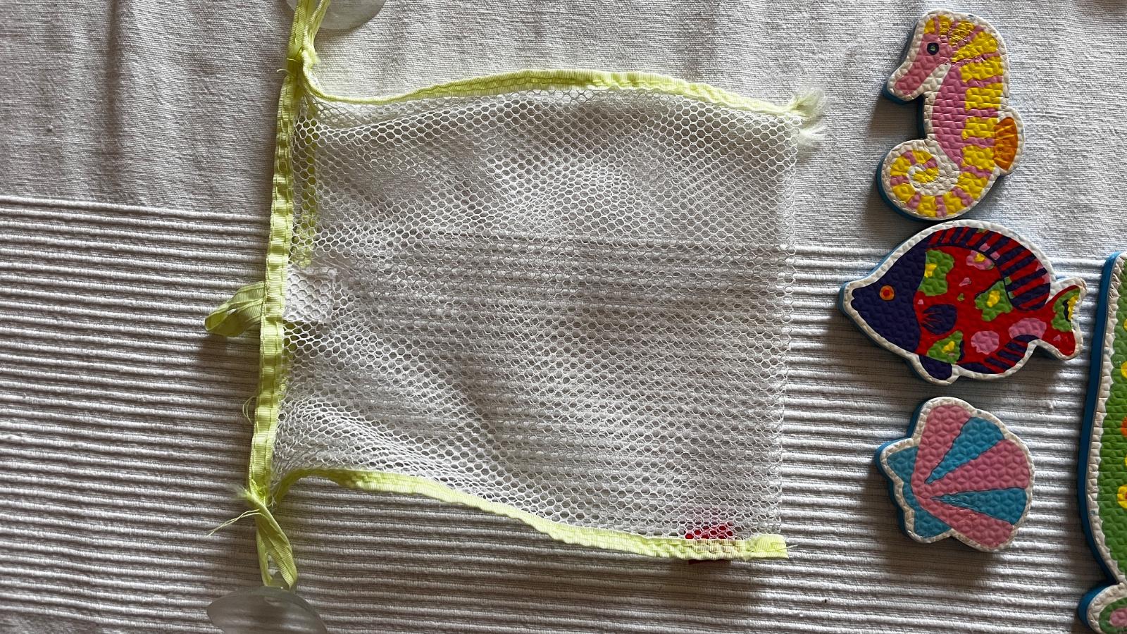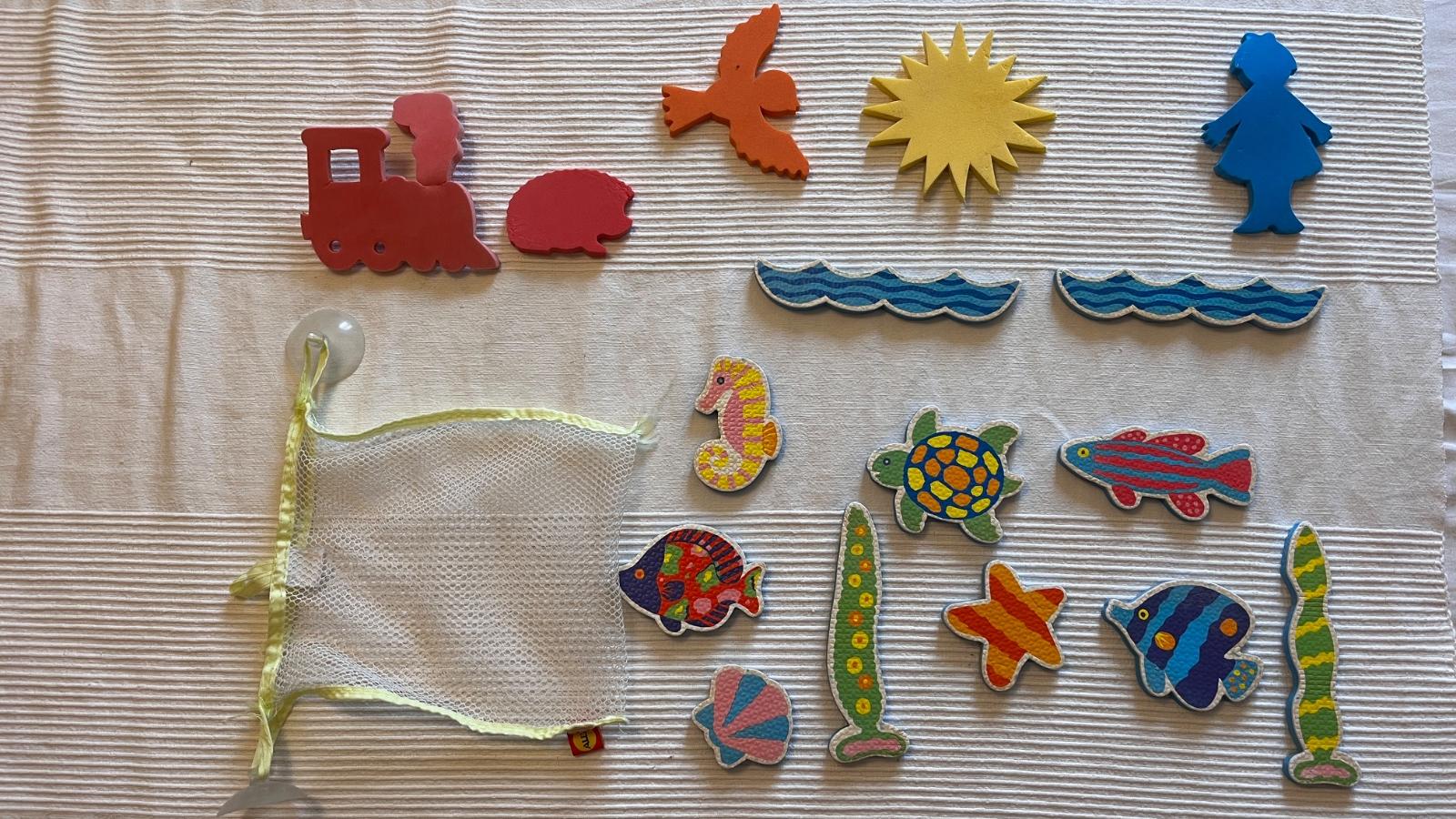 11ks morské a 5ks suchozemské, za mokra držia na stene vane alebo kachličkách, nenasiakavé, praktické sieťkované vrecko s prísavkami na odkvapkanie