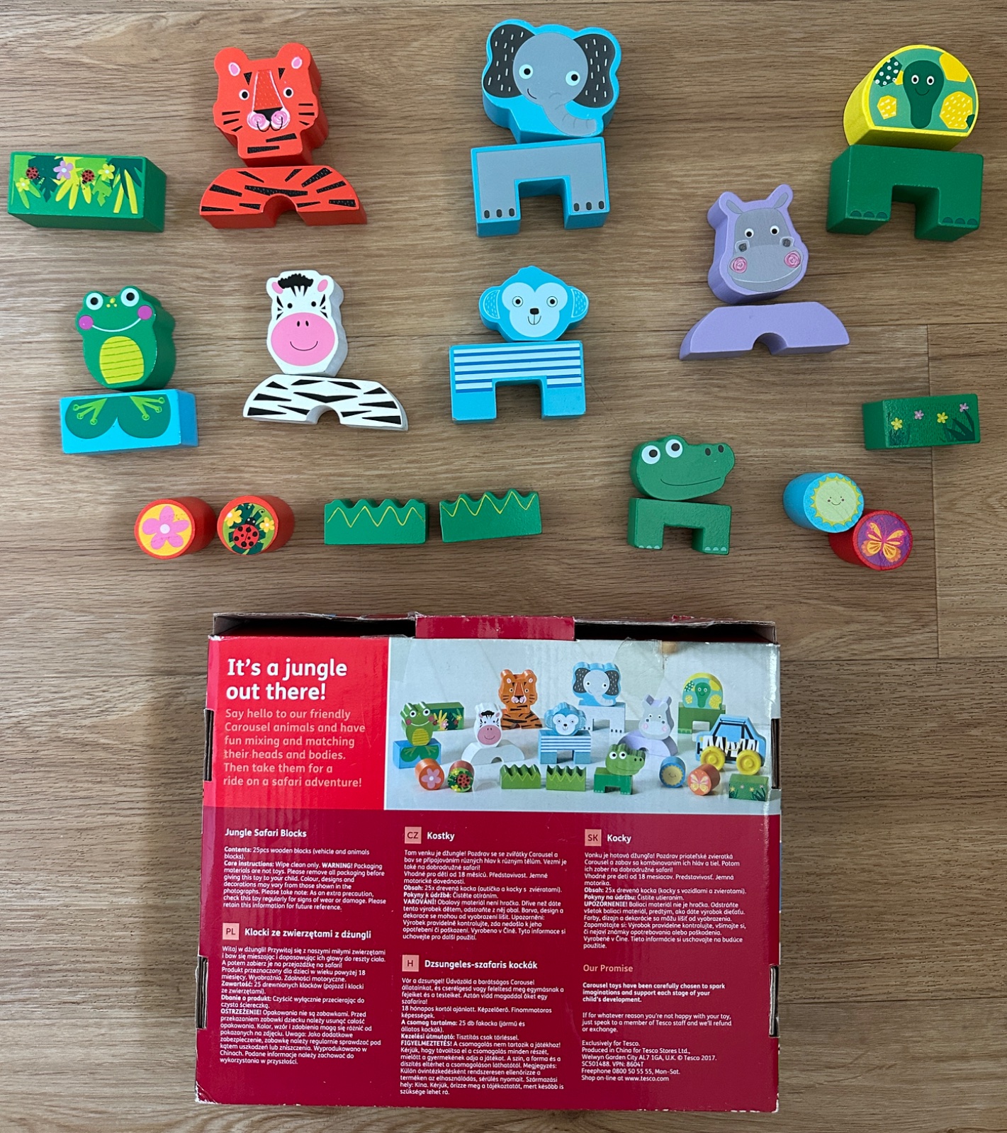 Vitajte v džungli!Pozdravte naše milé zvieratá a bavte sa miešaním a prispôsobovaním ich hlavičiek zvyšku tela.A potom ich vezmite na prechádzku na safari!Výrobok je určený pre deti staršie ako 18 mesiacov.Produkt rozvíja motorické schopnosti a predstavivosť dieťaťa.