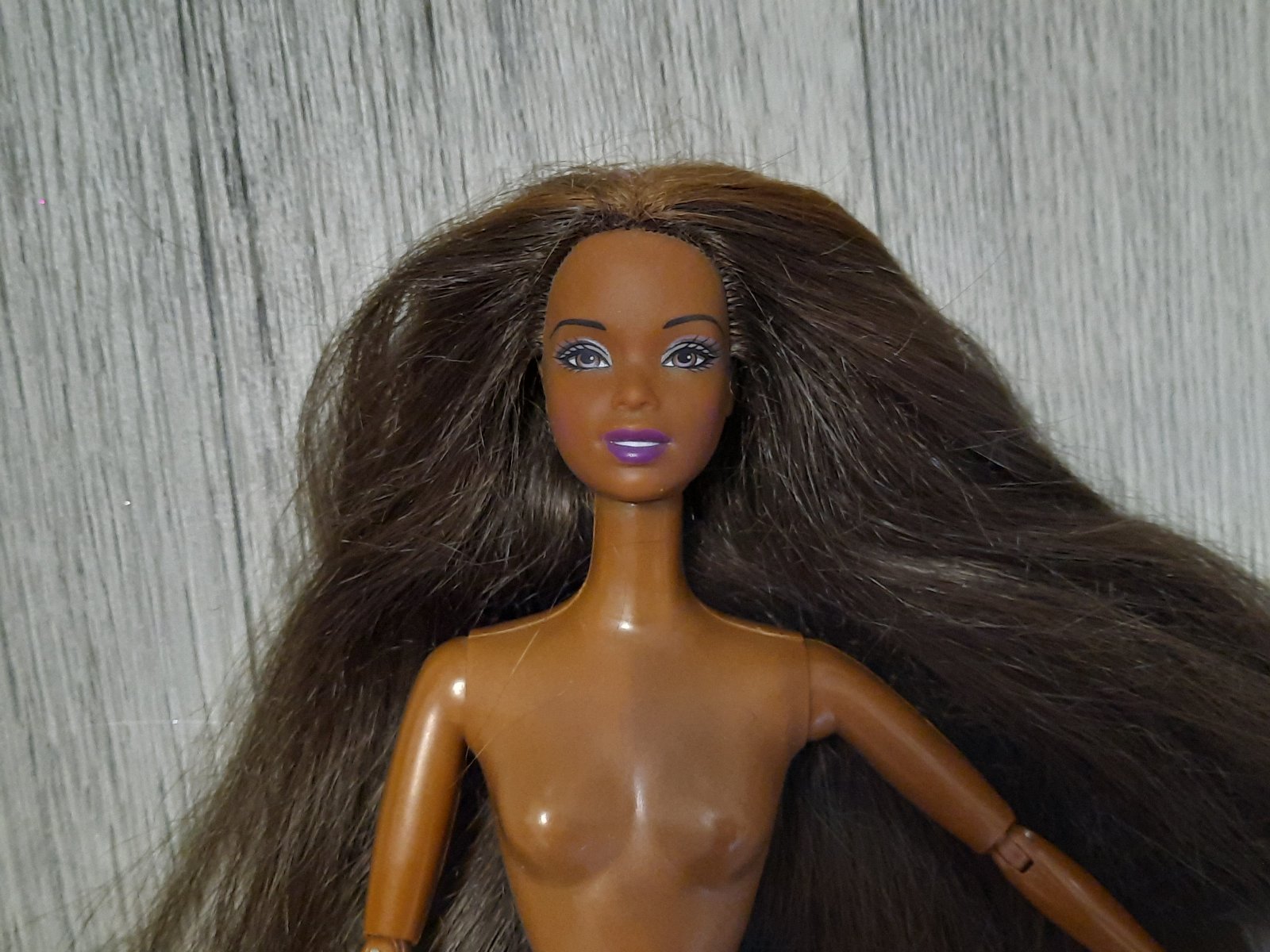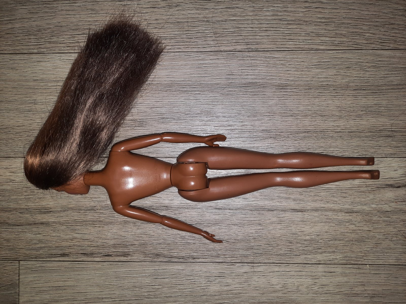 Barbie černoška s krásnymi hustými vlasmi. Keď sa zohýba v páse, bábika ssama otáča hlavu doprava a doľava. Nohy má gumené, je ohybná v kolenách, upaží ruky.