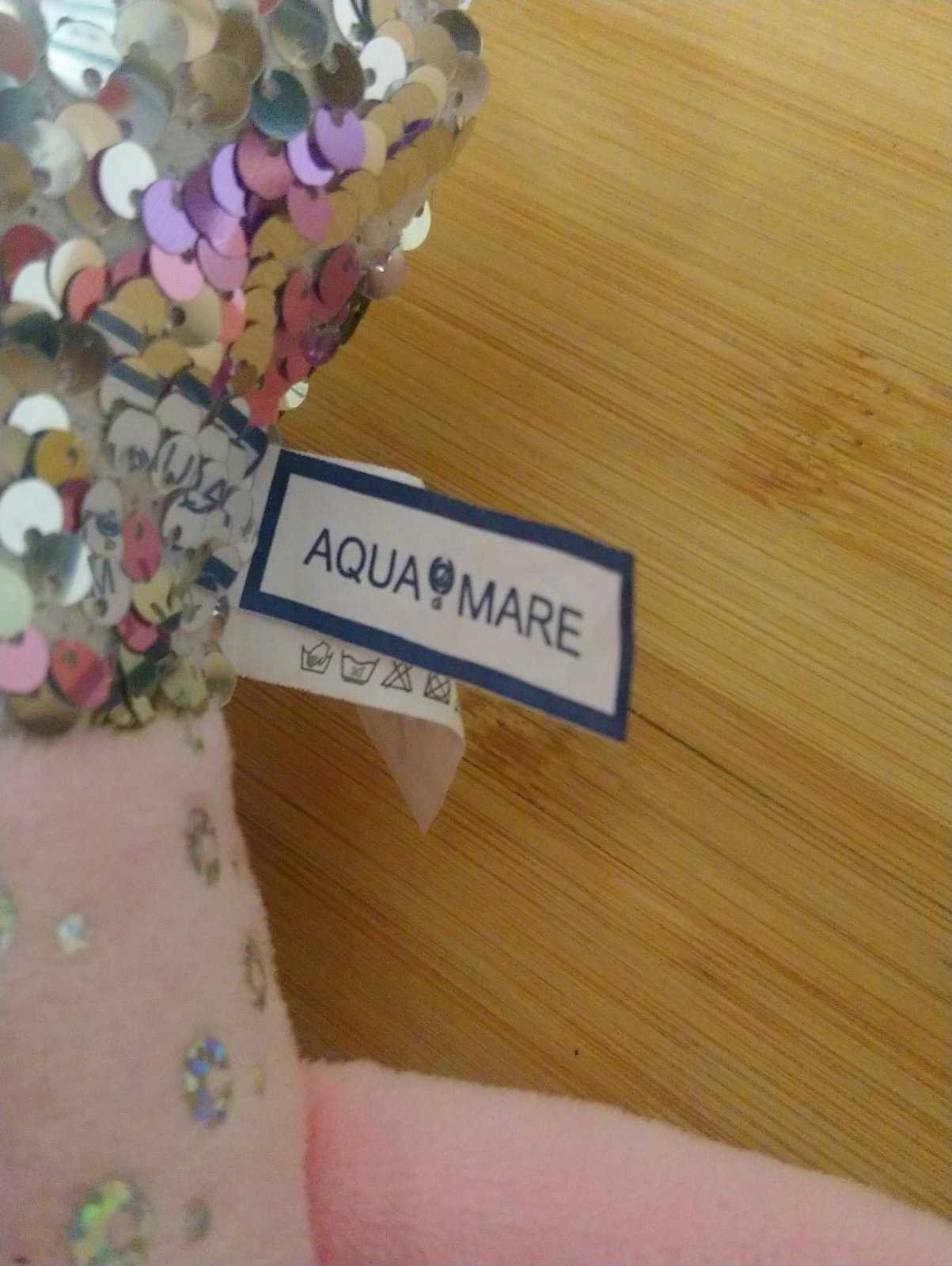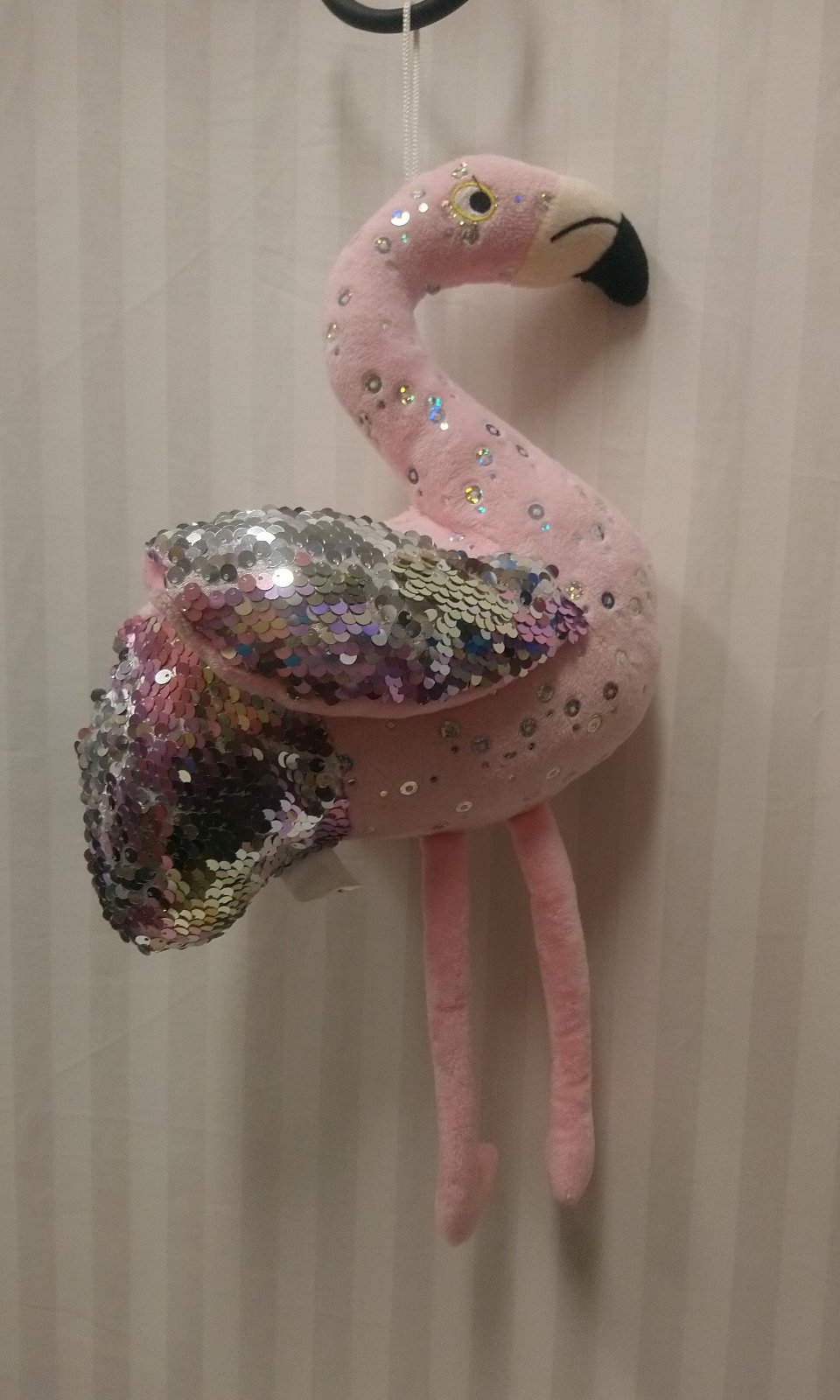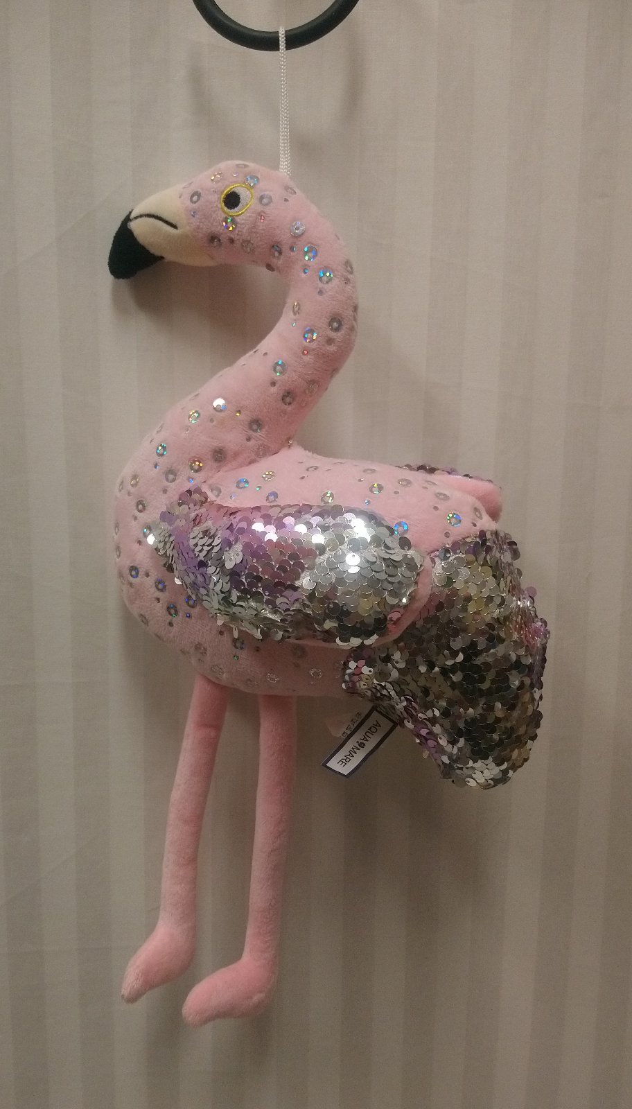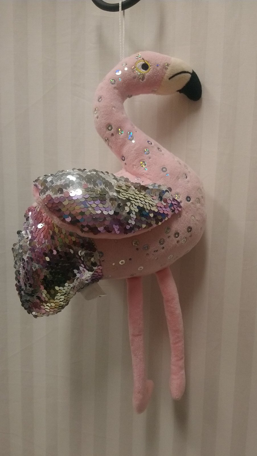 Plyšový Plameniak s flitry, zvukom, Aqua mare, má na hlave putko na zavesenie, pri stlačení telíčka vydáva pelikánsky zvuk, cmuk a hovorí I love you - milujem ťa,