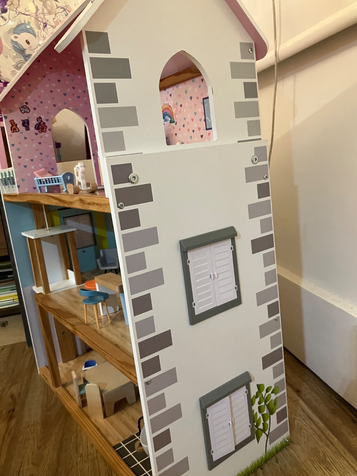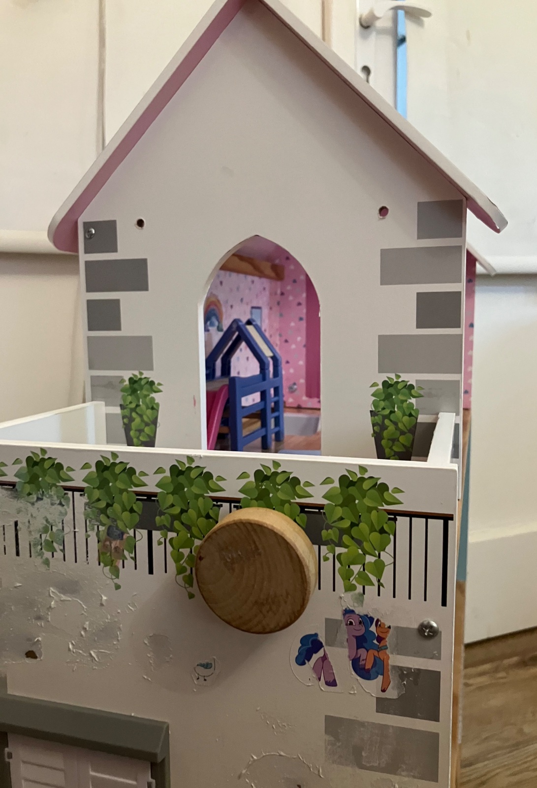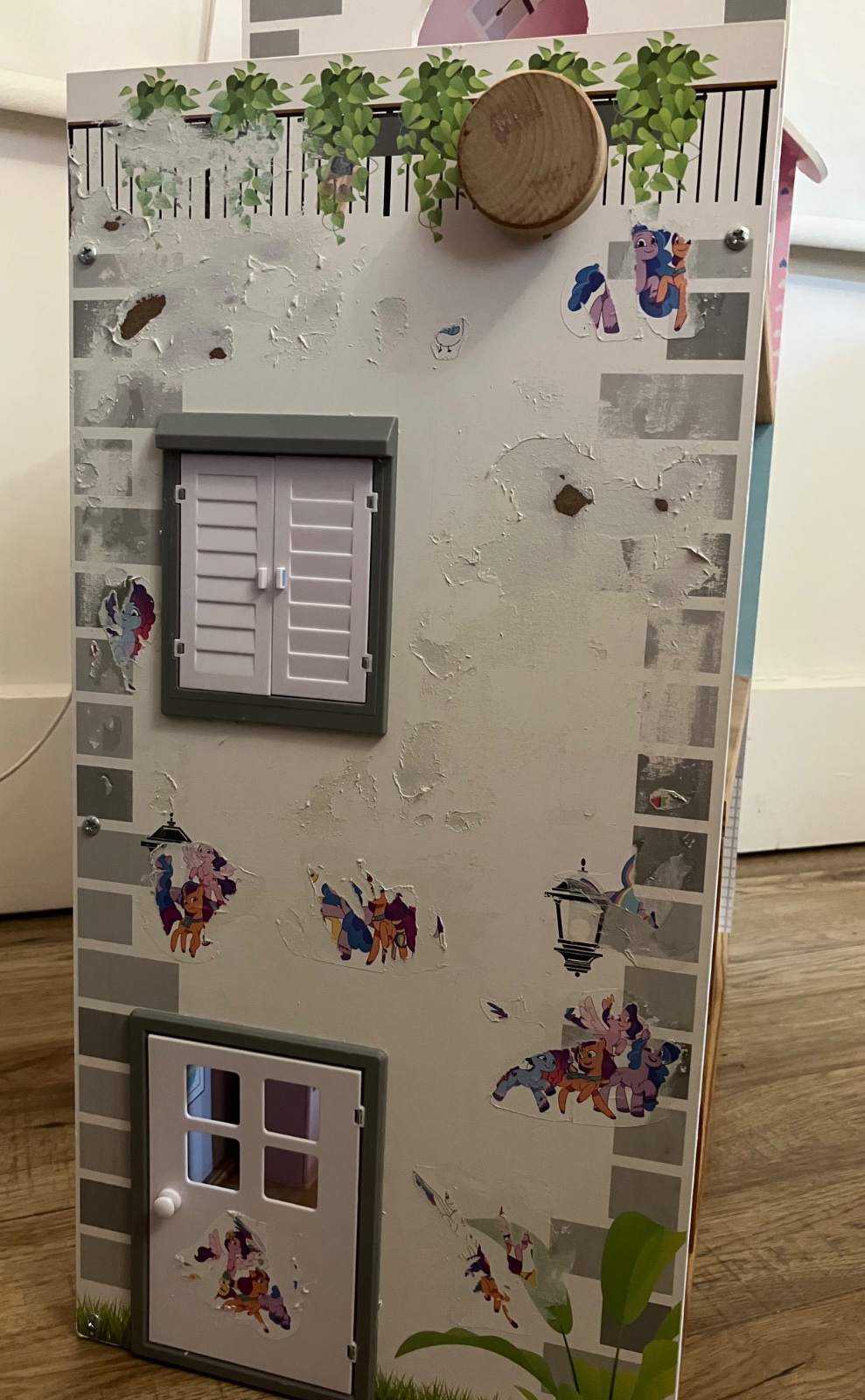 Predám drevený používaný domček pre bábiky (figúrky). Súčasťou domčeka je aj zariadenie. Domček má známky používania, hlavne od nálepiek, ktoré nechceli ísť dole a došlo k poškodeniu náteru. Nie je to prekážka k ďalšiemu používaniu/ hraniu sa s domčekom. Jedna strana viď.na foto. Je to zohľadnené v cene. Cena nového sa pohybuje od 50€ vyššie. Nejaký šikovný kutil si s tým poradí a opraví , poprípade prerobí podľa predstáv. Domček má potenciál prerábky poďla vlastnej fantázie (doplnenie osvetlenia, zvukov, zmena maľovky a pod. Osobný odber Košice - Staré mesto.