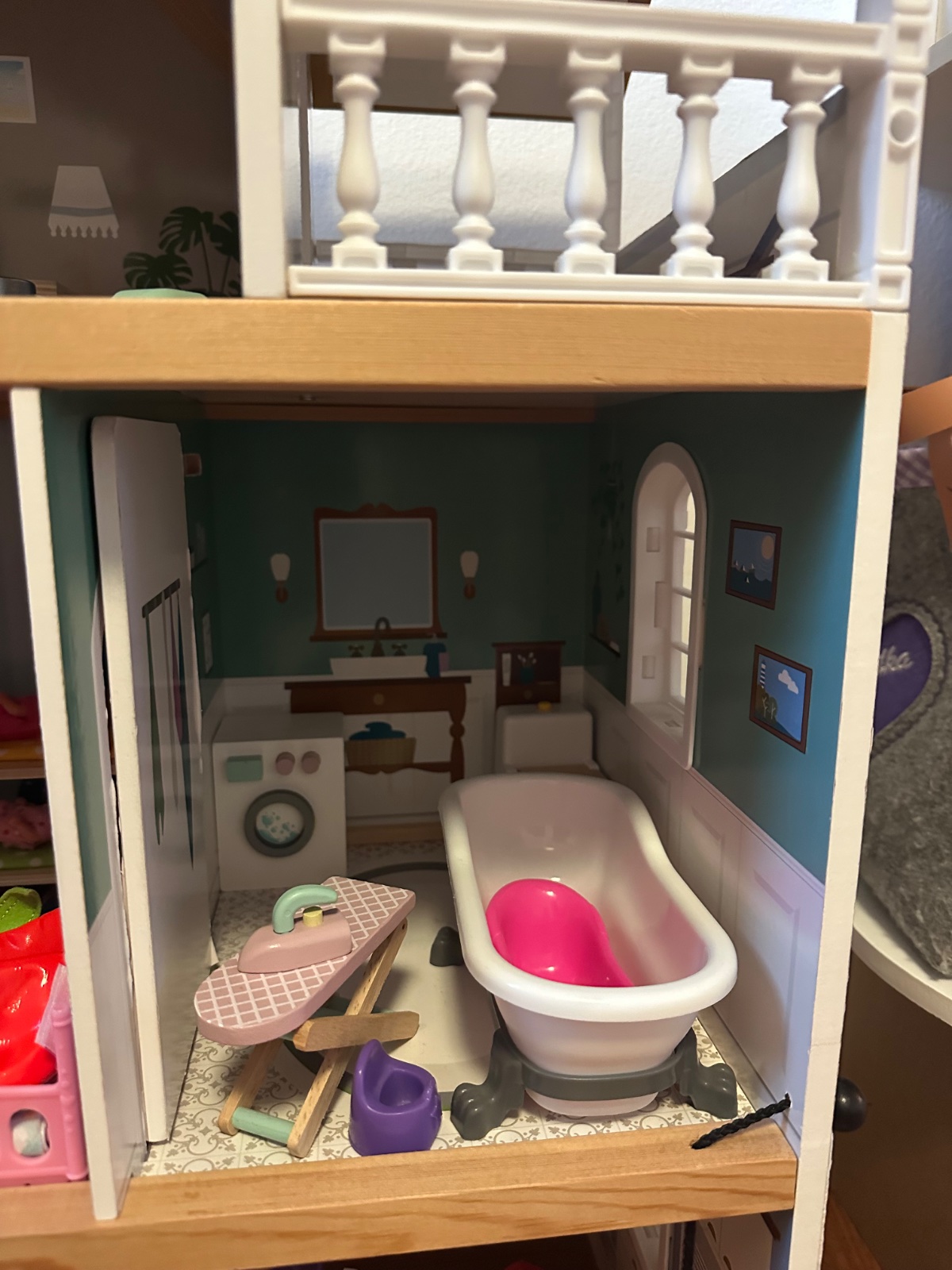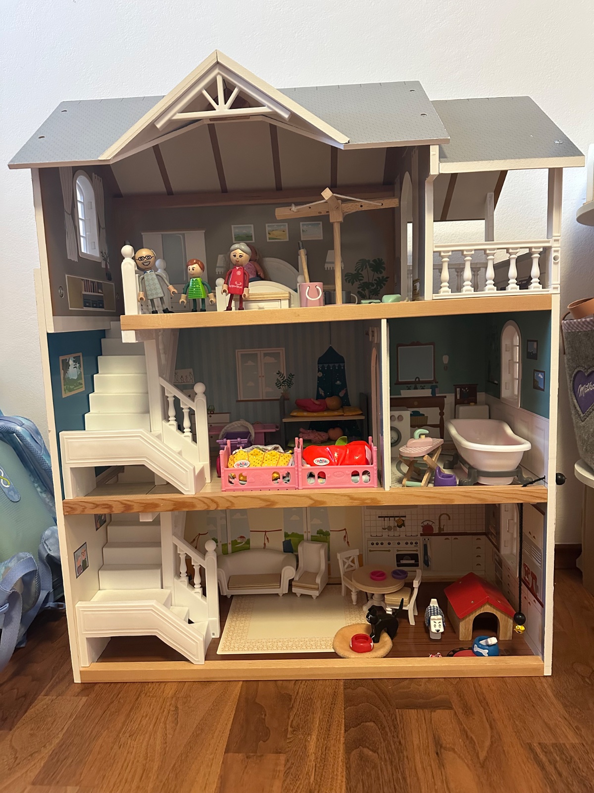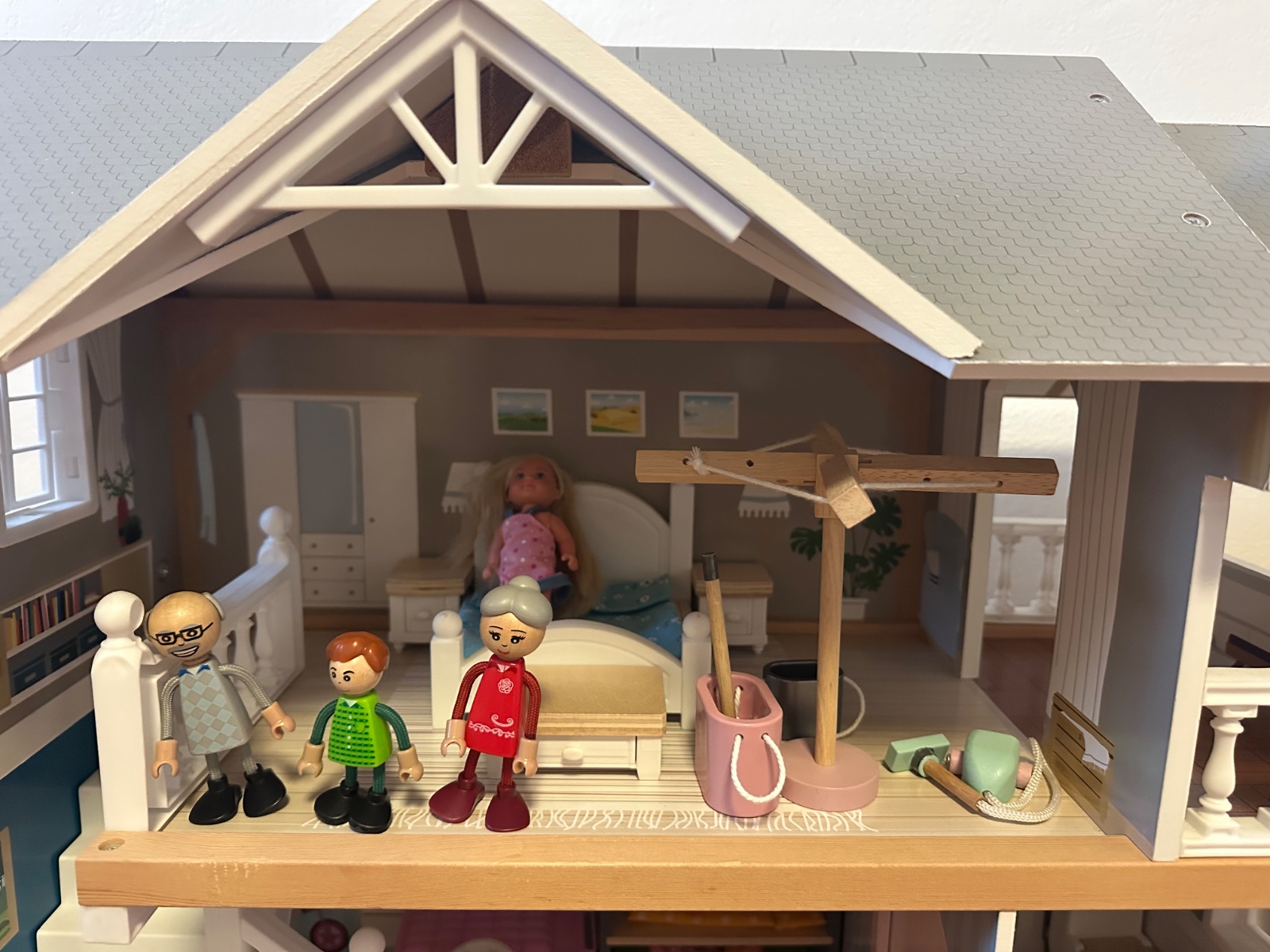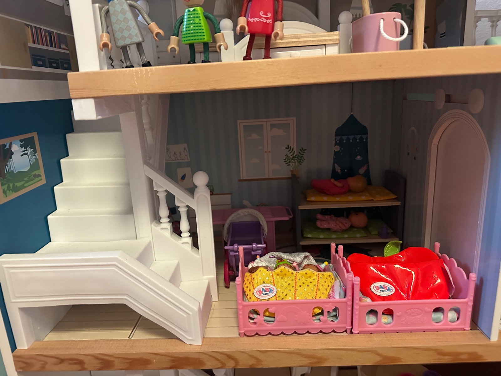 Predam krasny domcek pre babiky Small Foot v top stave. Male poskodenie na streche bolo od novoty. Sucastou je velke mnozstvo prislusenstva ako je pracka, zehliaca doska, vysavac, mop na dlazku, zvieratka, babiky, postele s perinami… Iba osobny odber BA.