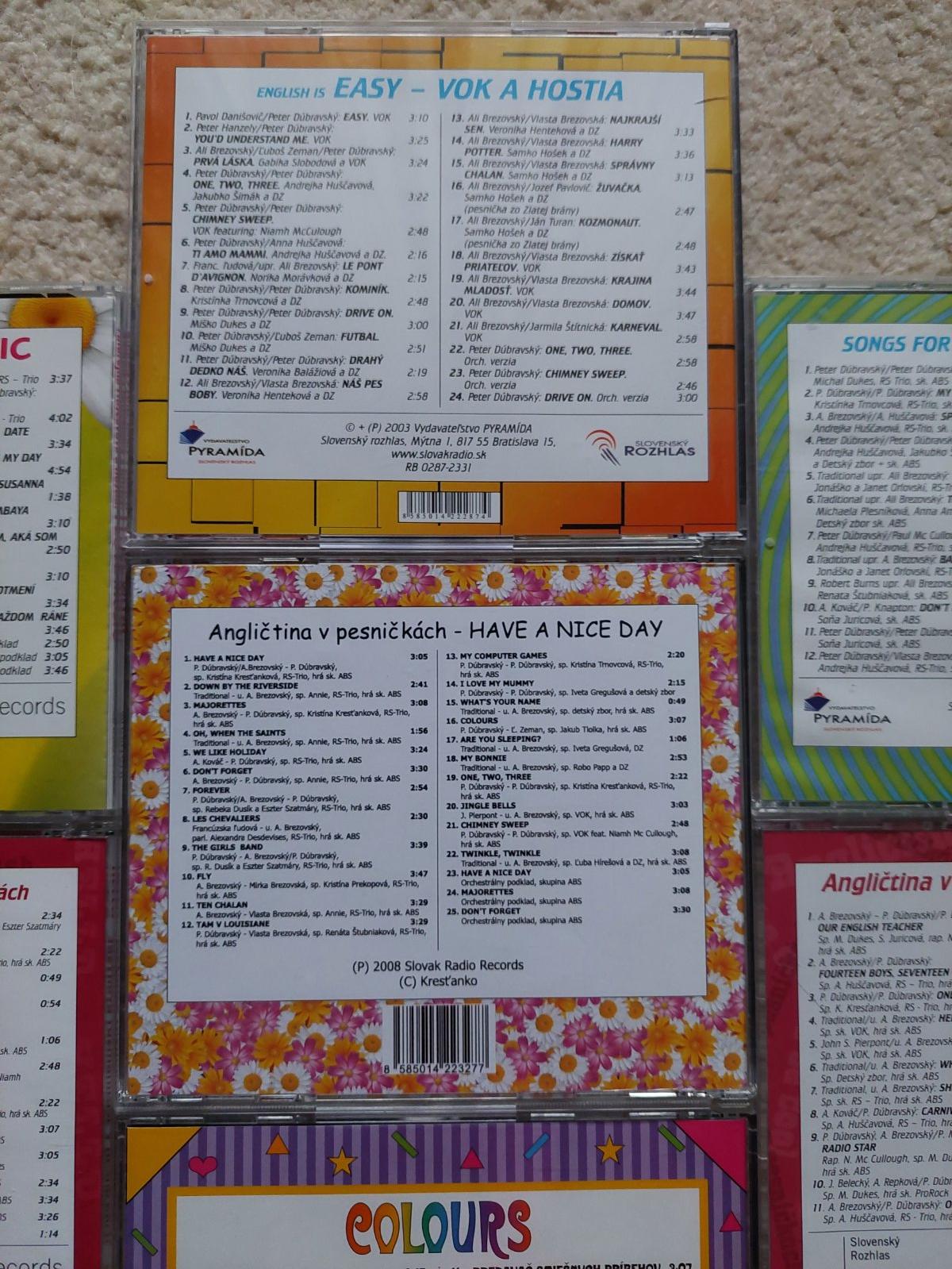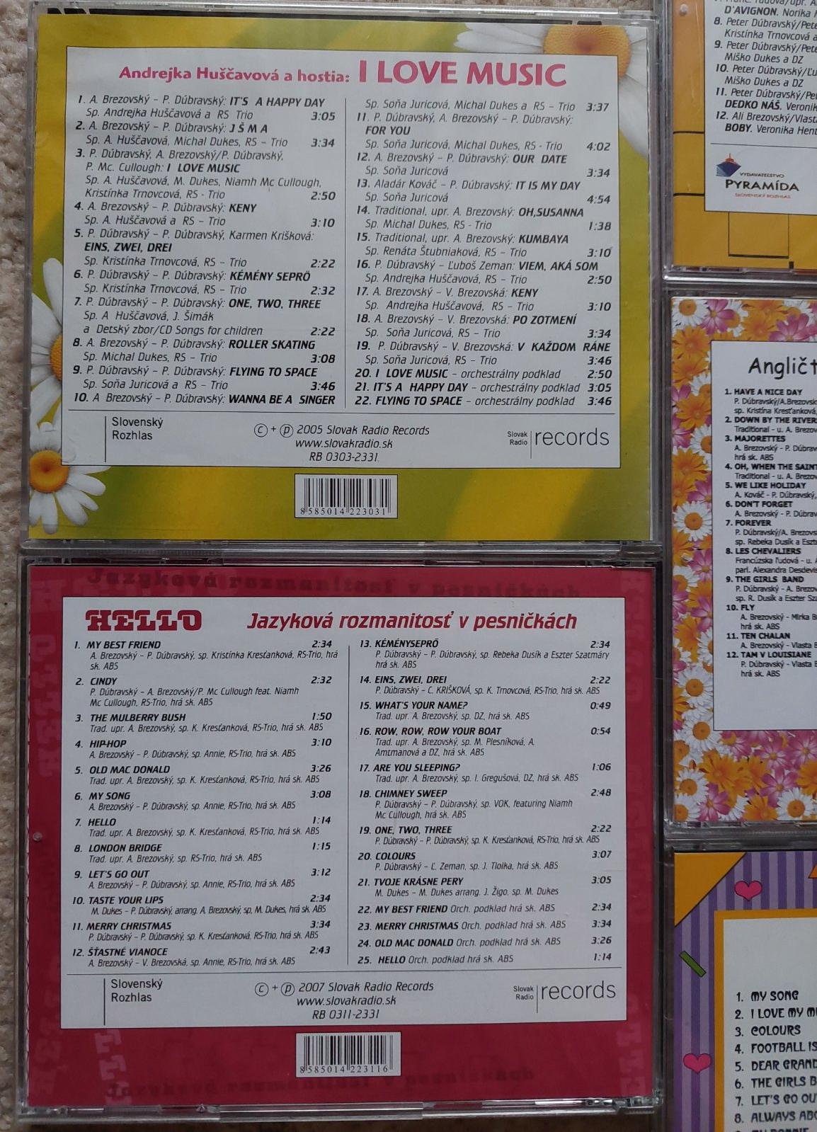 Predam 7 ks malo počúvanych a nesposkodenych CD na výučbu ANJ pre deti formou pesniciek. CD sú z dielne p. Vojtecha Krestanka a jeho jazykového projektu Anglictina v Pesničkách. Nahrávanie boli v Slovenskom rozhlase. Predaj spolu a cena je spolu. K cene + posta alebo osobny odber v Petržalke.